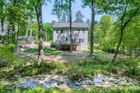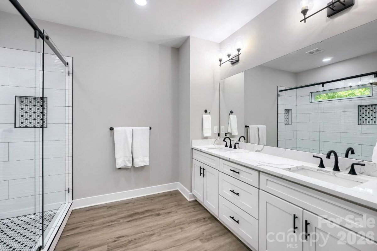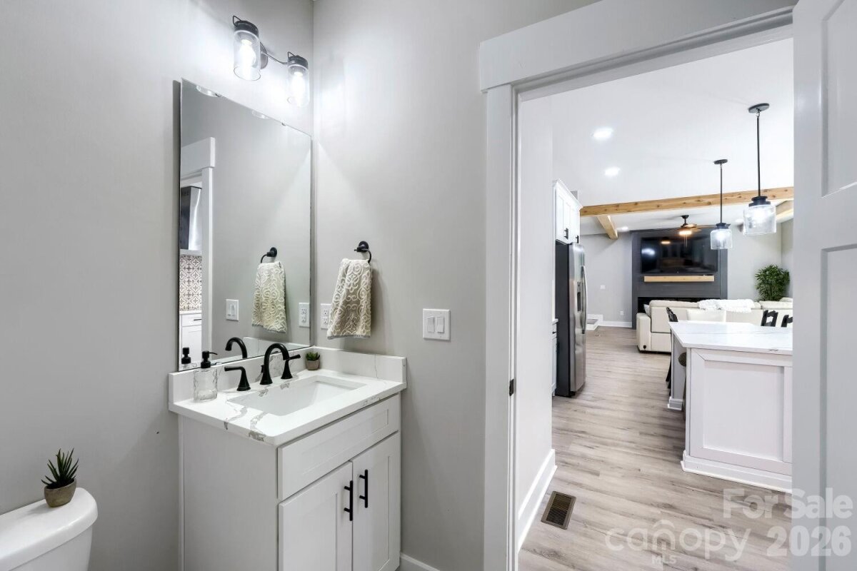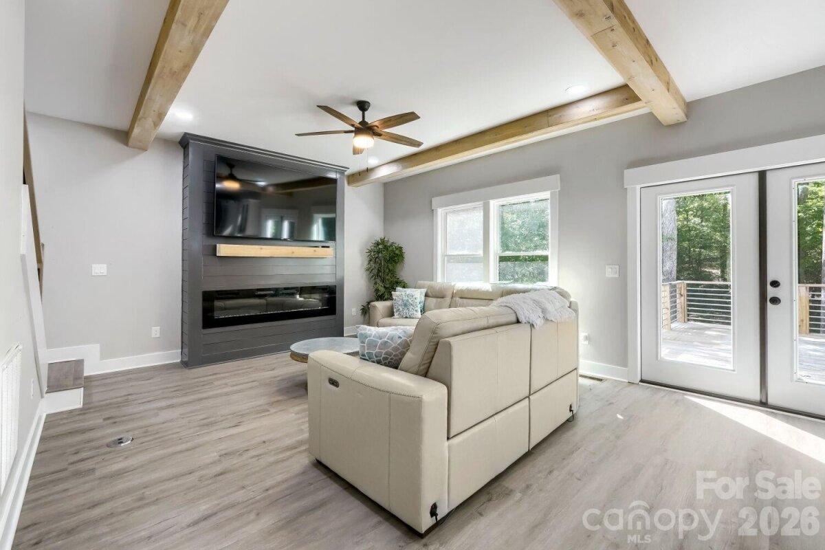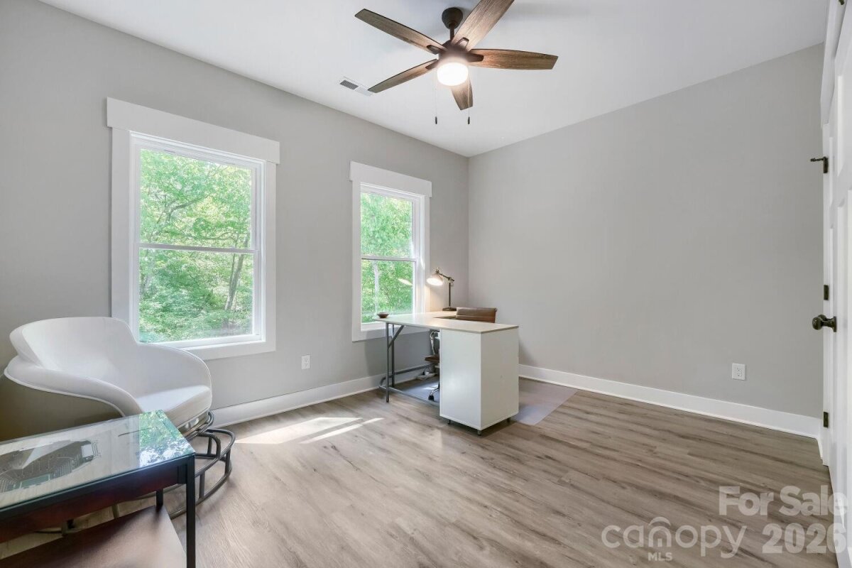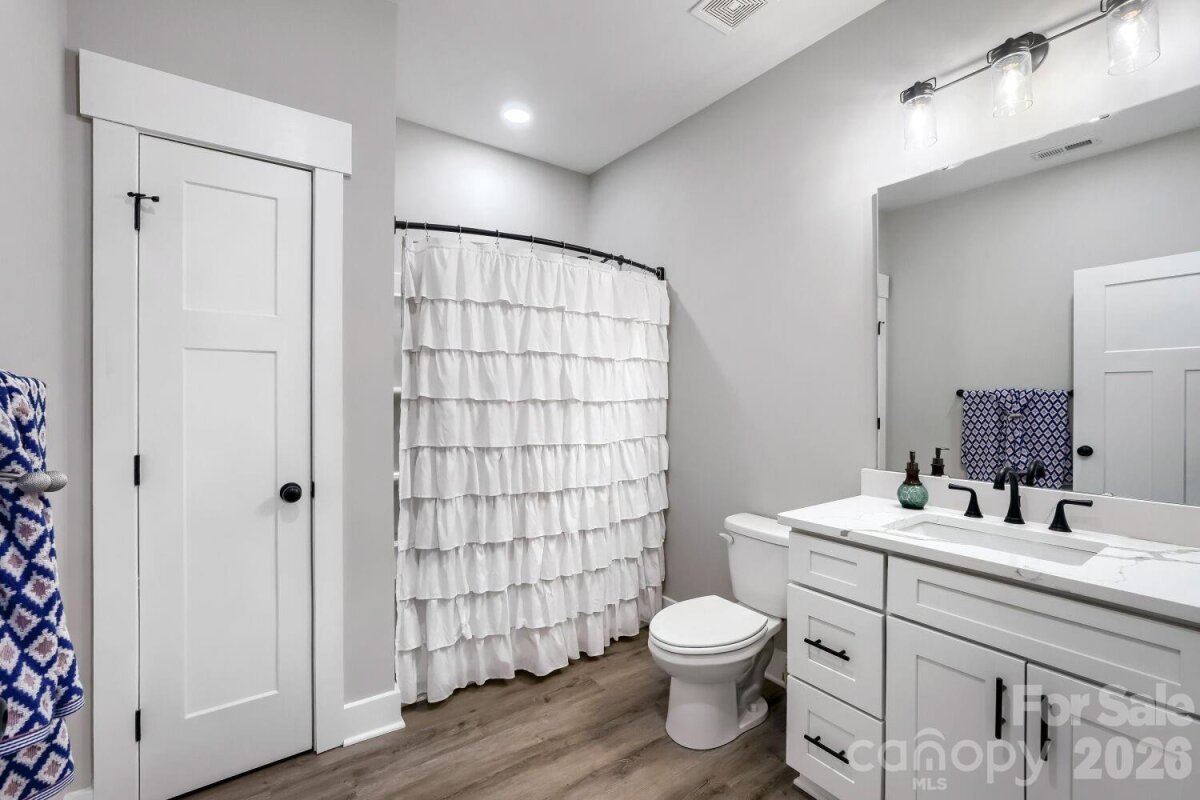 Welcome to this stunning farmhouse-style retreat nestled on just under an acre of nature lover's paradise — complete with a wooded backyard, babbling creek, and the kind of privacy that's nearly impossible to find. From the moment you arrive, the charcoal board-and-batten exterior, covered front porch, and landscape lighting set the tone for what awaits inside. Step through the foyer, and you're immediately greeted by a thoughtfully designed first floor featuring laminate wood flooring throughout. A private office off the foyer with double French doors is tucked away from the main living areas, making it ideal for remote work or a quiet retreat. The open-concept great room impresses with soaring natural wood ceiling beams, an electric fireplace framed in shiplap, recessed lighting, and a wall of windows overlooking the lush wooded backyard — all flowing seamlessly into the kitchen. The kitchen is an absolute showstopper and the heart of this home. White shaker cabinets with glass-front uppers are paired with a dramatic artisan tile backsplash, quartz countertops, and a large custom island with seating. A ceramic farmhouse sink is centered under a window with backyard views, and the stainless steel appliance package includes double wall ovens, an electric cooktop, a dishwasher, and a microwave. Pendant and recessed lighting, black hardware, and an oversized pantry with a built-in butler's pantry — perfectly styled as a coffee bar — complete this chef's dream space. The informal dining area features a built-in table with a quartz countertop connected to the island, plus French doors that open to the impressive 20x20 deck with cable railing, overlooking a stunning canopy of mature trees and the creek below. Whether you're sipping morning coffee or entertaining at sunset, this outdoor space is pure magic. Also on the main level is a stylish powder room with a quartz vanity and black fixtures. The finished attached two-car garage features epoxy flooring, a MyQ smart opener, recessed lighting, and extra storage. Upstairs, the spacious landing leads to four well-sized bedrooms, all with laminate wood flooring and ceiling fans. The primary suite offers a large walk-in custom closet and a spa-quality ensuite with a double quartz vanity, black fixtures, and an oversized walk-in tile shower with wave-texture wall tile, dual niches, mosaic floor tile, and a window that brings the outdoors in. Three additional bedrooms are generously sized — each with laminate wood flooring and ceiling fans — with one bedroom offering peaceful wooded views through dual windows. All three are served by a well-appointed hall bath with quartz vanity, black fixtures, and a tub/shower combo. A laundry room that redefines the standard — white cabinetry, quartz countertop, artisan tile backsplash, floating wood shelf, and a window. Exterior extras include black gutters, landscape lighting, an extra parking pad, and a creek-side backyard that truly cannot be replicated. And the location? Better than you'd expect. Less than 10 miles to Lake Tillery, under 4 miles to Uwharrie Vineyards, ~3 miles to Downtown Albemarle — Goody Shop Cafe, Connie's Coffee and Cafe, Five Points Public House, Albemarle Sweet Shop & more. Catch summer baseball with the local Wampus Cats at Don Montgomery Park, and within about an hour of Uptown Charlotte. This one is special — and homes like this don't come around often in this area.