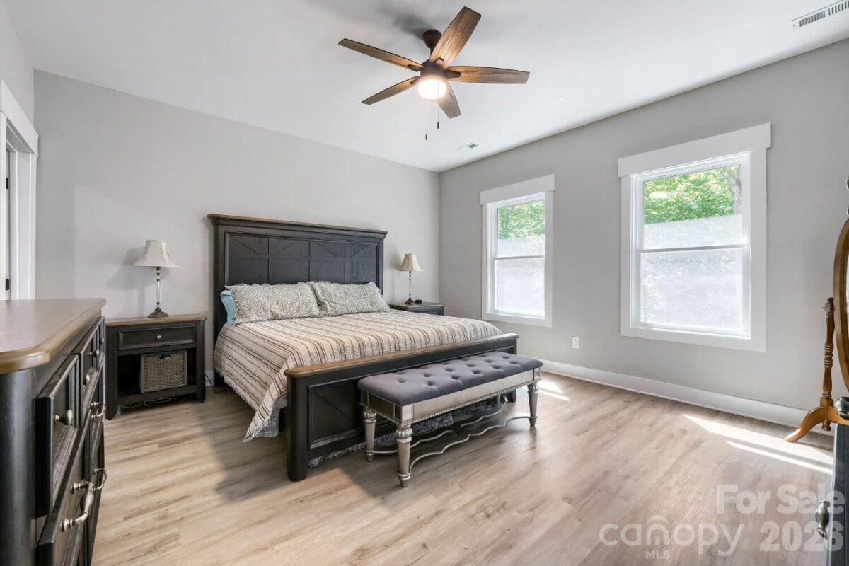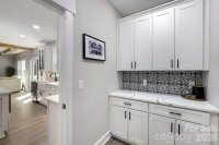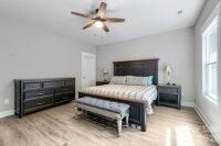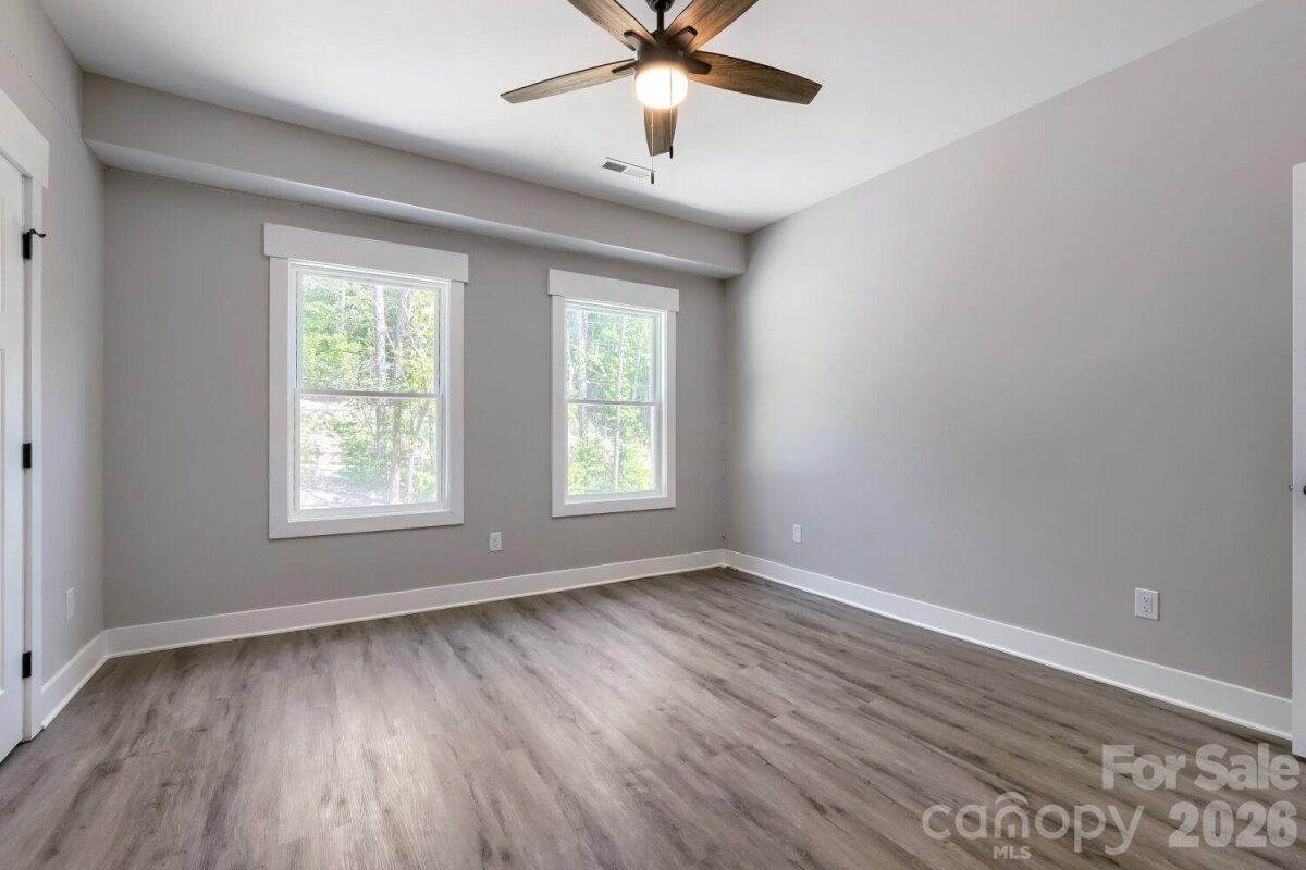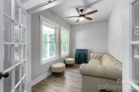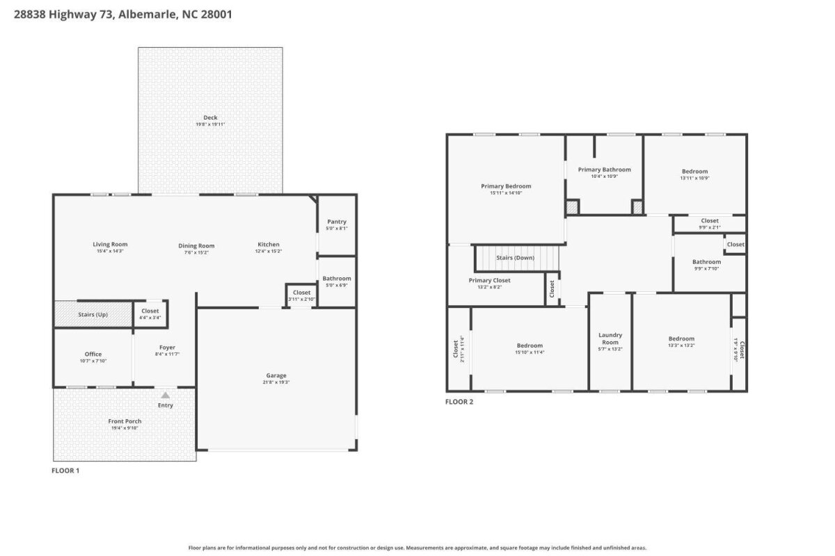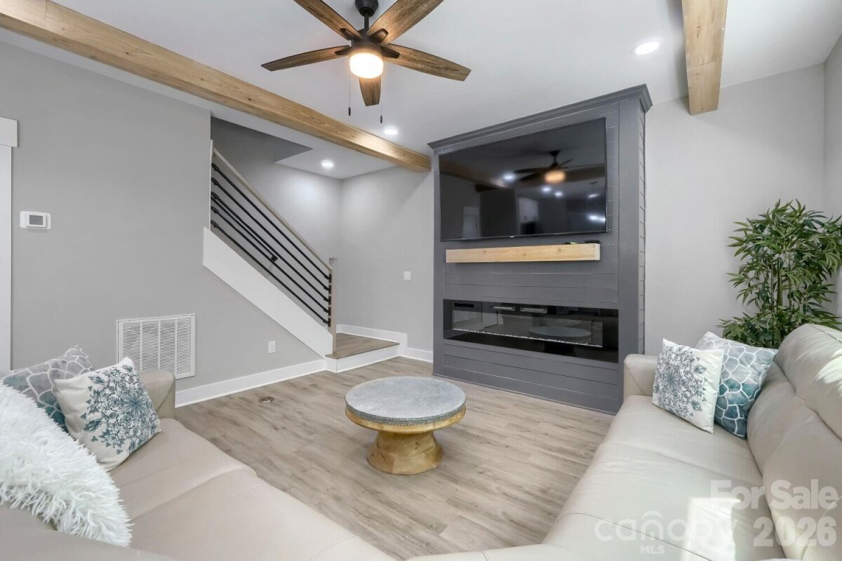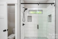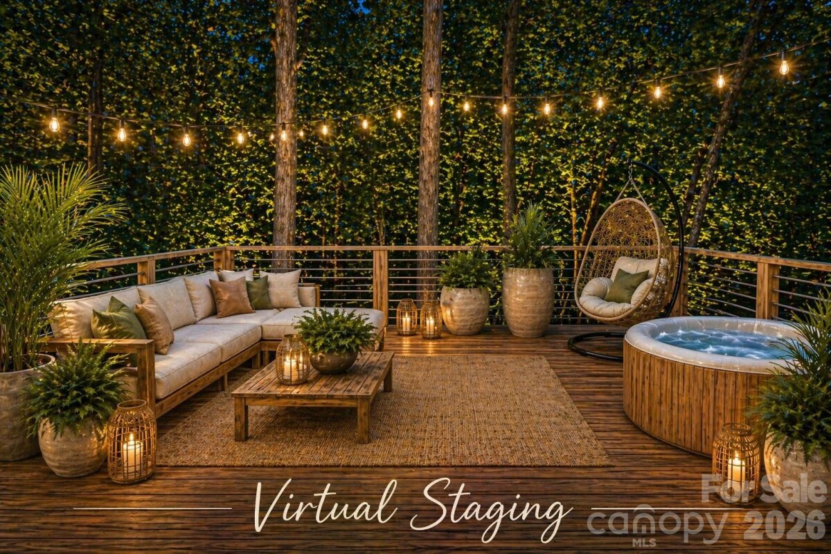 Welcome to this stunning farmhouse-style retreat nestled on just under an acre of nature lover's paradise — complete with a wooded backyard, babbling creek, and the kind of privacy that's nearly impossible to find. From the moment you arrive, the charcoal board-and-batten exterior, covered front porch, and landscape lighting set the tone for what awaits inside. Step through the foyer, and you're immediately greeted by a thoughtfully designed first floor featuring laminate wood flooring throughout. A private office off the foyer with double French doors is tucked away from the main living areas, making it ideal for remote work or a quiet retreat. The open-concept great room impresses with soaring natural wood ceiling beams, an electric fireplace framed in shiplap, recessed lighting, and a wall of windows overlooking the lush wooded backyard — all flowing seamlessly into the kitchen. The kitchen is an absolute showstopper and the heart of this home. White shaker cabinets with glass-front uppers are paired with a dramatic artisan tile backsplash, quartz countertops, and a large custom island with seating. A ceramic farmhouse sink is centered under a window with backyard views, and the stainless steel appliance package includes double wall ovens, an electric cooktop, a dishwasher, and a microwave. Pendant and recessed lighting, black hardware, and an oversized pantry with a built-in butler's pantry — perfectly styled as a coffee bar — complete this chef's dream space. The informal dining area features a built-in table with a quartz countertop connected to the island, plus French doors that open to the impressive 20x20 deck with cable railing, overlooking a stunning canopy of mature trees and the creek below. Whether you're sipping morning coffee or entertaining at sunset, this outdoor space is pure magic. Also on the main level is a stylish powder room with a quartz vanity and black fixtures. The finished attached two-car garage features epoxy flooring, a MyQ smart opener, recessed lighting, and extra storage. Upstairs, the spacious landing leads to four well-sized bedrooms, all with laminate wood flooring and ceiling fans. The primary suite offers a large walk-in custom closet and a spa-quality ensuite with a double quartz vanity, black fixtures, and an oversized walk-in tile shower with wave-texture wall tile, dual niches, mosaic floor tile, and a window that brings the outdoors in. Three additional bedrooms are generously sized — each with laminate wood flooring and ceiling fans — with one bedroom offering peaceful wooded views through dual windows. All three are served by a well-appointed hall bath with quartz vanity, black fixtures, and a tub/shower combo. A laundry room that redefines the standard — white cabinetry, quartz countertop, artisan tile backsplash, floating wood shelf, and a window. Exterior extras include black gutters, landscape lighting, an extra parking pad, and a creek-side backyard that truly cannot be replicated. And the location? Better than you'd expect. Less than 10 miles to Lake Tillery, under 4 miles to Uwharrie Vineyards, ~3 miles to Downtown Albemarle — Goody Shop Cafe, Connie's Coffee and Cafe, Five Points Public House, Albemarle Sweet Shop & more. Catch summer baseball with the local Wampus Cats at Don Montgomery Park, and within about an hour of Uptown Charlotte. This one is special — and homes like this don't come around often in this area.