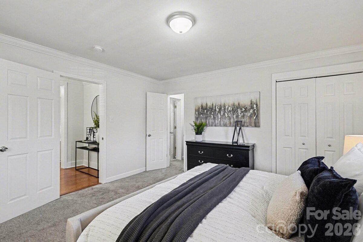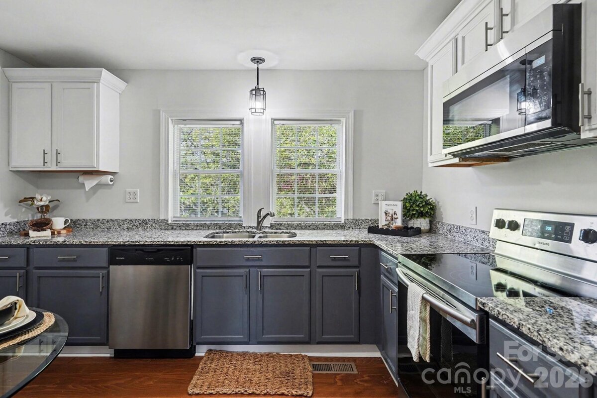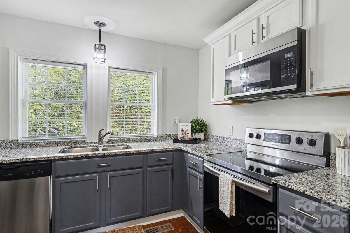 New in Old Town Cramerton- Enjoy walkable small-town living in the heart of Cramerton, just minutes from the trails, kayaking, biking, and outdoor recreation at Goat Island Park and Riverside Park. Local shops, dining, and community amenities are all within walking distance, and residents enjoy free admission to the community pool. This charming bungalow located on up and coming street features an expansive new front porch with accessible ramp creating rare **zero-entry access**. Inside, **fresh neutral paint throughout** and abundant **natural light** highlight beautiful engineered hardwood floors. The welcoming foyer opens to a spacious family room with an elegant tray ceiling that adds character while maintaining classic charm. The **large eat-in kitchen** offers plenty of cabinetry, **granite countertops**, and **stainless steel appliances** and pantry—perfect for everyday living or entertaining. Generous bedrooms provide excellent **closet space and storage**, including a coat closet, pantry, linen closet, laundry room and well-appointed bedroom closets—rare for homes of this style. Step outside to enjoy **private outdoor living** with a **fenced backyard and new deck**, ideal for relaxing or hosting friends. **Recent improvements include fresh interior paint, new gutters and fascia, front porch, back deck and a new crawlspace vapor barrier., home is termite bonded** . What more could you want? This home is move in ready!