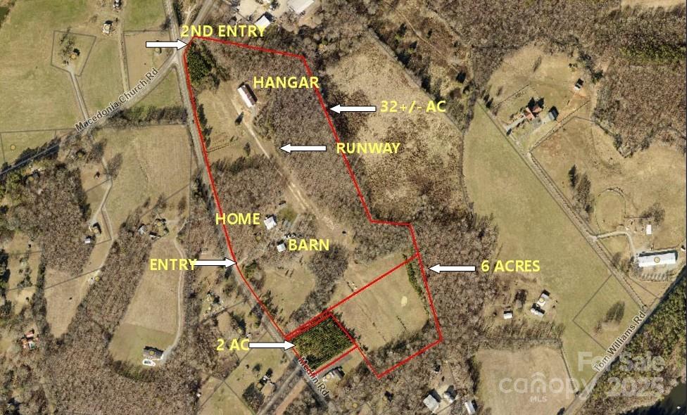 ONE OF A KIND - APPROVED PLANE RUNWAY - HANGAR - 6 STALL BARN- Wooded Private Drive Leads to 2014 Custom Built/Southern Farm House 1915sf Custom Kitchen- Lots of Custom Storage Cabinets, Stainless Farm Sink/Brazilian Granite Countertops- New Gas Cooking Stove. Central Open Room Plan Joins Great Room & Dining Area w/ Soaring 11"8" Ceiling. Split 3 Bedrooms - Lg Primary walks out to Patio- 2 Large Full Baths-each bath has 40 gallon Water Heater- Porcelain tile Shower- granite countertops - Mudroom w/Porcelain floor Stainless Sink- Gas Dryer - Extras - Central Vacuum- 250 watt Solar Panels - Reduce Electricity Costs. 3'wide hallways & Doors-3 zone HVAC, Central Rm/Primary Bedroom side/Guest Bedroom. Fenced Pastures, 6 bay-2017 Morton Barn w/24 watt solar panel, stall fans. Additional/2 Outbuildings, Feed & Wash bay-2nd used as Gym/Office. HUGE Airplane Hangar 3 Rolling Bay Doors 128 x 47 x 11'h with 200 Amp Service-Can Garage RV, Horse Trailers- Cars-Tractors, etc CALL LA for DETAILS SEE MLS 4326176 IF YOU WISH TO PURCHASE ONLY 30+/- acres with the airplane hanger and road access onto Macedonia Church Road. If MLS 4326176 is purchased prior to this listing - This listing will be amended or removed from market at owners discretion.