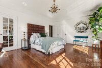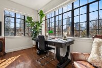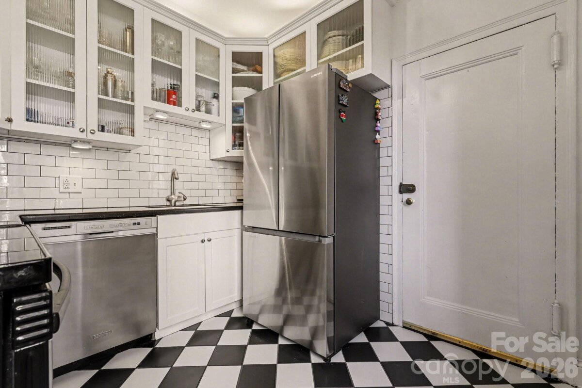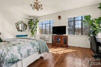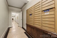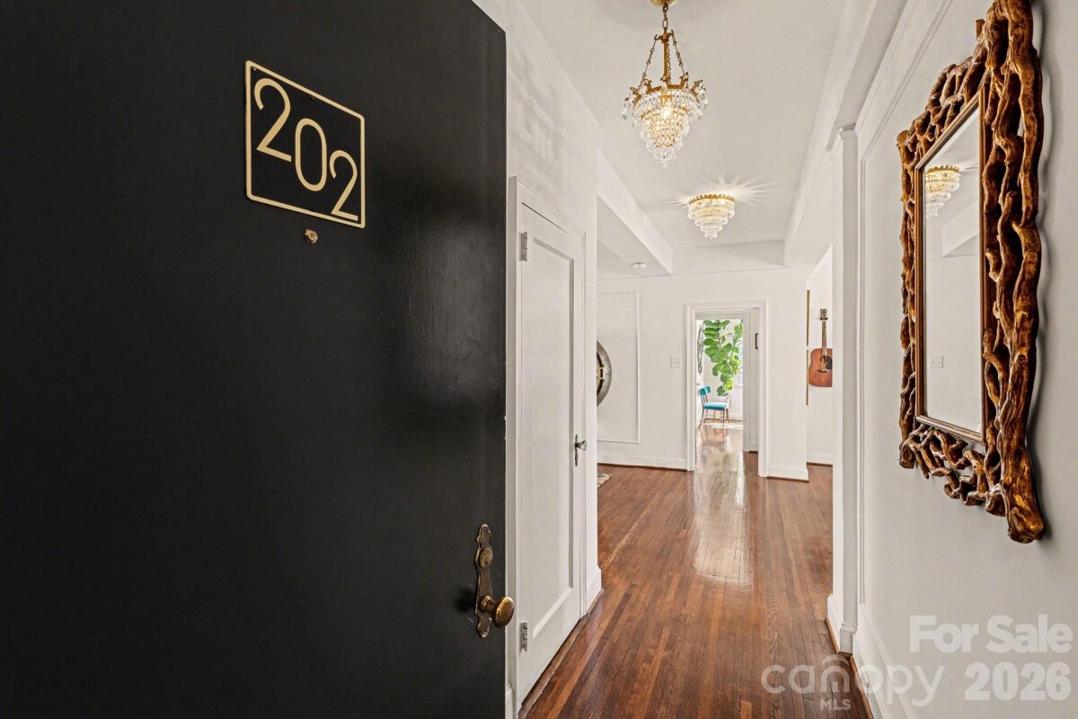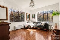 Inspired by the refined allure of a classic Manhattan pre-war residence, this sophisticated home in Uptown Charlotte seamlessly blends historic character with elevated modern updates. Situated in the heart of Fourth Ward, The Poplar offers a secured entance, grand lobby, elevator service and gated parking lot. The residence is bright & light-filled, showcasing breathtaking city skyline views, gleaming original hardwood floors, soaring ceilings with original plaster detailing, and curated designer finishes that create an elegant, timeless atmosphere. A gallery-style entry hall, ideal for art display, flows effortlessly into a gracious living room with skyline views anchored by a stunning decorative fireplace with custom built-ins, original wall sconces and enhanced by a charming bay window, creating an inviting space for both refined entertaining and everyday living. Across the gallery is a generously sized dining room with a courtyard view offering an elegant setting ideal for entertaining. The updated & well-appointed kitchen features tile flooring, white cabinetry, hard-surface countertops, subway tile backsplash, under-cabinet lighting, stainless steel appliances, including a NEW refrigerator and over-the-range microwave, plus a window that fills the space with natural light. Just off the living room, French doors reveal a spacious and versatile primary bedroom, featuring large windows, an abundance of natural light and city skyline views.  The updated, spa-inspired bath showcases original tiled flooring, a NEW glass shower enclosure, a new vanity, and satin brass fixtures. The secondary bedroom, with a city skyline and courtyard views, provides flexible use as an office, den, or guest room. Custom window shades in every room. Residents of The Poplar enjoy boutique amenities including a rooftop entertaining deck (currently being enhanced with a new roof), a gated garden courtyard, secure parking, a private basement storage unit, and on-site laundry. Great neighborhood and excellent location...walk to everything Uptown Charlotte has to offer.