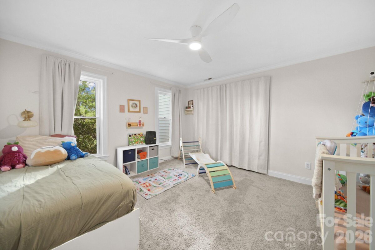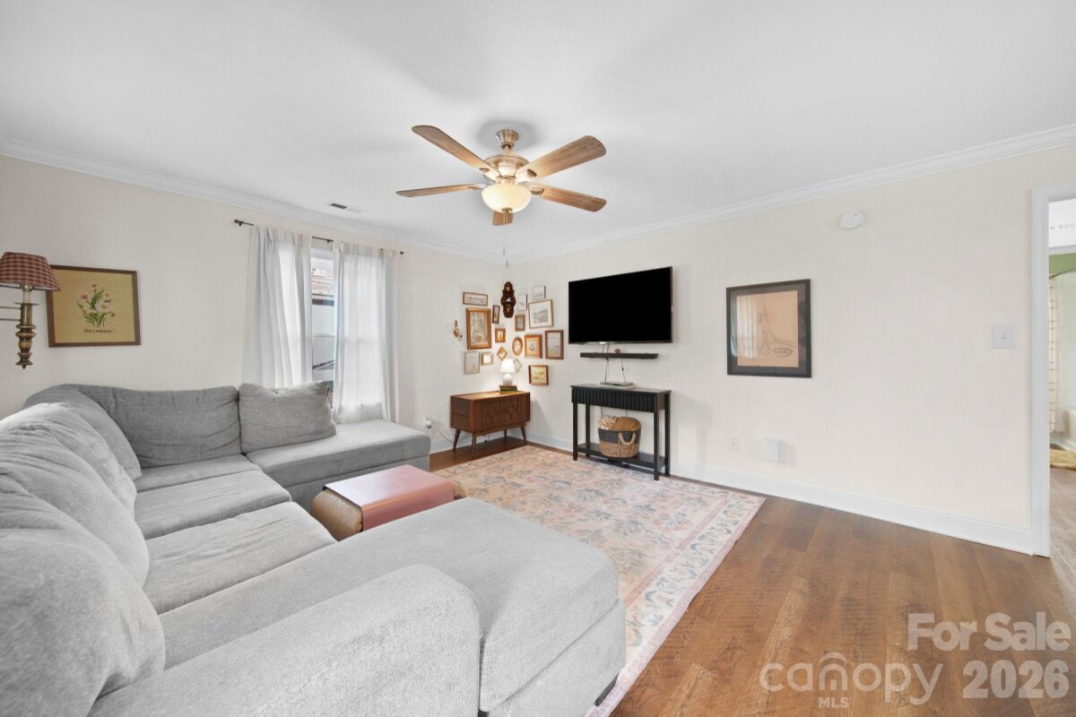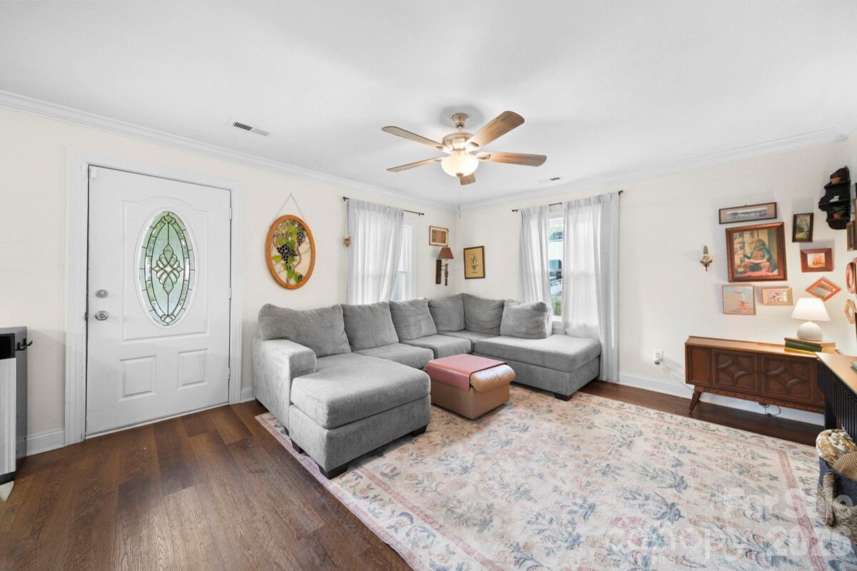 Come tour this charming ranch home near the heart of downtown Mooresville! This home features a front white picket fence, an inviting front porch, with an additional covered side porch. Upon entering enjoy an open concept living room, kitchen, and dining room. The kitchen features granite countertops and stainless steel appliances. The bedroom floorpan is split with the primary suite on one side and two bedrooms on the other side. The primary bedroom is spacious with an attached bathroom, walk in closet, and features a fireplace in the bedroom. Outside enjoy the large flat backyard with a fire pit great for entertaining, also features a shed for additional storage. The home is located on a quiet street. The owners recently replaced 8 of the windows in the home. Home is located in desirable Mooresville Graded School District.
