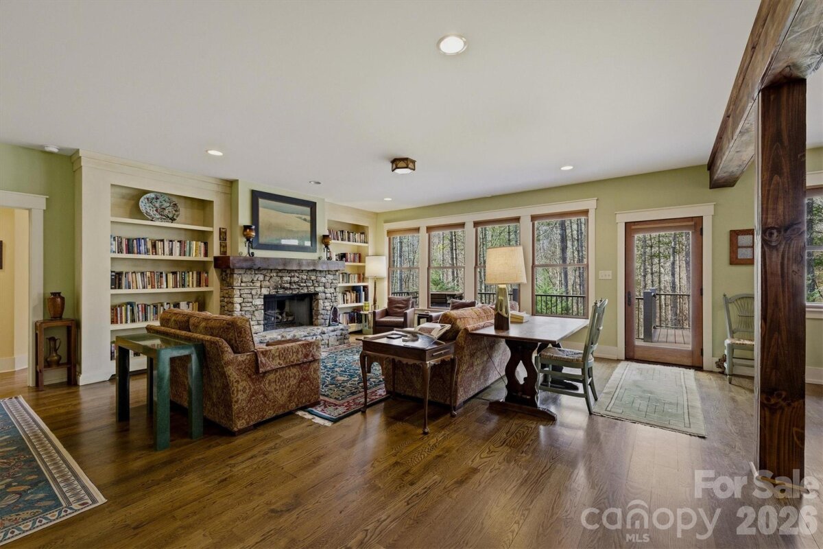 Timeless craftsmanship blended with gracious Lake James community living—that’s how we describe this home. The setting is wooded and private, near the 1780 Community pond and the trails of Hully Gully, which allow you to walk down to the lakeshore or Camp Lake James in minutes. This spacious home is functional for full-time living, but it’s also allowed to be a short term rental with significant income potential. It has a large kitchen with custom cabinetry, gas range, wine cooler, granite countertops and a large quartzite island. The downstairs living area has wide-planked hardwood floors and a stone fireplace with vented gas logs, custom bookcases and arts and crafts style details. The living area also leads to a custom screened porch with cathedral tongue and groove ceiling, wood fireplace and stone chimney. A charming reading nook under the staircase provides a peaceful escape, while also serving as a twin bed for a guest. The extra large primary bedroom suite has hardwood floors that flow into a private sunroom. It includes a private deck and a walk-in closet. The primary bathroom has tile floor, walk-in tile shower, water closet, independent sink vanities with granite tops and custom drawers for linens and towels. Upstairs, you’ll find two large bedrooms separated by a cozy media den and a jack and jill bathroom. Each bedroom has two built-in twin beds and is also roomy enough for a king-sized bed. Spacious floored attic space is accessible through the bedrooms on both sides of the house. The front door entryway has a slate floor and a powder room. The breezeway entry is through a long tiled mudroom, which includes laundry, pantry, hall closet and storage room/kennel with a dog access door. The stone breezeway has a tiled outdoor shower and leads to the garage. The back of the house has a yard surrounded by woods with a quiet lounging/exercise platform and a large patio with a hot tub. The house has a sealed crawl space, only one owner and has never been rented. It also comes with a boat slip on the Patton Docks. Ownership in 1780 includes membership to Camp Lake James and its amazing amenities and community events. Amenities include restaurant, fitness center. kids pool and junior olympic size pool, hot tub, tennis, pickleball, beach with paddle boards and kayaks, docks, and outdoor bar. Check out Camplakejames.com.