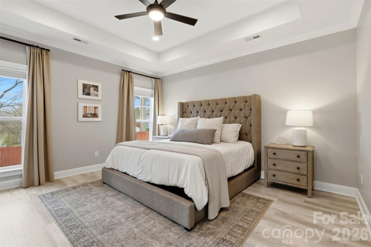 Less than a mile from the heart of Downtown Belmont, this thoughtfully designed home combines modern style with an easy, functional layout. The open floor plan is perfect for everyday living and entertaining, centered around a beautiful kitchen with custom cabinetry, an oversized island, and plenty of storage. Tray ceilings, stylish finishes, and modern fixtures add character throughout the main living space. The primary suite offers a relaxing retreat with a spacious walk-in closet, soaking tub, and beautifully tiled shower. Step outside to a covered rear porch overlooking the fenced backyard—an ideal space to unwind or host friends. The finished two-car garage with epoxy floors adds extra flexibility for storage, hobbies, or a workout space. Enjoy the rare opportunity to live so close to the restaurants, breweries, shops, and charm of Downtown Belmont. You don't want to miss this one!