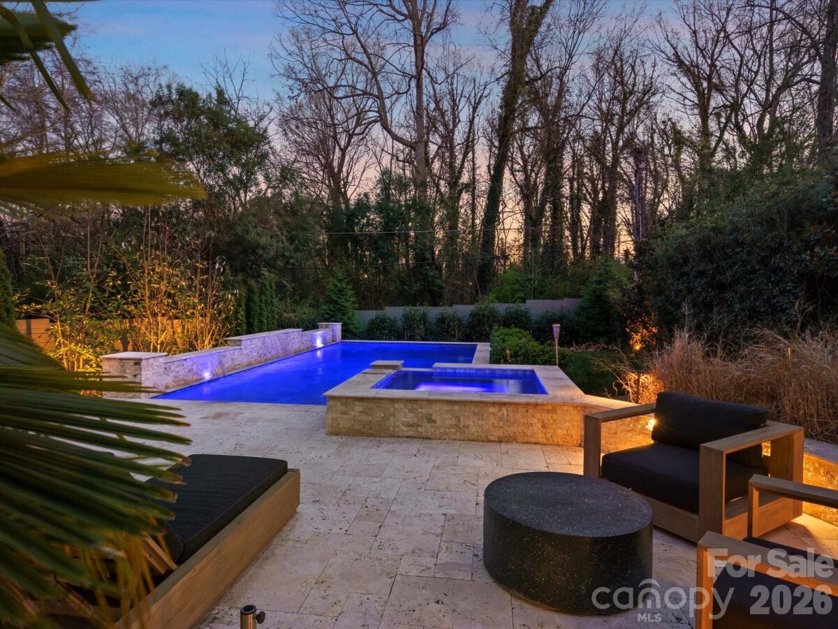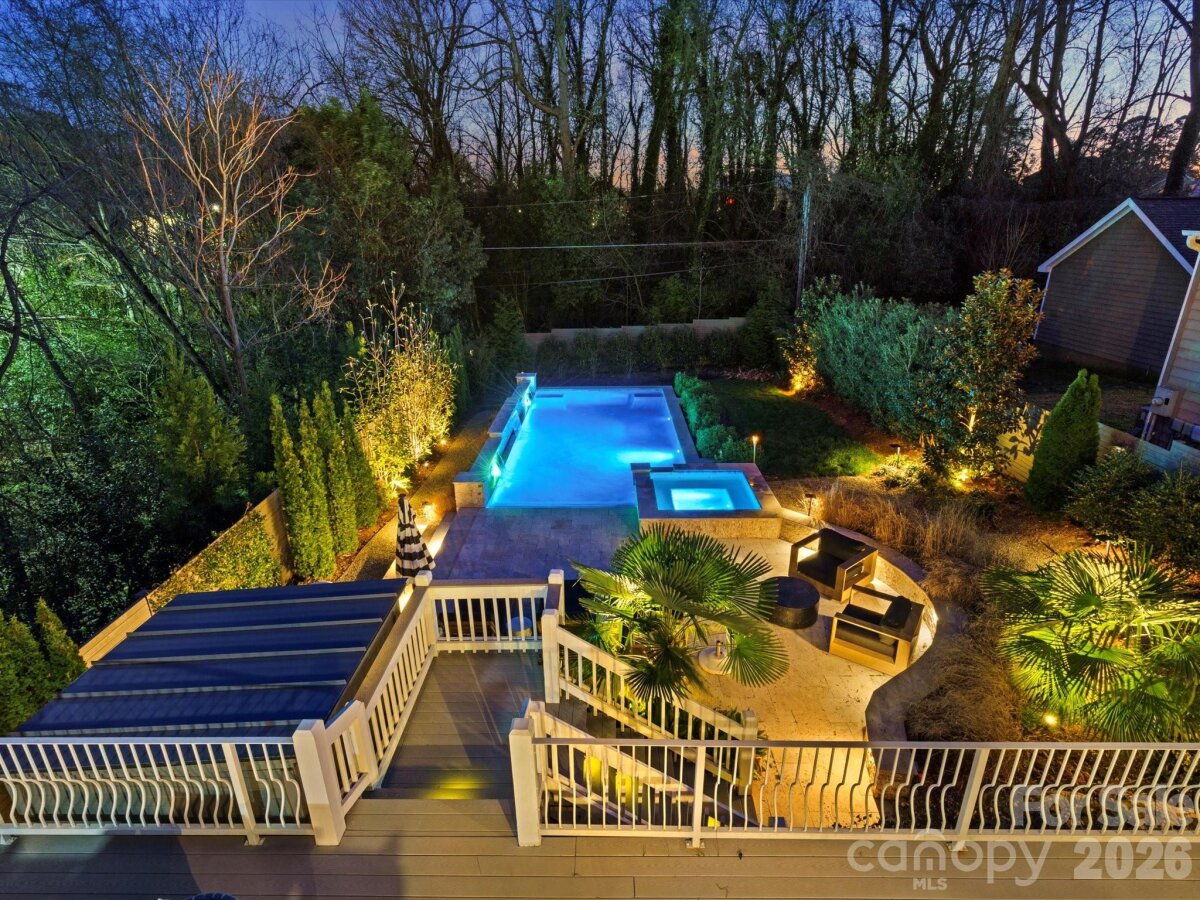 Resort-Style Private Retreat Minutes from Uptown Charlotte Discover a rare offering—an exceptional custom-built residence that delivers modern sophistication, luxurious outdoor living, and unmatched privacy, all while being just moments from Uptown, NoDa, and Plaza Midwood. Surrounded by mature trees and set back from the street, this home provides a secluded, resort-like atmosphere in one of Charlotte’s most desirable urban locations. Designed with intention and crafted with premium finishes, this fully upgraded smart home blends everyday comfort with high-end living. Thoughtful technology, designer selections, and a spacious, flowing layout make the home ideal for both relaxed living and effortless entertaining. The outdoor spaces are truly standout features. A heated and chilled saltwater pool with integrated spa and waterfall creates a stunning focal point, complemented by expansive terraces, multiple outdoor living areas, a screened porch, Trex deck, and beautifully landscaped grounds with custom lighting. A dedicated pool bath with shower adds year-round convenience. Inside, the main level offers an entertainer’s kitchen with granite countertops, a wet bar with beverage refrigerator, a large dining area, and a warm, inviting great room with fireplace. A first-floor bedroom and private office provide flexible living options. Whole-home smart surround sound enhances both daily living and hosting. Upstairs, the luxurious primary suite includes a custom walk-in closet and a private terrace—perfect for morning coffee or unwinding at sunset. This level also features a kitchenette, spacious laundry room, and two additional bedrooms. A rare combination of privacy, design, and location, this home lives like a personal resort in the heart of Charlotte.