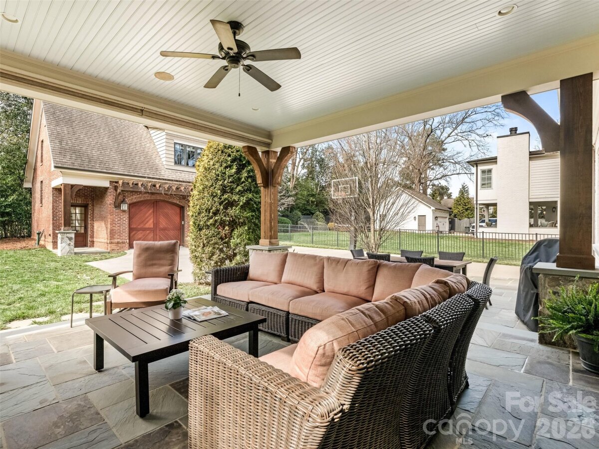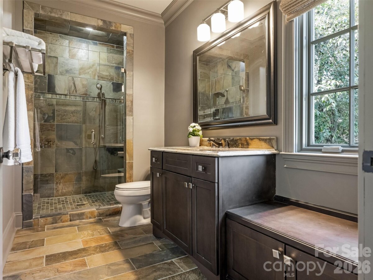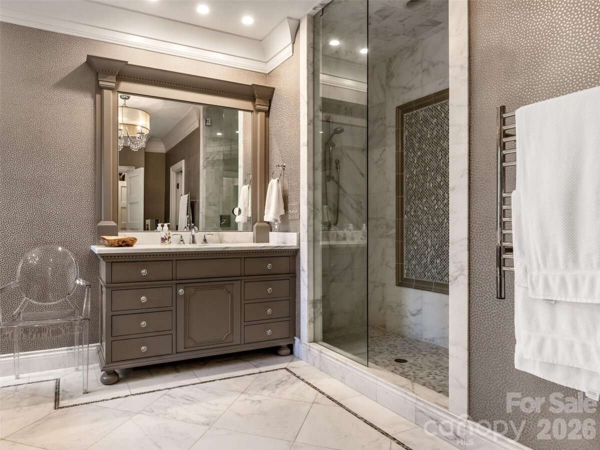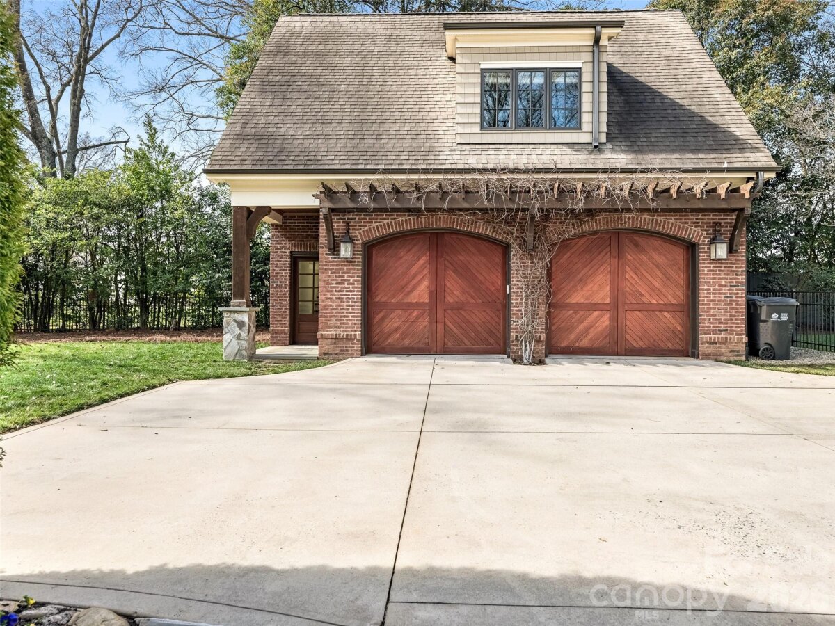 Right sized living with effortless indoor/outdoor flow! Well considered spaces throughout. Striking herringbone patterned walnut floors sets the tone. High ceilings create an immediate sense of light and volume. The great room centers the house--producing an inviting space opening to the kitchen and dining area. Main level primary suite with tray ceiling, heated marble floors, towel warmer, soaking tub and large walk in closet. Large Covered outdoor porch with masonry fireplace and blue stone flooring. Detached oversized garage with living space above-- provides remarkable flexibility--private guest suite, office, or studio! All of the details were considered here-- whole house generator, remote control gate, foam insulation, sealed crawl space, Baldwin hardware, easy walk- in storage, irrigation--plus more!!