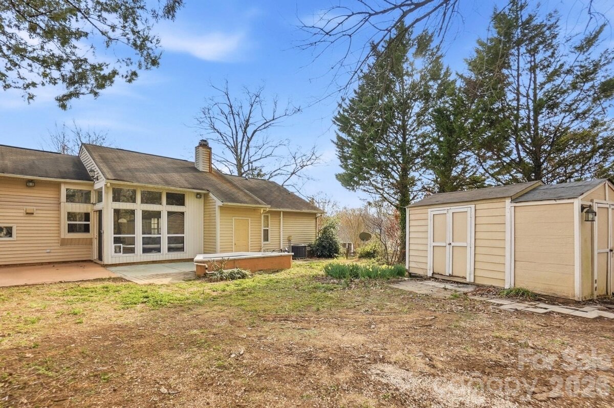 Prime location meets charm in this beautifully designed ranch home in Matthews. Step inside to an inviting open floor plan that creates a seamless flow between the main living spaces. The spacious living room is the heart of the home, featuring a cozy wood-burning stove fireplace and a stunning wall of windows that floods the space with natural light while offering picturesque views of the backyard. The open dining area continues the airy feel, framed by beautiful windows that make every meal feel special. The kitchen is perfectly positioned for both everyday living and entertaining, complete with a large bar for gathering, generous counter space, and a deep windowsill extension — ideal for growing fresh herbs or displaying your favorite plants. The oversized primary bedroom offers a peaceful retreat, highlighted by a stunning primary bathroom and an impressively large closet. Two additional bedrooms and another full bathroom provide plenty of space for everyone. Step outside to enjoy the large backyard designed for both relaxation and entertaining, featuring an extended patio, a built-in hot tub, and a large storage shed for added convenience. This charming ranch combines warmth, space, and an unbeatable location — a true must-see in Matthews.