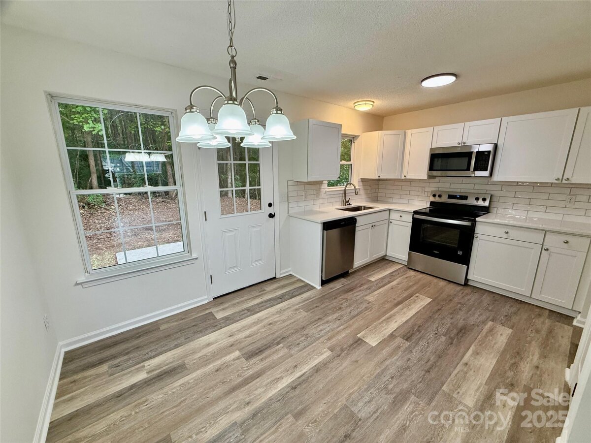 Beautifully remodeled 3 Bedroom and 2 Full Bathroom ranch home tucked away in a quiet cul-de-sac! This light and bright home features a brand-new kitchen, huge family room with tall ceiling, new flooring throughout with newly remodeled bathrooms. The stunning remodeled primary suite offers a large master bathroom, shower and walk in closet. New paint, modern lighting, and thoughtful finishes make it move-in ready. Enjoy the welcoming rocking chair covered front porch, a private rear patio, and a backyard that backs to trees for extra peace and privacy. A perfect blend of comfort with an amazing location, close to so much.