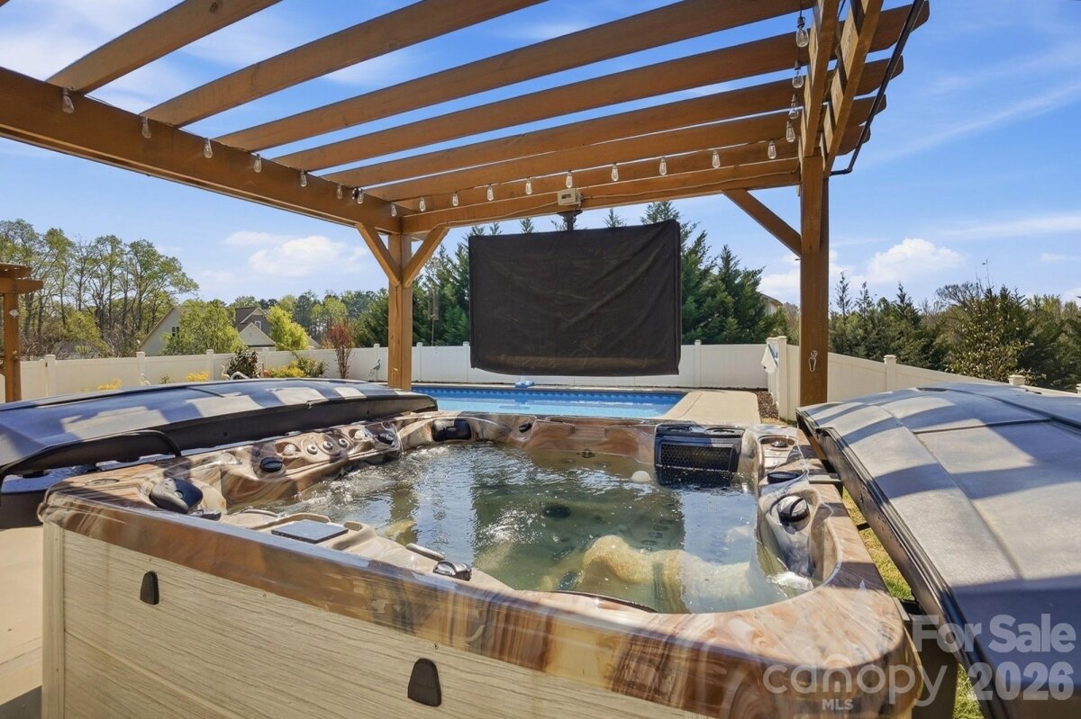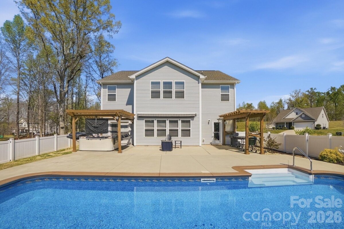 Space, privacy, and resort-style outdoor living come together beautifully in this thoughtfully designed 4 bedroom, 2.5 bath home built in 2018. Situated on a generous 0.8 acre corner lot, this property offers the kind of breathing room that’s getting harder to find, without sacrificing convenience to everyday essentials. Inside, you’ll find over 3100 sq ft of well-proportioned living space designed for both daily life and entertaining. The layout provides flexibility for gathering and quiet time alike, while the attached 2-car garage and expanded driveway offer abundant parking for guests or multi-vehicle households. Step outside and the property truly separates itself. The backyard is designed to function like a private retreat, featuring a sparkling pool surrounded by a white vinyl privacy fence for both safety and seclusion. Two pergolas define the outdoor living spaces - one covering the dedicated outdoor kitchen area and the other sheltering the hot tub, creating a comfortable setting for entertaining and year-round relaxation. A retractable awning extends the living space just off the back of the home, making it easy to enjoy outdoor meals or relax poolside in comfort. Updated landscaping enhances the curb appeal with various fruit trees lining the yard and grape vines along the backyard. Plus a storage shed provides practical space for tools, equipment, or seasonal items. The wooded area beside the home adds an extra layer of privacy rarely found on newer construction, while the corner lot setting enhances both space and accessibility. Located in a desirable area served by highly regarded local schools and just minutes from newly-developed shopping and dining options, this home strikes a rare balance between peaceful country living and everyday convenience. For added confidence, the property is pre-inspected and includes a 1 year home warranty.