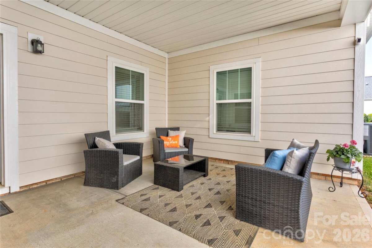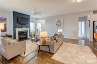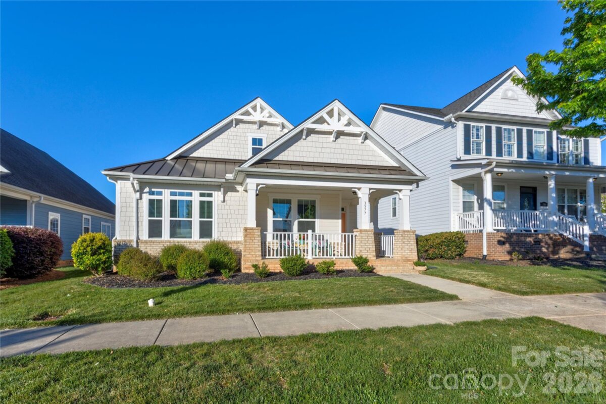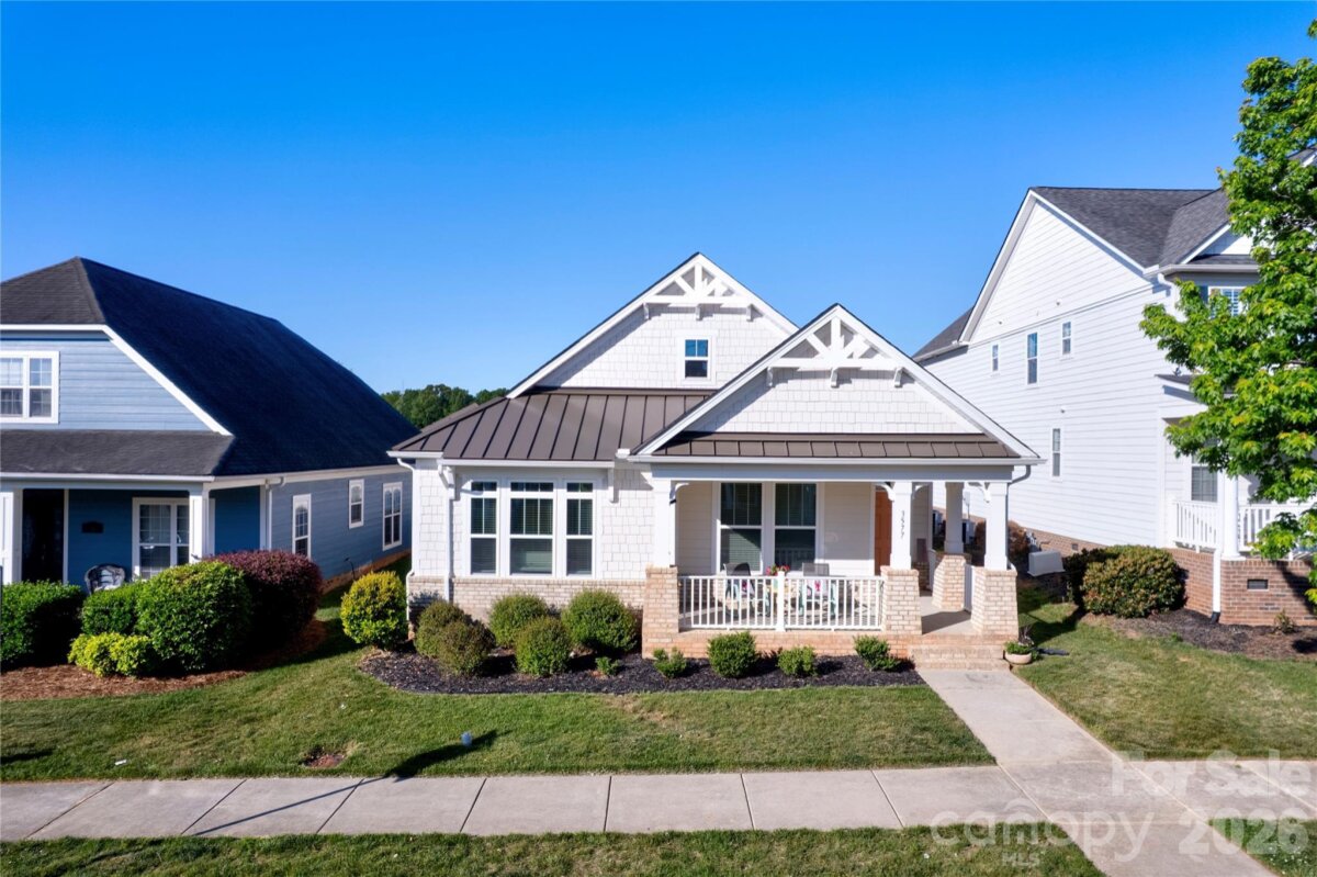 This one was worth waiting for! COZY COTTAGE MEETS OPEN AND MODERN FLOOR PLAN! A shady covered front porch greets you and invites you to sit down and stay awhile. The center of the home is a huge family room/kitchen/dining area. The kitchen island is an oversized 9' 4" x 5' 9" and is the perfect spot for gathering, entertaining and just LIVING YOUR LIFE! The kitchen features stainless steel appliances, abundant cabinetry and granite counter tops. The highlight of this bright family room is a cozy fireplace with gas logs. The family room flows flawlessly into the private and covered patio offering an indoor/outdoor living space and could easily be screened in. The primary bedroom suite is a true sanctuary with an oversized walk-in tiled shower, double vanity and walk-in closet. The split bedroom plan offers an additional two generous bedrooms and a full bath complete this comfortable home. A double garage is tucked in back for great parking and storage, while maintaining the cottage curb appeal. Located in the always popular Kellswater Bridge, this home is just 6/10 of a mile from the neighborhood amenities which offer a huge outdoor pool, clubhouse, tennis courts, game court, volleyball, pickleball and dog park. The neighborhood offers easy access to the greenway for recreation. Convenient to I-85, it's the perfect location for commuters to Charlotte.