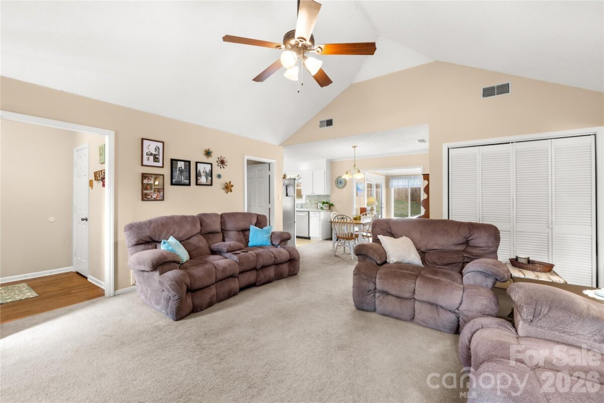 Spacious, updated ranch home in a highly desirable, established community with no HOA. This thoughtfully designed split-bedroom floor plan offers privacy and functionality. The vaulted great room features a cozy fireplace, creating a warm and inviting focal point. Enjoy the bright and cheerful sunroom overlooking the beautifully landscaped, fenced backyard. The back deck is perfect for entertaining or relaxing outdoors, while the rocking chair front porch adds classic charm. A storage building provides additional convenience. Fresh neutral tones throughout make this home truly move-in ready.