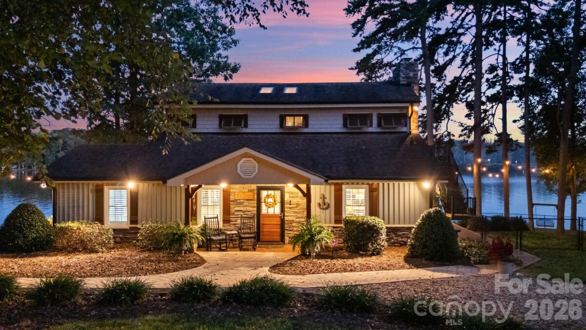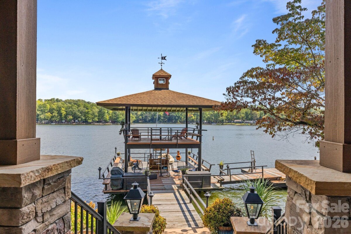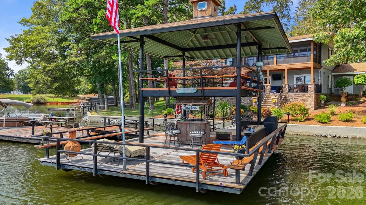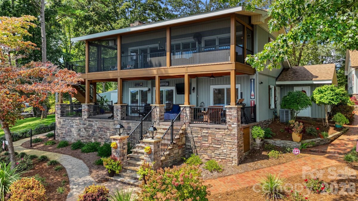 Lakefront EXTENSIVELY remodeled Home! Double Lot w/ 2nd Living Qtrs & Double-Deck Dock/Gorgeous LONG range VIEWS w/ manicured irrigated lawn & landscaping/Outdoor UPPER-LEVEL HOT TUB! PLUS 846 HTD sq ft 2.5 car detached garage PLUS 633 HTD sq ft apartment up + FULL BATH! Custom Plantation Shutters/Level 4 granite, matching lighting w/ copper sink & outdoor gas lights on stone pillars! Tankless water heaters! Garage/Apartment excellent for entertainment/AirBnB/Camper hookup for guests! Partial steel Frame home! HOT & COLD water outside for washing your TOYS! Deep water year around, excellent lighting, tiki bar, dock w/ power & water/16+ ft at full pond! Four porches, with TVs & can entertain 35 to 45 comfortably! Porches have moisture shield material & ducks-back flooring, stamped concrete. Upper screened porch - primary bedroom! Great fishing - release area from fishing tournaments nearby! Minutes from public boat launch & lakeside fuel for easy watercraft adventures.