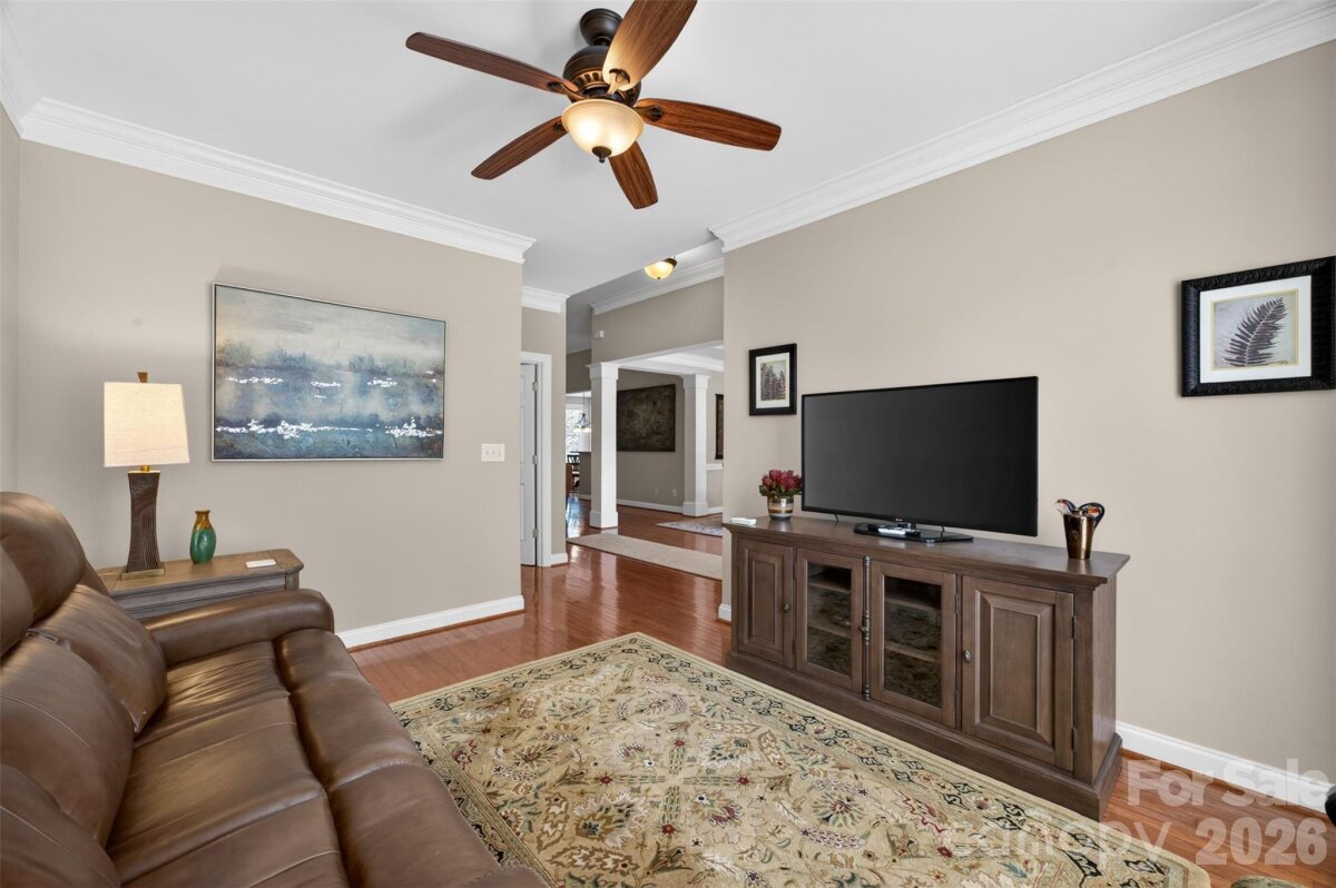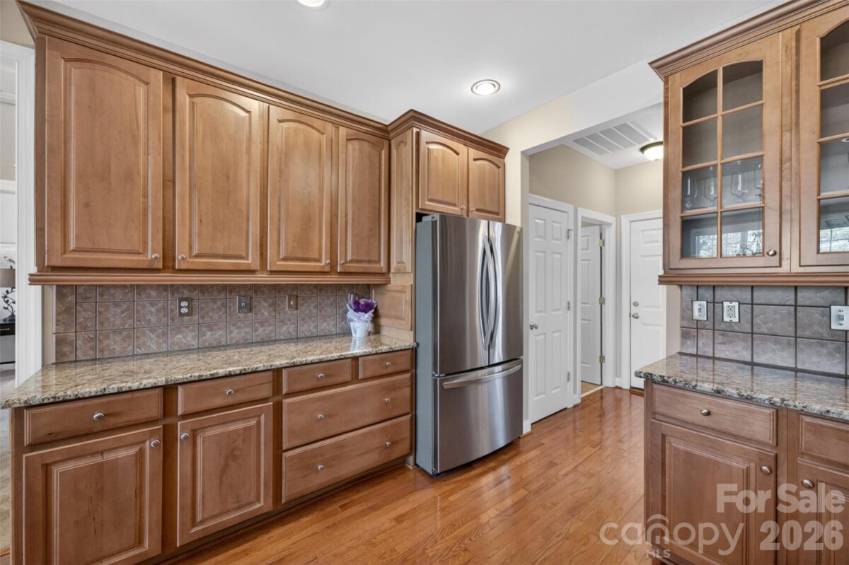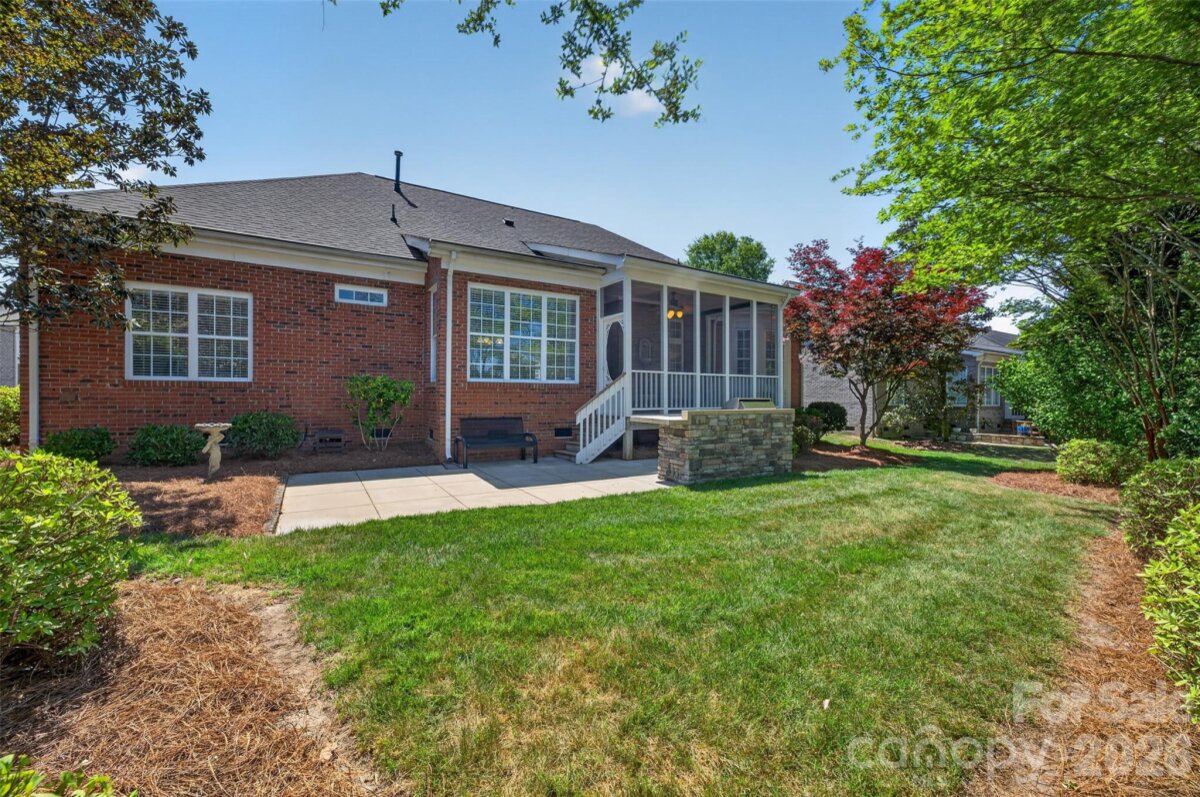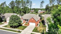 Welcome home to this stunning full-brick retreat featuring a classic, inviting rocking chair front porch—the perfect spot for your morning coffee. Step inside to an airy, open-concept layout defined by gleaming hardwood floors and an abundance of natural light. The chef-inspired kitchen is the heart of the home, boasting 42-inch maple cabinetry with elegant glass-front accents, granite countertops, stainless steel appliances, including a gas range (Refrigerator, Washer & Dryer convey). Host gatherings in the formal dining room, which features a sophisticated trey ceiling for added character. Escape to the oversized primary suite, a true sanctuary highlighted by a tray ceiling, brand-new carpet, and a massive walk-in closet. The spa-like primary bath with granite countertops and a deep oversized soaking tub. Every detail of this home combines timeless brick construction with modern, high-end comforts. Screened rear porch w/trex decking & sun shade, paver patio and outdoor stone kitchen area with built-in gas grill and refrigerator. Fully finished garage with molding and trim, gutter guard system & irrigation system. New roof in 2020. The property is surrounded by extensive landscaping with lush, mature growth. The HOA covers lawn care/shrub maintenance. Photo of road and wall is a virtual rendering of finished area to the rear of property line.