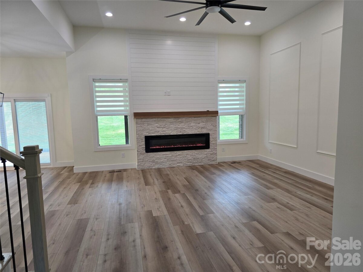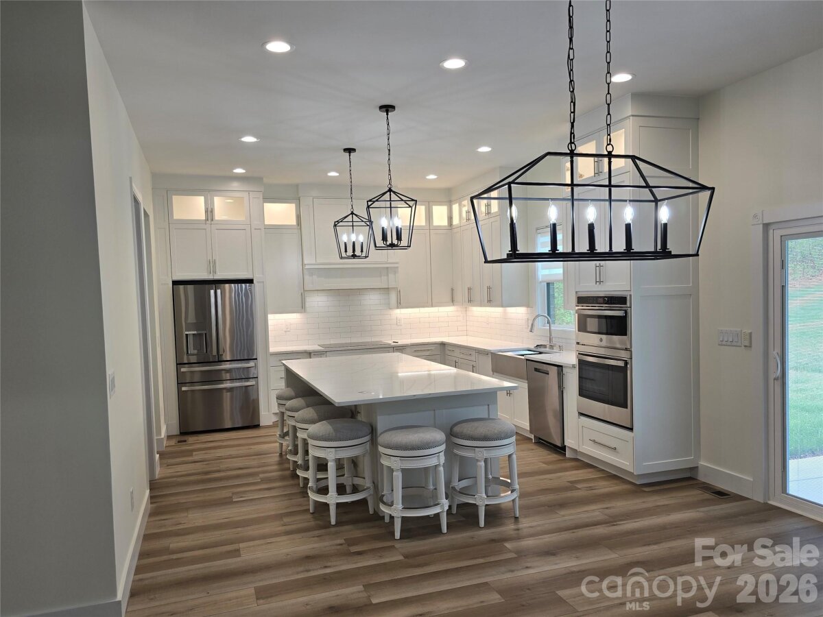 Located in the Rock Barn Country Club & Spa community in Conover, this newly built home offers 4 bedrooms, 4 full bathrooms, and approximately 3,200 sq ft of open, well-designed living space. The main level features high ceilings, durable LVP flooring throughout, and a spacious open floor plan. The living room includes a modern electric fireplace and flows into the kitchen and dining areas. The kitchen includes custom cabinetry, Calacatta quartz countertops, top-of-the-line appliances, an induction cooktop with vent hood, built-in oven/microwave combo, and a large walk-in pantry. Two bedrooms are located on the main level, including the primary bedroom. Primary bath features freestanding tub, tile shower, dual vanities, and a walk-in closet. All four bedrooms in the home feature walk-in closets. Upstairs offers two bedrooms, 2 full baths, bonus space, and upgraded attic storage. Additional highlights include a dining room mini bar with beverage fridge, rooms wired for ethernet, and a 3-car garage (with a smaller bay ideal for a golf cart or sports car). Optional community amenities include golf, pool, tennis, fitness center, clubhouse, and spa access.