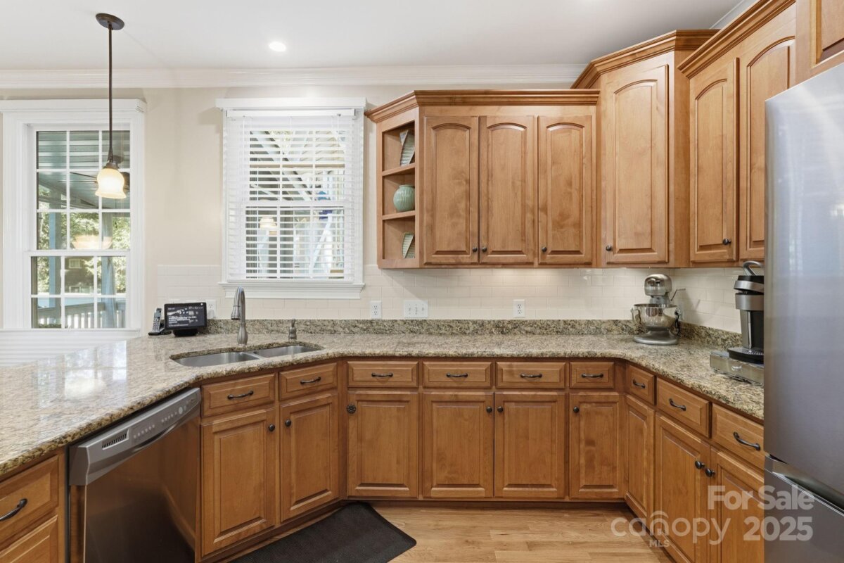 Discover refined living in one of Statesville's most coveted neighborhoods. This thoughtfully designed custom home seamlessly blends elegant entertaining spaces with practical everyday living - an exceptional value with premium upgrades inside & out. Thoughtfully designed floor plan with ML primary suite a true retreat with spa-inspired bath & generous walk-in closet. Dramatic two-story great room anchored by striking stone fireplace flows into open-concept kitchen - ideal for daily living & effortless entertaining. Three additional bedrooms & two full baths upstairs, inc. potential second primary suite with walk-in closet and private ensuite bath—ideal multigenerational or guest space. Charming screened porch overlooks inviting salt water poolscape & impressive 800 sq ft detached two-car garage for hobbyists & car buffs, who will love 4 bays total. A 529 sq ft bonus above provides endless possibilities. This rare combination of space, style, & functionality is ready for you!
