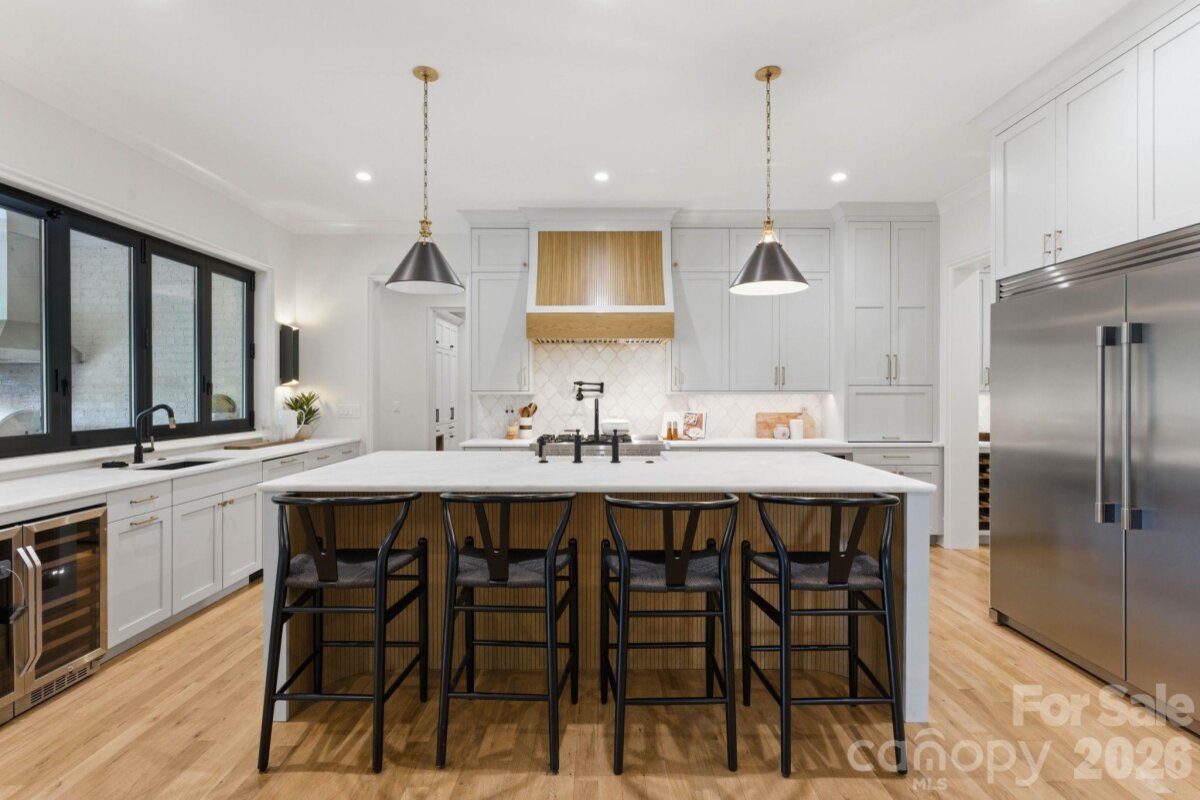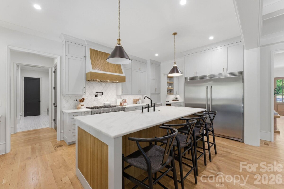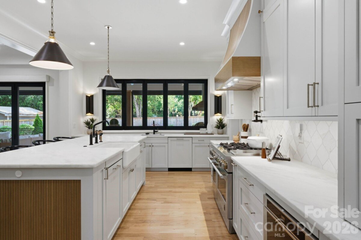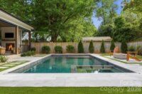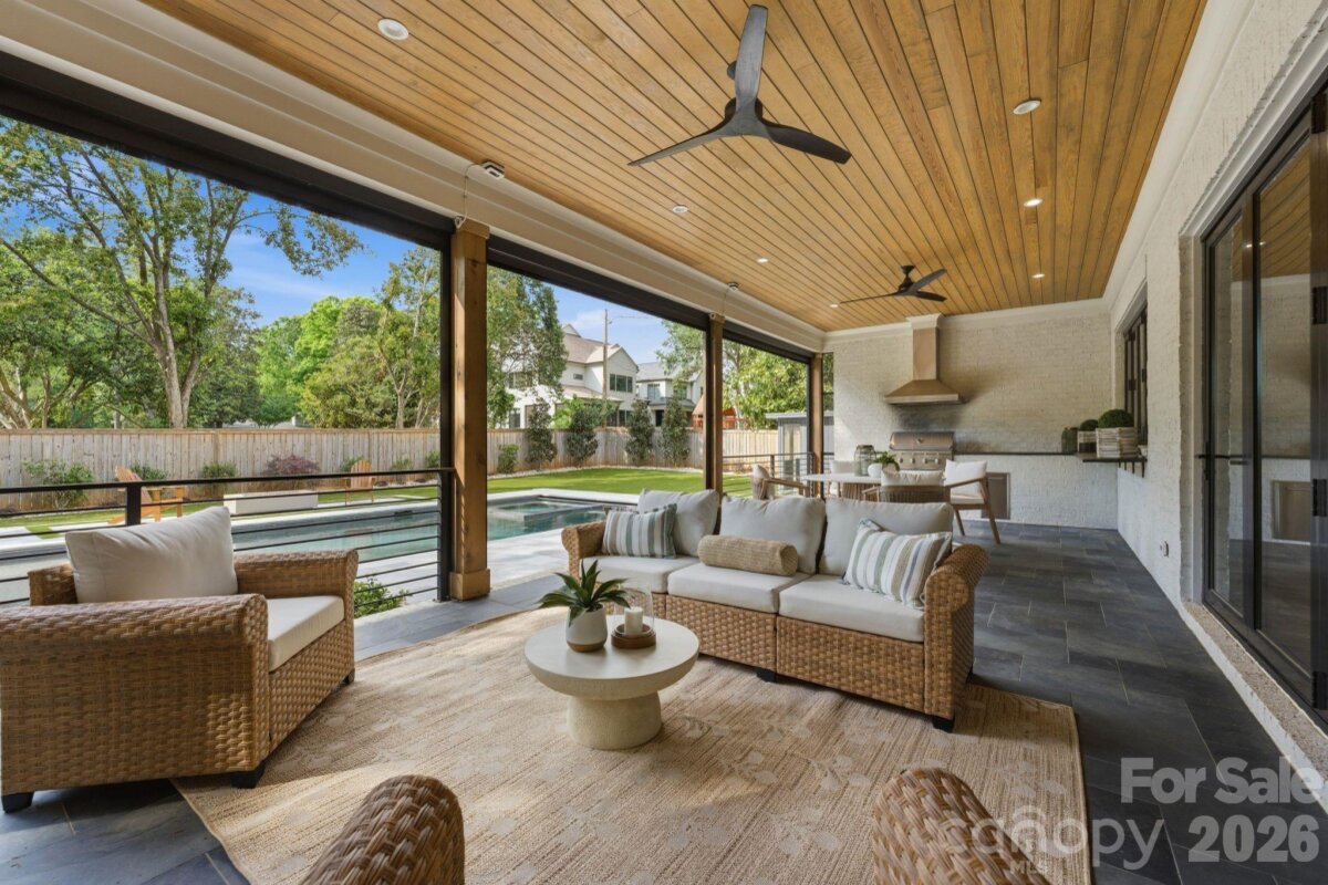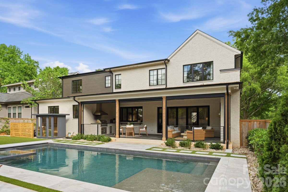 Sophistication and comfort converge in this custom Pike Properties, high-end residence showcasing five generous bedrooms, four full bathrooms plus 1 half bathroom, all finished with meticulous designer detail from the front door to the private backyard retreat while situated on a quiet, dead-end street. White oak hardwoods span the home, while designer finishes create a warm, elevated ambiance in every room. A bright, open main level features the inviting great room with a gas log fireplace, custom built-ins, and expansive views to the outdoor living areas. The space flows effortlessly into the chef’s kitchen, where custom shaker style cabinetry provides abundant storage, including an additional pantry, and professional-grade stainless steel appliances are framed by quartz countertops, stunning tile backsplash, and glistening gold accents. An adjacent dining room with a statement chandelier and large picture windows peering out to the yard makes both everyday meals and entertaining feel special. A complete guest suite with full bathroom is thoughtfully tucked away on the main floor for privacy and main level office space for versatility. Upstairs, the primary bedroom retreat is a serene sanctuary with a vaulted wood beam accent ceiling, generous proportions, and tranquil views. The spa-inspired bathroom showcases a double vanity, freestanding tub, and designer-tiled shower, creating a true boutique-hotel experience at home. All secondary bedrooms feature hardwood flooring, while the secondary bathrooms are finished with ornate tile selections and furniture-style vanities for a cohesive, upscale feel throughout. Designed for effortless indoor-outdoor living, the great room opens to an expansive covered terrace with slate tile flooring and an outdoor gas log fireplace, extending the main living area into a sophisticated alfresco lounge. Here you will also find a built-in grill and a fully realized outdoor kitchen, ideal for hosting gatherings year-round. Motorized retractable screens transform the terrace into an all-season room at the touch of a button. Just beyond, a resort-style pool with integrated spa and sun ledge is framed by crisp hardscape and manicured landscaping, creating a private, magazine-worthy backdrop. The fenced backyard provides ample green space for play and pets, while the front elevation presents timeless curb appeal with painted brick, contrasting siding, and thoughtfully designed landscaping. Every element of this residence has been curated for homeowners who appreciate clean lines, warm modern design, and resort-level amenities—all in a truly turnkey, luxurious package.
