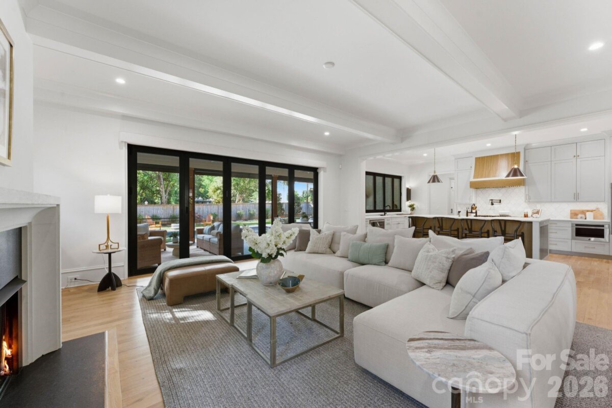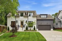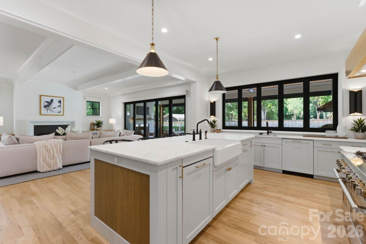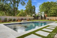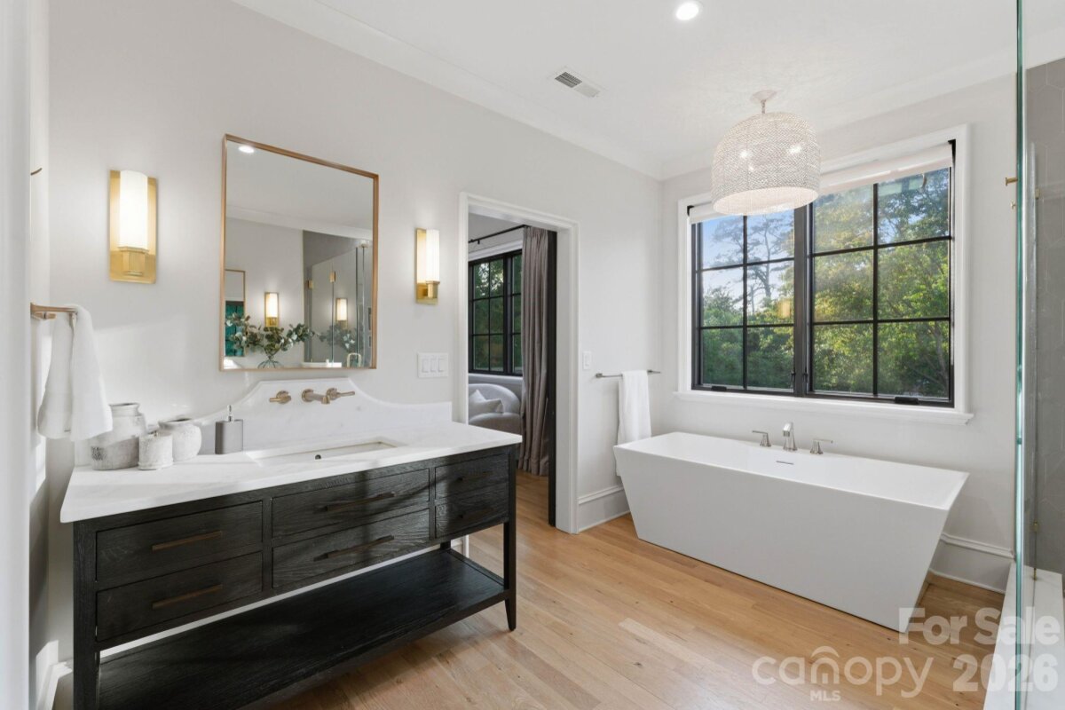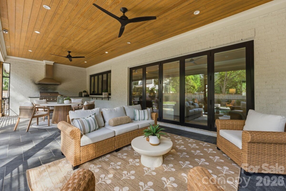 Sophistication and comfort converge in this custom Pike Properties, high-end residence showcasing five generous bedrooms, four full bathrooms plus 1 half bathroom, all finished with meticulous designer detail from the front door to the private backyard retreat while situated on a quiet, dead-end street. White oak hardwoods span the home, while designer finishes create a warm, elevated ambiance in every room. A bright, open main level features the inviting great room with a gas log fireplace, custom built-ins, and expansive views to the outdoor living areas. The space flows effortlessly into the chef’s kitchen, where custom shaker style cabinetry provides abundant storage, including an additional pantry, and professional-grade stainless steel appliances are framed by quartz countertops, stunning tile backsplash, and glistening gold accents. An adjacent dining room with a statement chandelier and large picture windows peering out to the yard makes both everyday meals and entertaining feel special. A complete guest suite with full bathroom is thoughtfully tucked away on the main floor for privacy and main level office space for versatility. Upstairs, the primary bedroom retreat is a serene sanctuary with a vaulted wood beam accent ceiling, generous proportions, and tranquil views. The spa-inspired bathroom showcases a double vanity, freestanding tub, and designer-tiled shower, creating a true boutique-hotel experience at home. All secondary bedrooms feature hardwood flooring, while the secondary bathrooms are finished with ornate tile selections and furniture-style vanities for a cohesive, upscale feel throughout. Designed for effortless indoor-outdoor living, the great room opens to an expansive covered terrace with slate tile flooring and an outdoor gas log fireplace, extending the main living area into a sophisticated alfresco lounge. Here you will also find a built-in grill and a fully realized outdoor kitchen, ideal for hosting gatherings year-round. Motorized retractable screens transform the terrace into an all-season room at the touch of a button. Just beyond, a resort-style pool with integrated spa and sun ledge is framed by crisp hardscape and manicured landscaping, creating a private, magazine-worthy backdrop. The fenced backyard provides ample green space for play and pets, while the front elevation presents timeless curb appeal with painted brick, contrasting siding, and thoughtfully designed landscaping. Every element of this residence has been curated for homeowners who appreciate clean lines, warm modern design, and resort-level amenities—all in a truly turnkey, luxurious package.