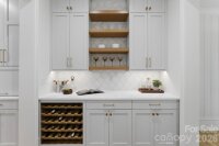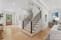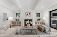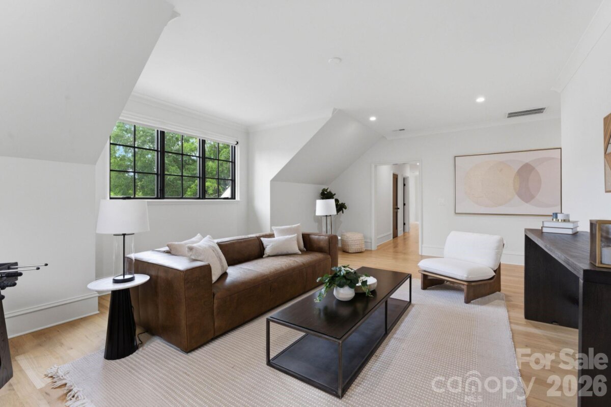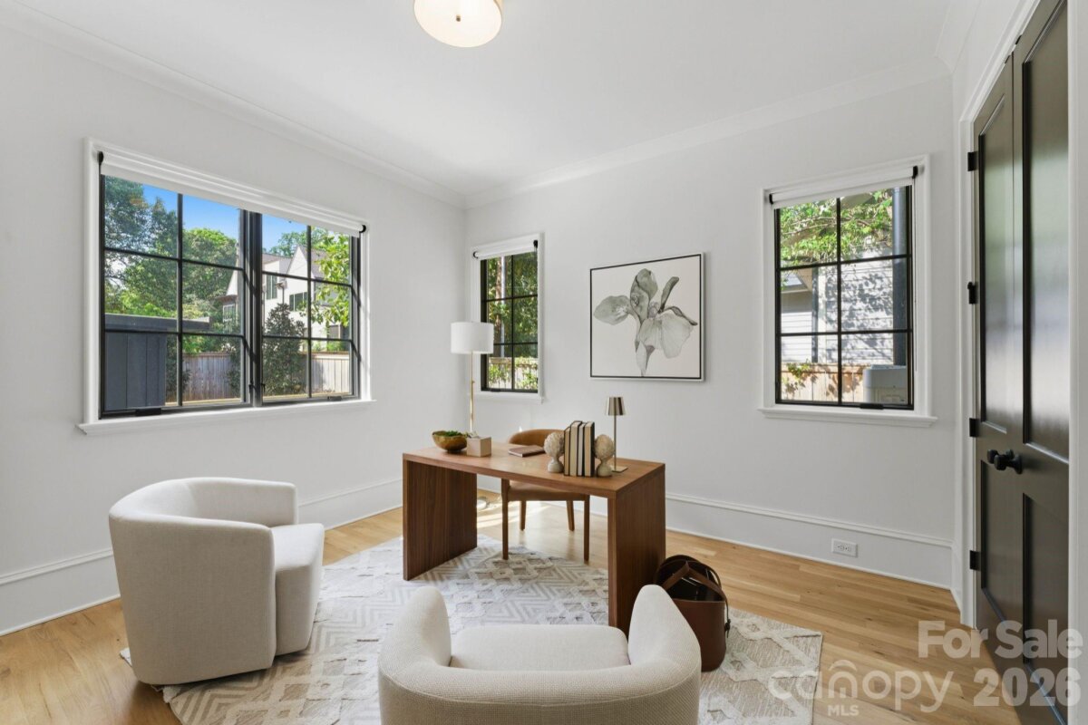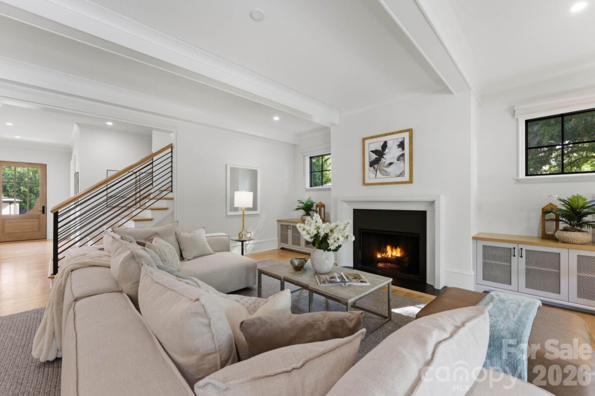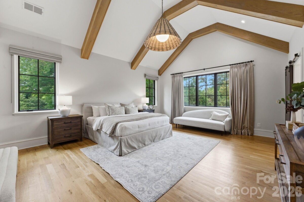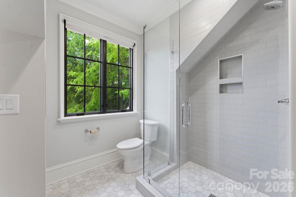 Sophistication and comfort converge in this custom Pike Properties, high-end residence showcasing five generous bedrooms, four full bathrooms plus 1 half bathroom, all finished with meticulous designer detail from the front door to the private backyard retreat while situated on a quiet, dead-end street. White oak hardwoods span the home, while designer finishes create a warm, elevated ambiance in every room. A bright, open main level features the inviting great room with a gas log fireplace, custom built-ins, and expansive views to the outdoor living areas. The space flows effortlessly into the chef’s kitchen, where custom shaker style cabinetry provides abundant storage, including an additional pantry, and professional-grade stainless steel appliances are framed by quartz countertops, stunning tile backsplash, and glistening gold accents. An adjacent dining room with a statement chandelier and large picture windows peering out to the yard makes both everyday meals and entertaining feel special. A complete guest suite with full bathroom is thoughtfully tucked away on the main floor for privacy and main level office space for versatility. Upstairs, the primary bedroom retreat is a serene sanctuary with a vaulted wood beam accent ceiling, generous proportions, and tranquil views. The spa-inspired bathroom showcases a double vanity, freestanding tub, and designer-tiled shower, creating a true boutique-hotel experience at home. All secondary bedrooms feature hardwood flooring, while the secondary bathrooms are finished with ornate tile selections and furniture-style vanities for a cohesive, upscale feel throughout. Designed for effortless indoor-outdoor living, the great room opens to an expansive covered terrace with slate tile flooring and an outdoor gas log fireplace, extending the main living area into a sophisticated alfresco lounge. Here you will also find a built-in grill and a fully realized outdoor kitchen, ideal for hosting gatherings year-round. Motorized retractable screens transform the terrace into an all-season room at the touch of a button. Just beyond, a resort-style pool with integrated spa and sun ledge is framed by crisp hardscape and manicured landscaping, creating a private, magazine-worthy backdrop. The fenced backyard provides ample green space for play and pets, while the front elevation presents timeless curb appeal with painted brick, contrasting siding, and thoughtfully designed landscaping. Every element of this residence has been curated for homeowners who appreciate clean lines, warm modern design, and resort-level amenities—all in a truly turnkey, luxurious package.
