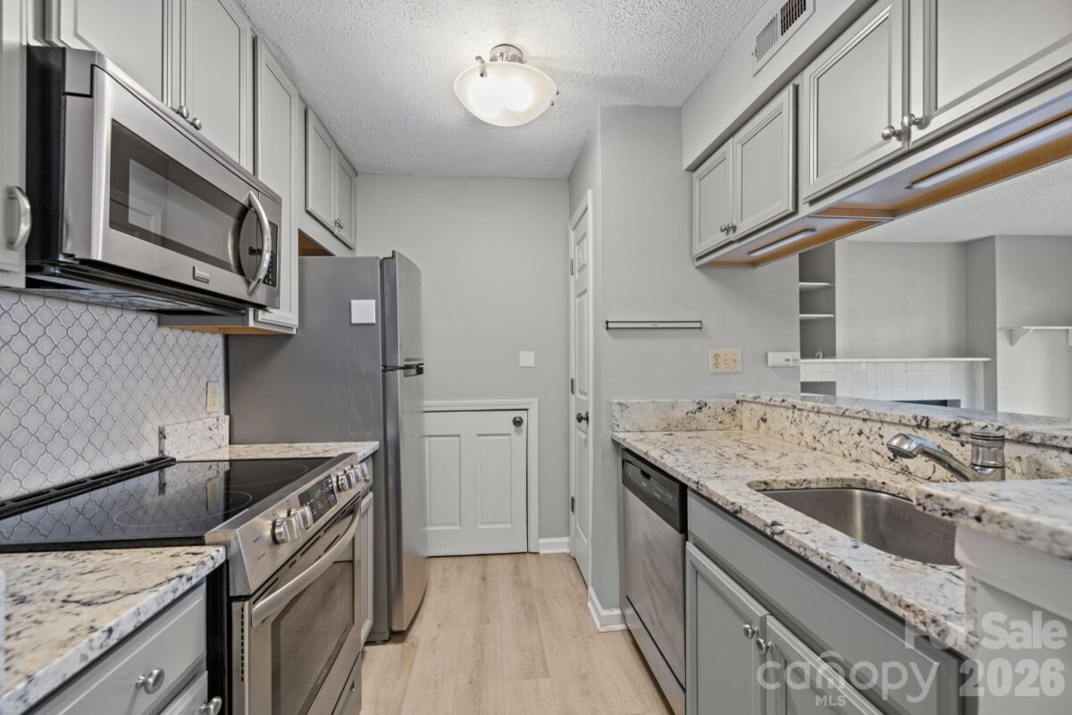Move-in ready rare two story condo in Fourth Ward, right in the heart of Uptown. Walk to Tryon Street, parks, restaurants, and grocery stores and enjoy true center-city living at an affordable price. The efficient open floor plan connects the kitchen, living, and dining areas, maximizing space and flow. Modern updates include LVP flooring and upgraded appliances throughout. Relax or entertain on your private patio with outdoor storage, and take advantage of the community pool open all summer. Includes one designated parking space. Prime location, low-maintenance living, and unbeatable walkability.
