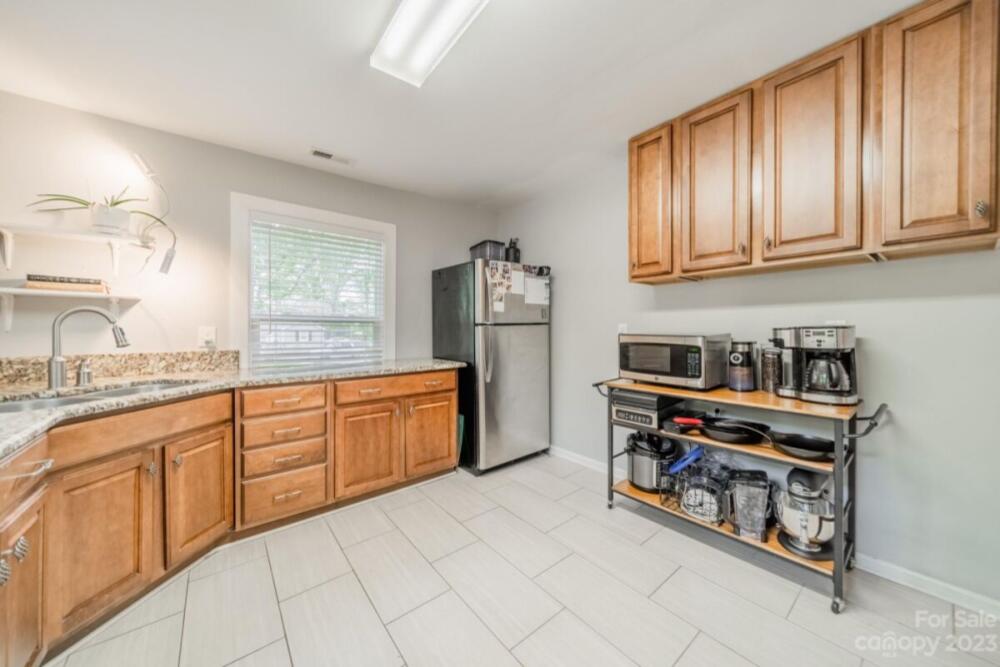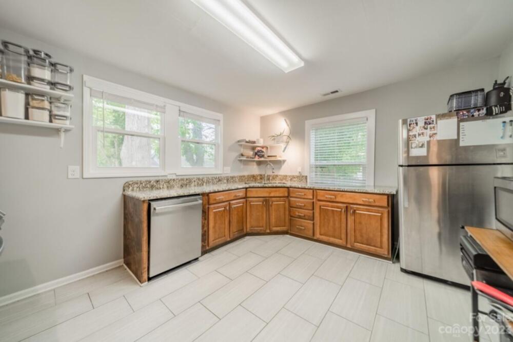 Location, Location, Location..10 min drive to Uptown! Oakhurst on Monroe Shopping and Common Market right around the corner. Neighborhood is booming with new construction. Move-in ready, renovate or build your dream home on this large, flat, private and beautiful usable lot. Grab your favorite drink, sit on the front porch or the back patio and enjoy the surroundings. Kitchen has been updated with new tile floors, granite countertops, stainless steel dishwasher, electric cooktop/oven and plenty of cabinet space. Separate dining area and large living room to kick back and relax. Split bedroom floor plan allows for lots of privacy. Huge primary bedroom with walk-in closet and renovated bathroom. Two large additional bedrooms with large closets and second full bath. Large laundry room with plenty of storage space. Home is set away from the street with a long driveway and tons of parking available. New roof and HVAC IN 2017. Tons of parks nearby and access to three Greenways.