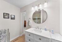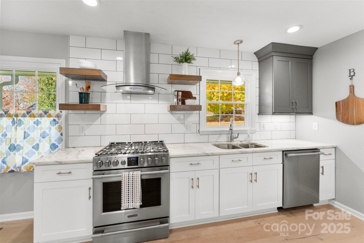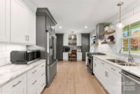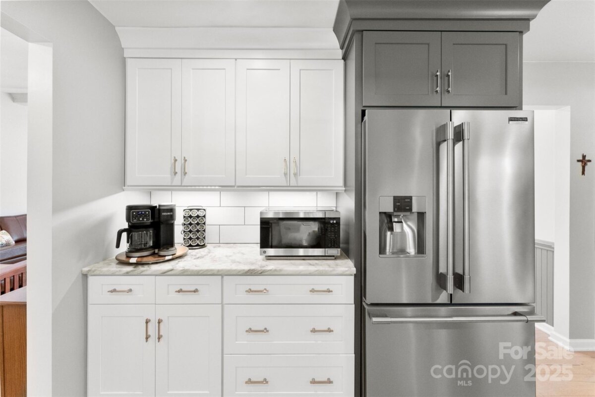 This beautifully maintained home showcases thoughtful design and attention to detail throughout. The designer kitchen looks straight out of a magazine, featuring modern finishes and a stylish layout perfect for everyday living and entertaining. The spacious living room offers vaulted ceilings and a stunning masonry fireplace, creating a warm and inviting atmosphere. The large primary suite includes a walk-in closet and a remodeled bathroom with a custom tile walk-in shower. Enjoy your morning coffee on the charming rocking-chair front porch overlooking the corner lot. Recent updates include wide-plank LVP flooring, fresh interior paint, French doors leading to the back deck, insulated windows, new water heater, architectural roof, vinyl siding, gutters, garage doors and openers, and updated HVAC and ductwork. The kitchen and laundry were remodeled in 2016. With generously sized bedrooms, ample closet space, and an oversized side-entry garage, this home truly has it all!