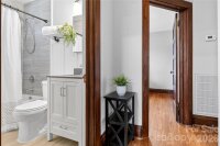 Charming 1941 bungalow just 0.5 mile from Downtown Mooresville — walk to shopping, dining, breweries, and entertainment! This 2 bedroom, 1 bathroom home blends timeless character with modern updates, featuring original hardwood floors, original millwork, 6" baseboards, and vintage door hardware throughout. The updated kitchen features granite countertops, a tile backsplash, and stainless steel appliances (including a fridge), while the renovated bathroom offers wainscoting, a tub/shower combo, and dual shower niches. A dedicated mudroom/laundry room includes a stackable washer and dryer, cabinetry, and counter space for added storage and functionality. Vinyl windows fill the home with natural light. Outside, enjoy a partially covered back patio, a fenced portion of the large lot, and a detached one-car carport with additional storage space. Located in a no-HOA community, this move-in-ready home is perfect as a primary residence, downsizing opportunity, or investment property, offering charm, flexibility, and convenience in one of Mooresville’s most desirable areas. Close to Lake Norman, parks, schools, and major commuting routes.