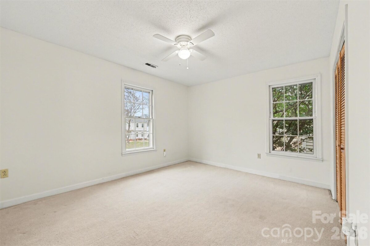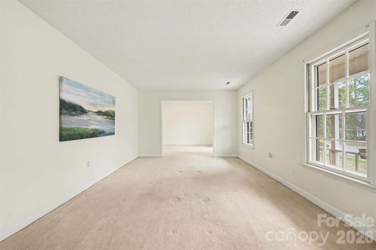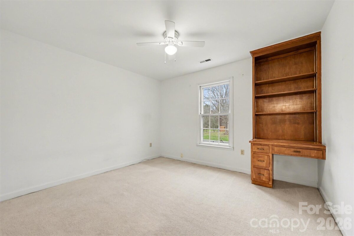 Spacious 4-bedroom, 2-bath home with 2,087 sq ft located on a large corner lot in the desirable Sardis Woods neighborhood. Quiet, established community with mature trees, a fenced backyard, and no HOA. The kitchen features new quartz countertops, subway tile backsplash, a Frigidaire side-by-side refrigerator, and a Frigidaire electric range with convection oven and built-in air fryer (all installed April 2025). Breakfast nook located off the kitchen, along with a large formal dining room and office space. The den includes built-in custom shelving and a wood-burning fireplace. Ceiling fans are installed throughout the home. Extra-large primary bedroom with private access to the backyard, a large walk-in closet, and a separate lighted vanity area. Two additional bedrooms include built-in custom desks with shelving. The fenced backyard includes a Superb by Broilmaster Gas Grill professionally installed and connected to the gas supply, ideal for outdoor cooking and entertaining. Additional features include a large attic space with dormer windows and a newer HVAC system installed January 2019. All appliances convey, including washer and dryer. Staging pictures, plants, and accessories do NOT convey. Conveniently located near a greenway with walking trails and creek access. Approximately 15 minutes to Uptown Charlotte, SouthPark Mall, and Cotswold Village Shops, with easy access to restaurants, shopping, and the Matthews Community Farmers' Market.