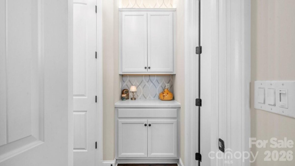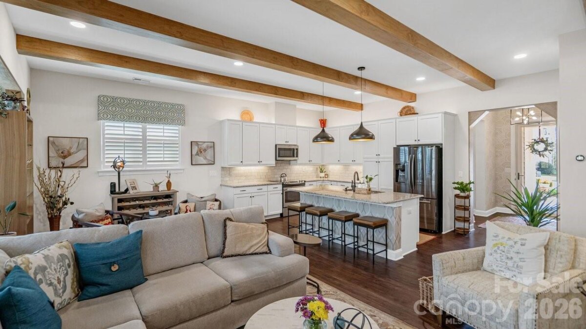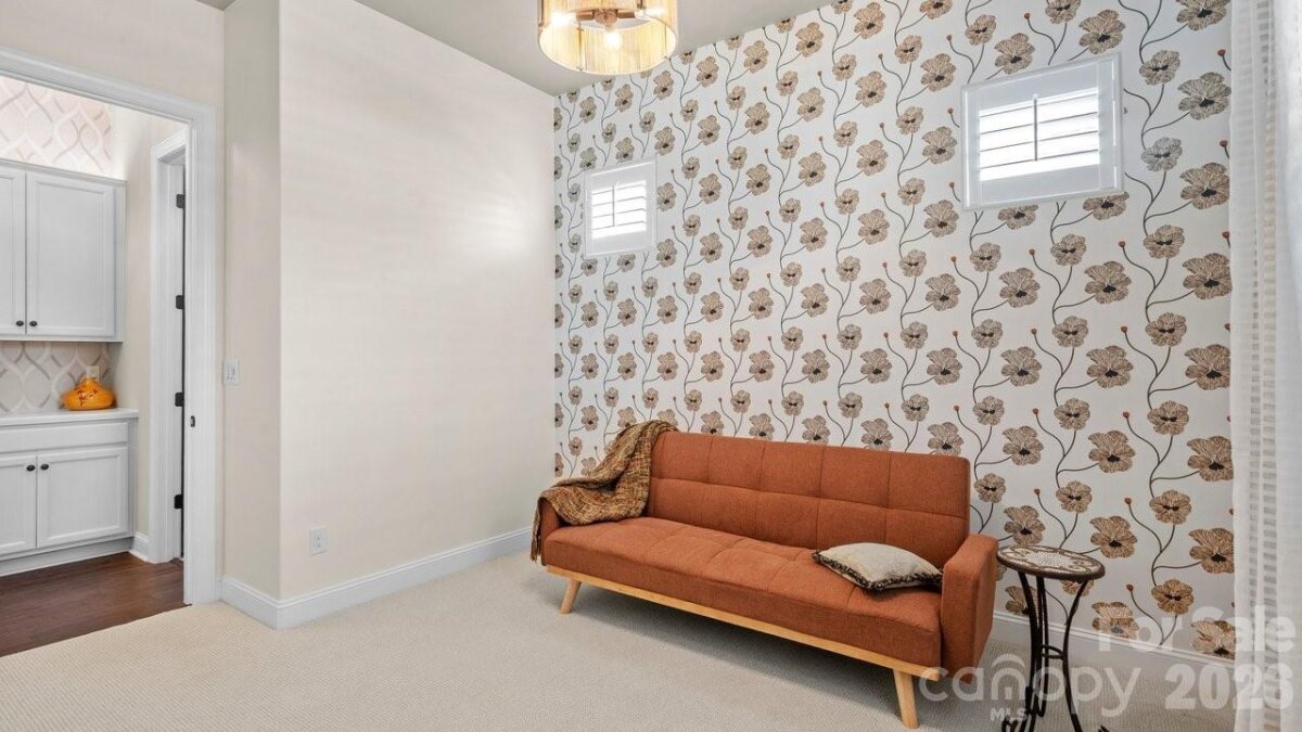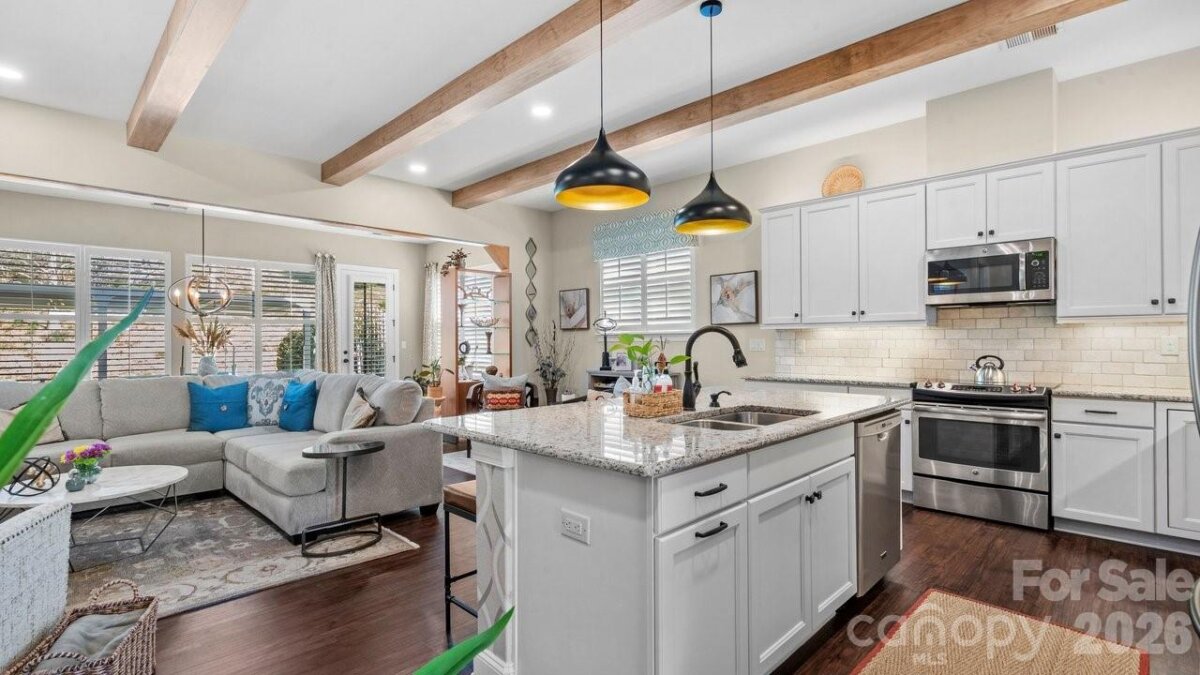 Out of a magazine this completely turn key craftsman style bungalow with sunroom is waiting for you. This home features an amazing outdoor entertaining area with built in grill station, water feature, raised planter beds for the gardening enthusiast with seating wall and patio with covered louvered pergola extending in and outdoor entertaining areas in a peaceful, quiet, natural setting. Custom wall treatments and drapery, plantation shutters, low maintenance LVP flooring and wood beams highlight the main living areas. Upgrades include: 10ft. ceilings, 8'doors, under/over cabinet kitchen lighting, tile back splash, solid surface counters, roll out drawers for easy access, large island with additional storage and decorator lighting. Primary suite features bump out bay window and a built in window seat for storage, ensuite bath with dual sink vanity, walk in closet and shower. Private split bedroom layout offers convenient drop zone storage and adjoining bath. Laundry room has additional upper and lower cabinetry with amazing counter work space. Finished garage with 4' extension. Great location on a cul de sac street with easy access to the community trails and the Twin Mills Club. Trilogy Membership includes Freedom Boat Club on Lake Norman plus award winning amenities.