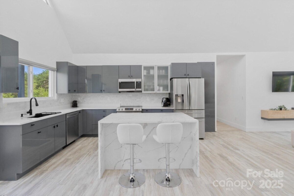 Experience modern living in this custom built home nestled within The Estates of Greenhill, a private gated community just minutes from downtown Rutherfordton, Asheville, and 15 miles to the Tryon International Equestrian Center. Set on 1.32 wooded acres with seasonal mountain views, this 3-bedroom, 2.5-bath residence combines sophisticated design with the warmth of natural surroundings. Step inside to discover an open, airy floor plan filled with natural light streaming through striking triangular windows. The chef-inspired kitchen features solid quartz countertops, a massive extra-wide island with ample storage, and sleek modern finishes—perfect for cooking, entertaining, and enjoying great wine and conversation. A barn door leads to a laundry room with utility sink, while elegant touches like Marlon and quartz counters, rich fixtures, and de-smog mirrors in the primary bath bring refined style to every space. The primary suite also boasts an open-access tiled shower and thoughtful design throughout. Enjoy outdoor living on both a covered front porch overlooking the woods and a spacious back porch ideal for entertaining. The finished walkout basement with French doors adds flexible space for recreation, guests, or a home office. The property’s semi-circular gravel driveway, stylish retractable shades, and peaceful wooded setting enhance its charm and privacy. This home offers the best of all worlds—the serenity of nature, the security of a small, quiet community, and the convenience of nearby shopping, dining, and highway access (I-40 just minutes away). Effective 11/21/25 Seller offering $10K toward buyer's closing costs!