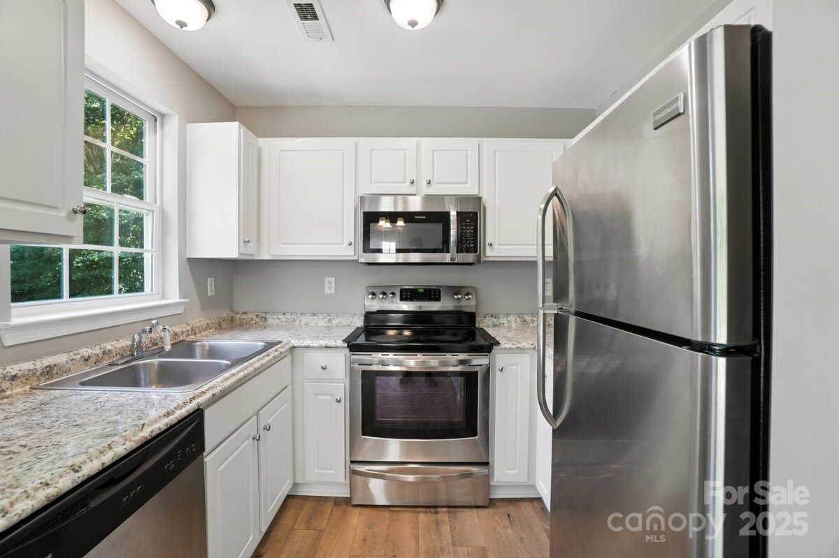 Beautifully Move-In Ready home! wood laminate flooring in main living areas, fresh paint, modern light fixtures, ceiling fans, and a stylishly feel throughout. The primary suite is on the main level, while two spacious upstairs bedrooms feature walk-in closets. Enjoy outdoor living with a private rear patio and attached storage. Located in a booming Charlotte area close to shopping, dining, and entertainment. With its prime location , this home is sure to attract attention—don’t wait, it won’t last long!