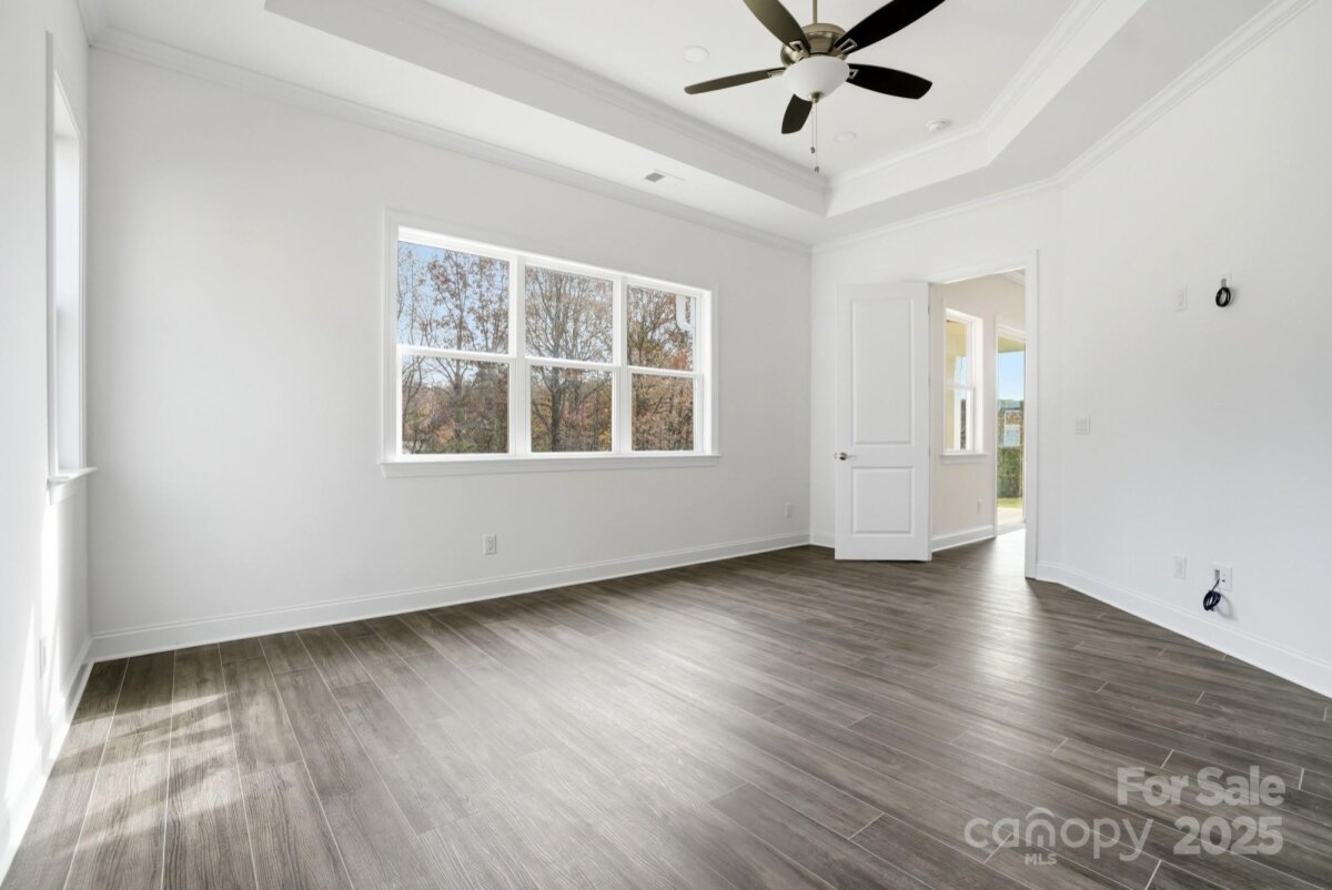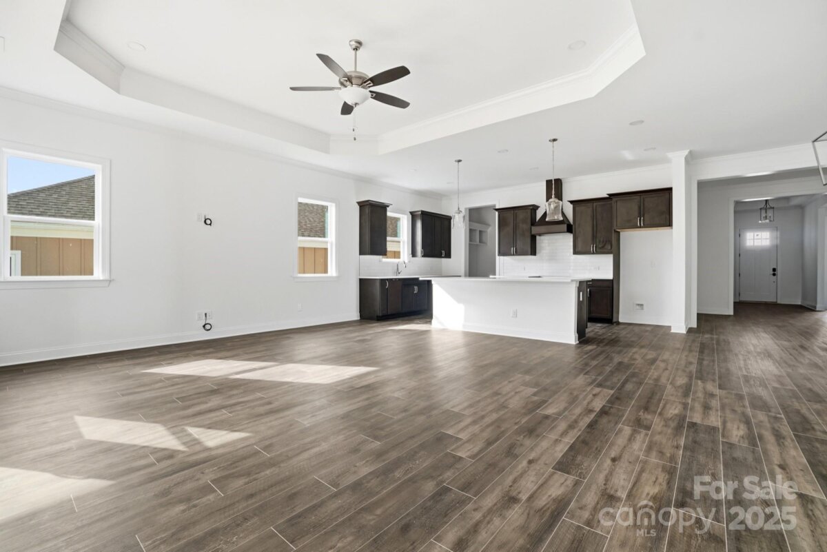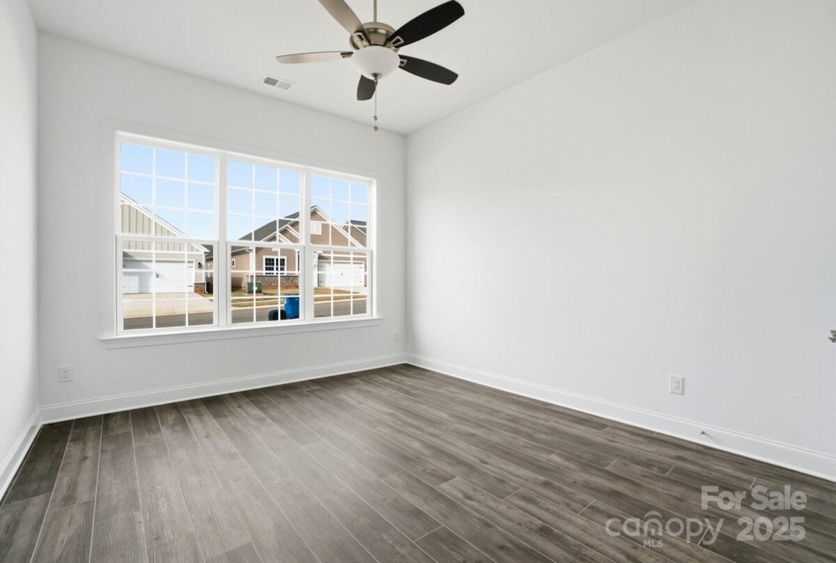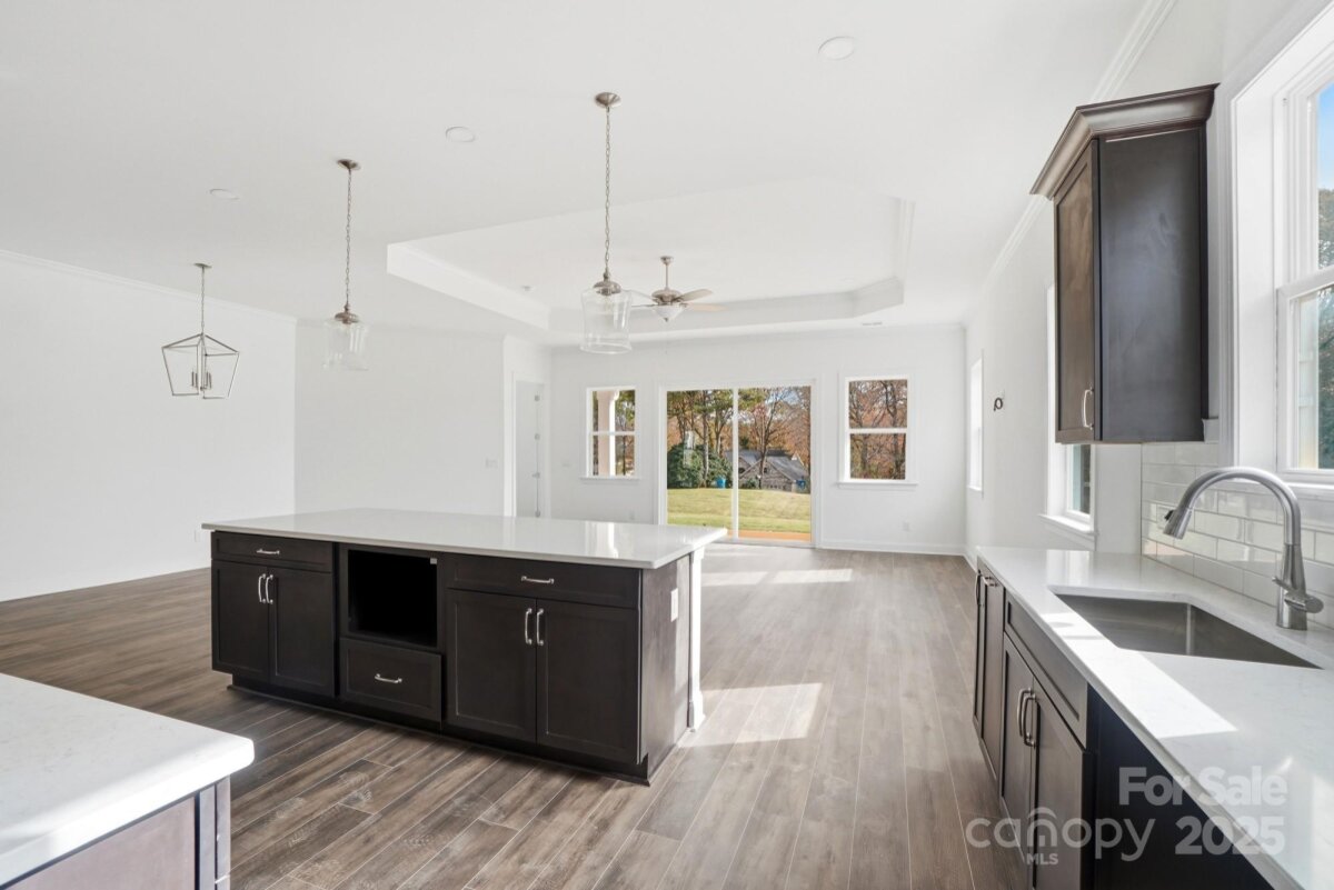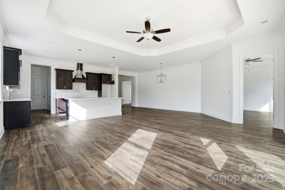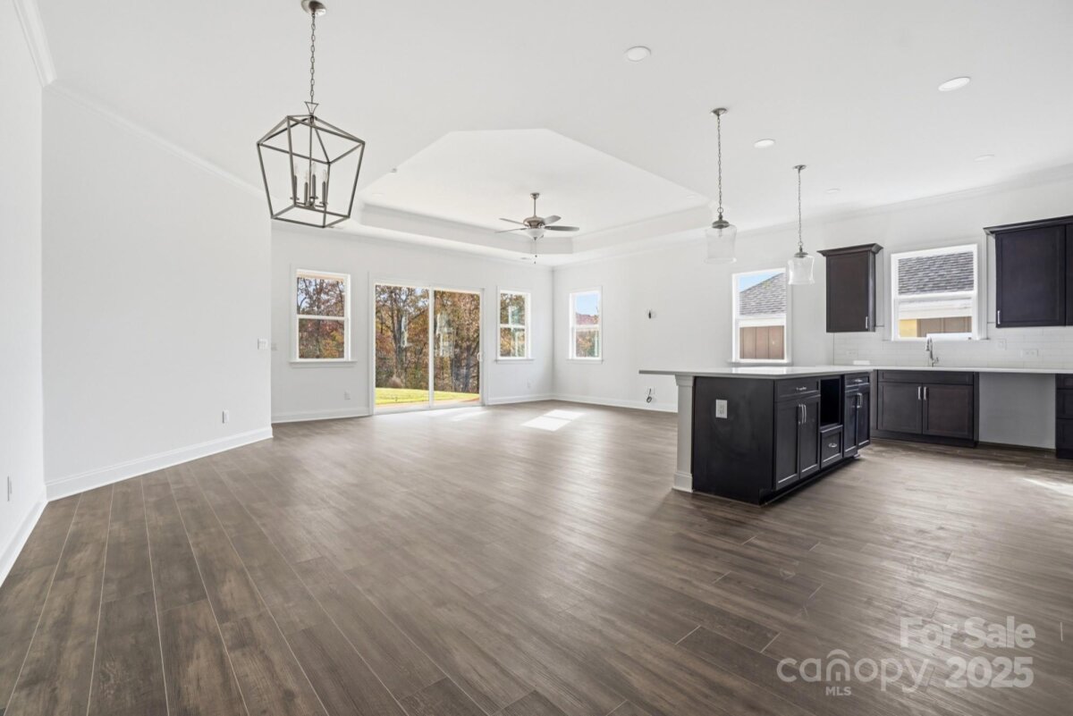Nestled on a quiet cul-de-sac, this inviting 3-bedroom ranch-style home offers an open floor plan, wide hallways, and soaring 10' ceilings for a light-filled, airy ambiance. Enjoy looking out over your spacious yard with with seasonal water views. The open concept living room, features a large glass door that open to a covered rear porch—perfect for savoring the peaceful views. This seamless flow continues into the dining and kitchen areas, ideal for family gatherings and entertaining. The gorgeous kitchen is finished in warm espresso stain and boasts a large island, walk-in pantry, and abundant cabinetry. A convenient mudroom connects the attached 2-car garage to the home for easy everyday living. Retreat to the spacious primary suite featuring a tray ceiling, walk-in closet, water views, oversized walk-in shower and generous vanity. Two additional bedrooms and a full bath provide flexible space for guests, or home office, or hobby room. Enjoy a low-maintenance lifestyle as the lawn care is included!
