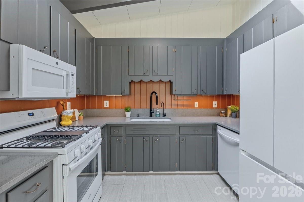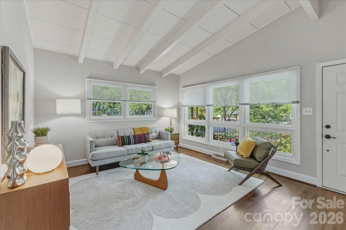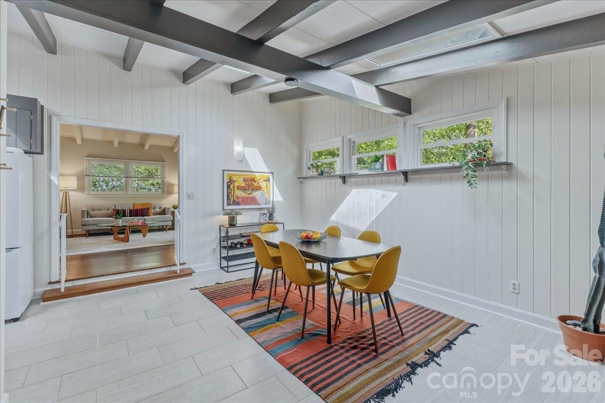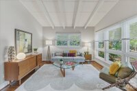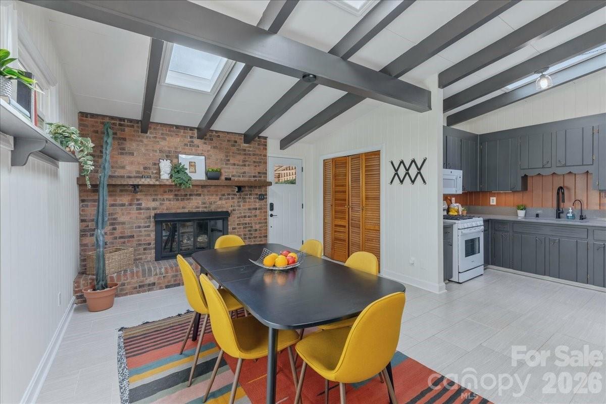 Step inside this Mid-Century gem located on the growing Eastside, only a block from Sheffield Park. This well-maintained home boasts plenty of curb appeal with a modern concrete walkway and front porch overlooking a lush yard with native landscaping. The timeless MCM interior has curated updates with clean lines, brick accents, warm wood tones, vaulted ceilings and exposed beams. The kitchen offers updated quartz countertops and flooring, sleek white appliances, and thoughtfully preserved mid-century cabinetry. Bathroom updates include a beautiful glass shower door, porcelain tile flooring, modern black fixtures, updated vanity top and preserved, re-grouted mid-century wall tile in pristine condition. Other home features include metal roof, updated windows throughout including oversized front picture windows, updated electrical panel, gas fireplace with sprawling brick hearth, skylights in kitchen and dining area, hardwood floors, a brand new HVAC, and a flex space with floor to ceiling shelving that can serve as an office, studio, or third bedroom. Step outside to a serene, one-of-a-kind backyard perfect for gathering or gardening. This oasis for birds and pollinators is fully fenced-in with multiple areas to enjoy. Retreat to the back patio or meander down a stone path to the concrete fire pit area surrounded by greenery. Other outdoor details include bistro lighting, recent tree trimming, additional outdoor electrical outlets, utility closet and a storage shed with power. Walk to nearby Sheffield park for pickleball and playground or connect to the adjacent Evergreen Nature Preserve for trail hiking. Truly a unique and versatile property ready for its new owner!