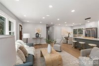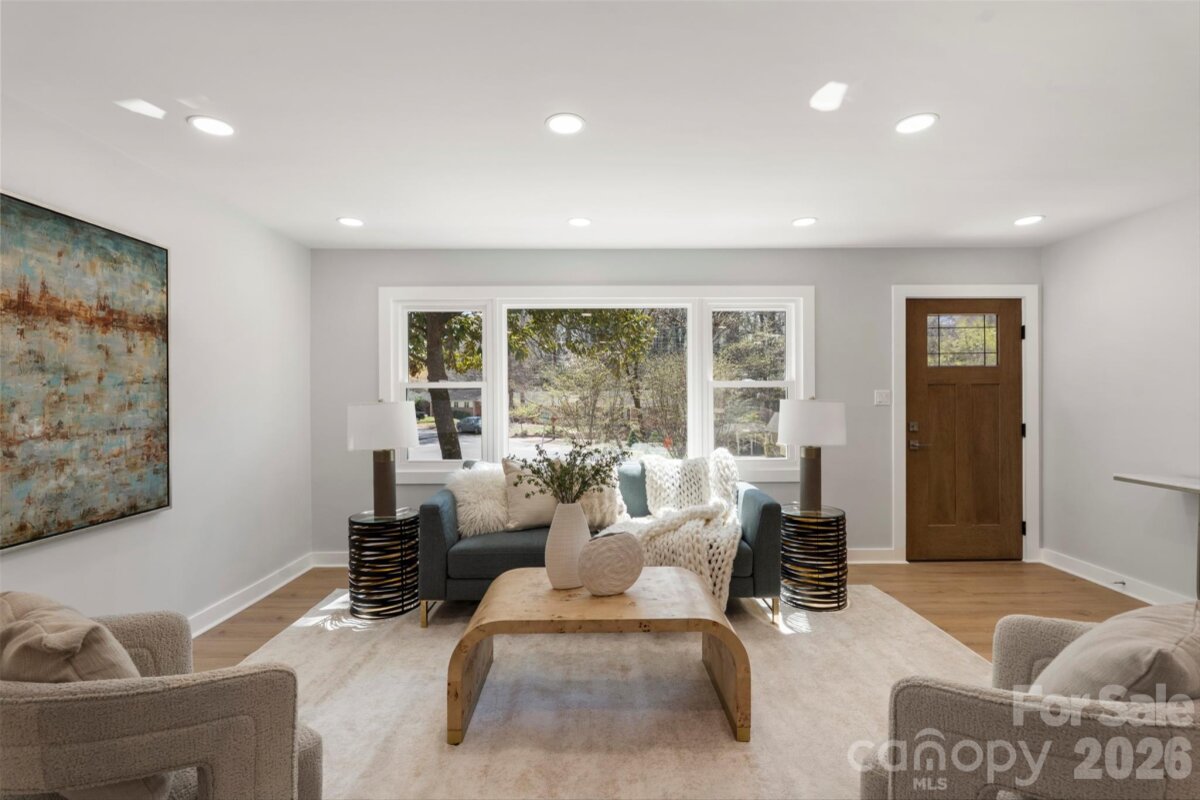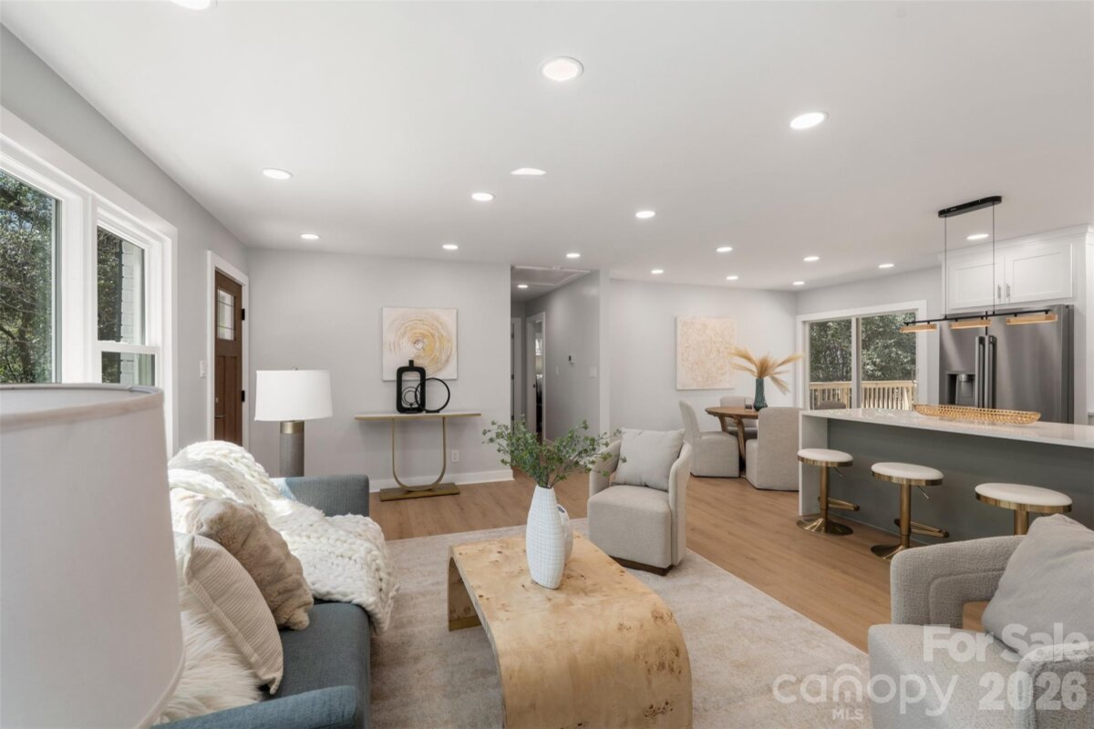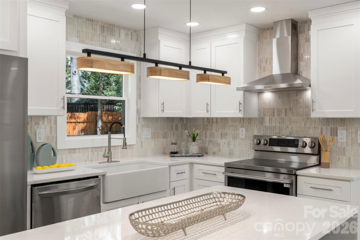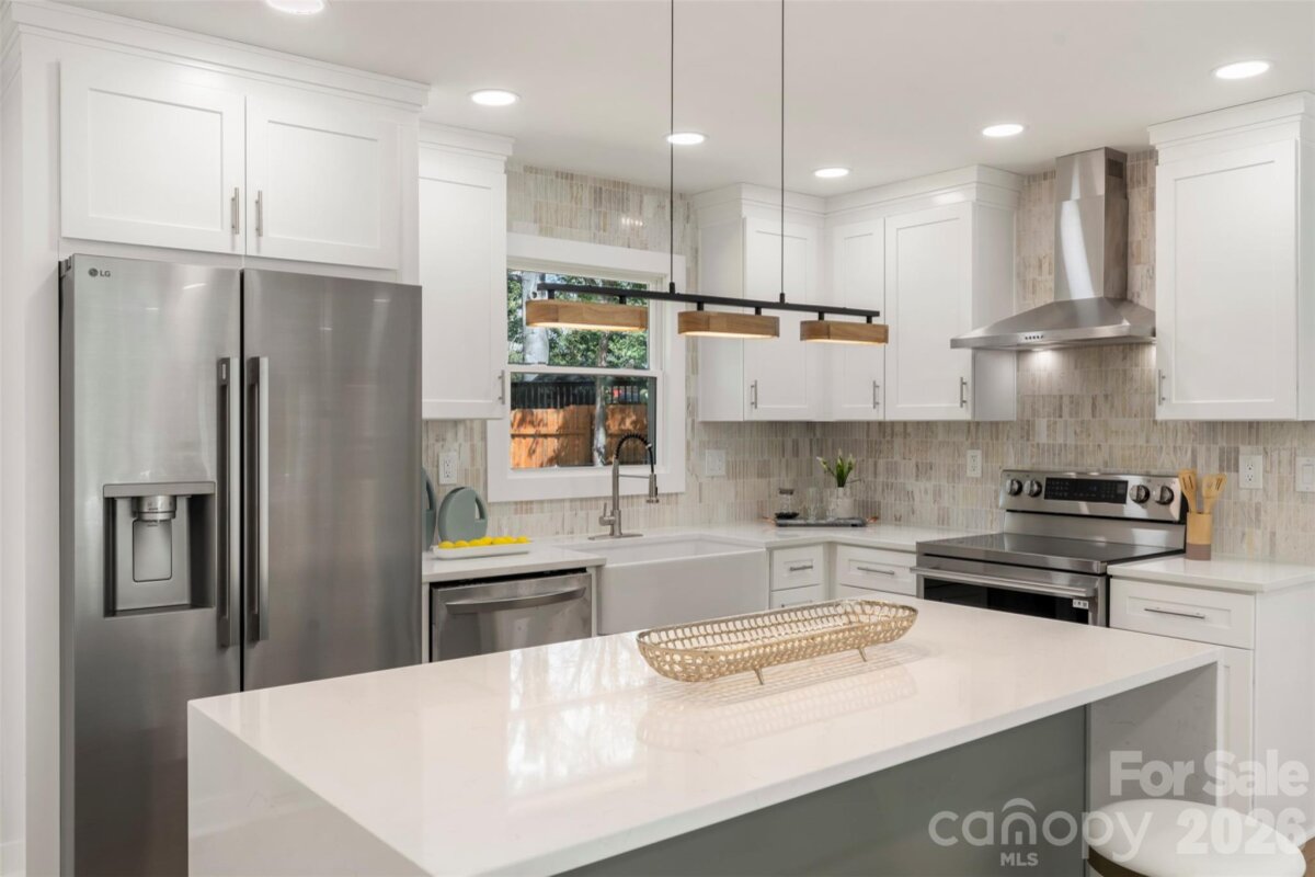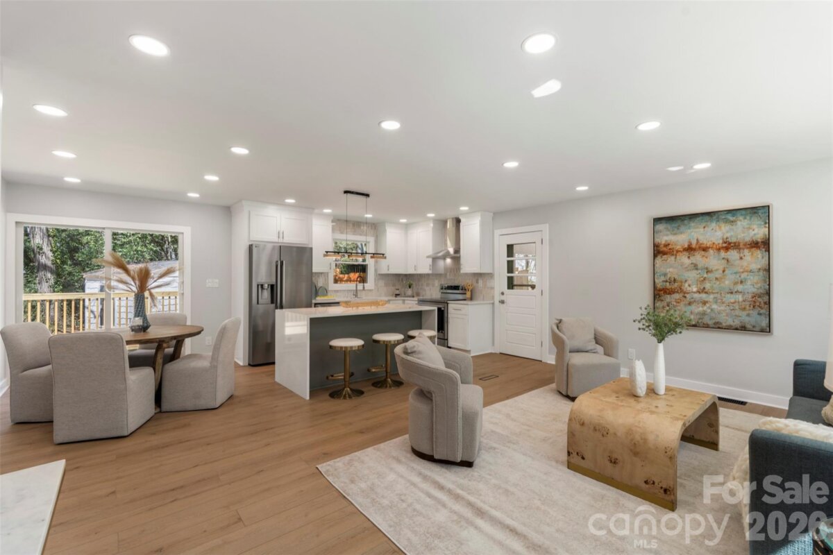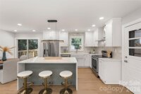 Welcome to this beautifully reimagined ranch-style home, thoughtfully renovated with elevated finishes and modern design throughout. Situated on a spacious corner lot in an established, tree-lined neighborhood, this home blends charm with contemporary living in a highly desirable Charlotte location. Step inside to an open, light-filled layout featuring luxury LVP flooring throughout and a seamless flow between living, dining, and kitchen spaces perfect for both everyday living and entertaining. Expansive windows fill the home with natural light, creating a warm and inviting atmosphere. The designer kitchen is the heart of the home, showcasing brand new cabinetry with custom trim, a stunning waterfall-edge island, stylish tile backsplash, stainless steel appliances, and a farmhouse sink. Enjoy outdoor living on the newly built deck overlooking a private backyard, along with a storage shed for added convenience. A covered carport and extended driveway provide ample parking. Located just minutes from Uptown, shopping, dining, and major highways, this move-in-ready home offers the perfect balance of style, comfort, and location.