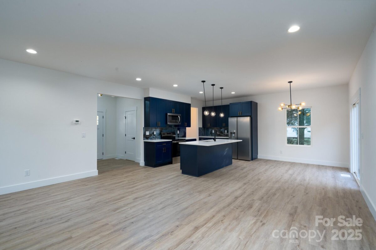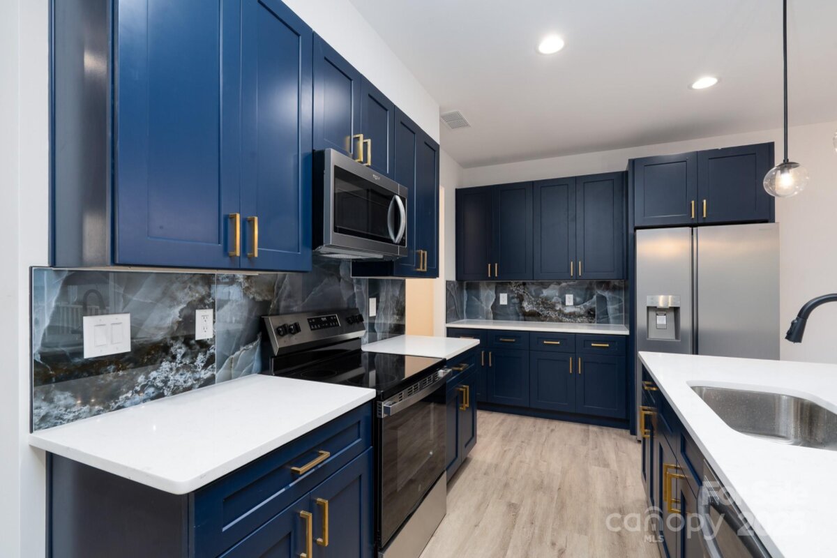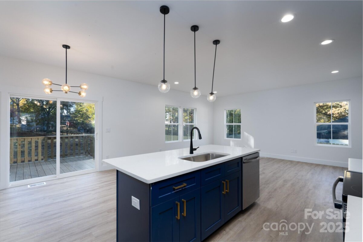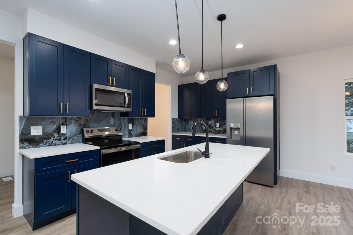 Modern 3BR/2.5BA home with open floor plan featuring a spacious kitchen with large island, custom blue cabinets, and tile backsplash. Main level laundry. Upstairs offers a large primary suite with walk-in closet and custom tiled shower, plus two additional bedrooms and full bath. Stylish design and move-in ready!