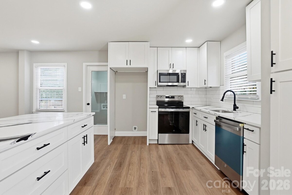 Welcome to this beautifully updated brick ranch located in the highly desirable Shannon Park community. This charming 4-bedroom, 2-bath home features an inviting open floor plan perfect for modern living and entertaining. The fully renovated kitchen showcases 42-inch soft-close cabinets, quartz countertops, tiled backsplash, new appliances, and stylish finishes. Recent updates throughout the home include a New Roof, New HVAC, Water Heater 2023 new flooring, new lighting, fresh interior paint, and updated bathrooms. The generously sized bedrooms provide comfortable living space, while the front and back porches offer wonderful spots to relax. The expansive, flat backyard is ideal for a potential income-producing ADU, perfect for rental income, guest space, or multigenerational living. No HOA means greater flexibility for future improvements. With great curb appeal and prime location in Charlotte, this move-in ready home is one you won't want to miss.