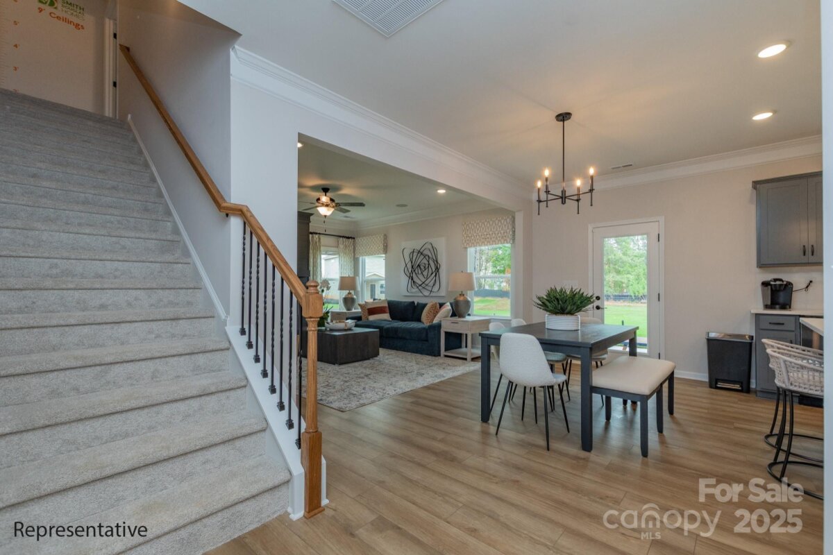 Welcome to the Coleman at Winecoff! Located in the brand-new Winecoff community, this two-story home offers a thoughtfully designed layout with 9-foot ceilings on the main level and an open floor plan that balances style and function, providing the ideal mix of convenience and residential comfort. The first floor features a formal dining room off the entry, leading into the spacious family room and kitchen. The kitchen is equipped with 42" cabinets, quartz countertops, a large island, and stainless-steel appliances. Vinyl plank flooring extends throughout the main level for easy care and durability. A back patio just off the family room provides additional space for relaxing or entertaining. Upstairs, the primary suite includes a walk-in closet, tiled shower, and dual marble vanity. Three secondary bedrooms share a full bath and offer flexibility for family, guests, or a home office. A conveniently located laundry room completes the second floor. Additional highlights include a two-car garage. The Coleman floor plan provides functional spaces for everyday living along with thoughtful details for comfort. The brand-new Winecoff community offers a commuter-friendly location with quick access to I-85, making trips to Charlotte, Concord, or Greensboro convenient. Nearby shopping, dining, and everyday amenities combine with the community’s welcoming setting to provide a perfect balance of accessibility and comfort. With modern finishes, open spaces, and a practical layout, the Coleman at Winecoff is designed to meet today’s needs for style and livability.
