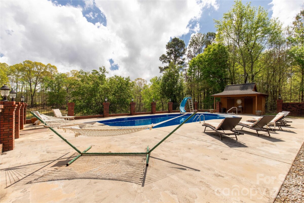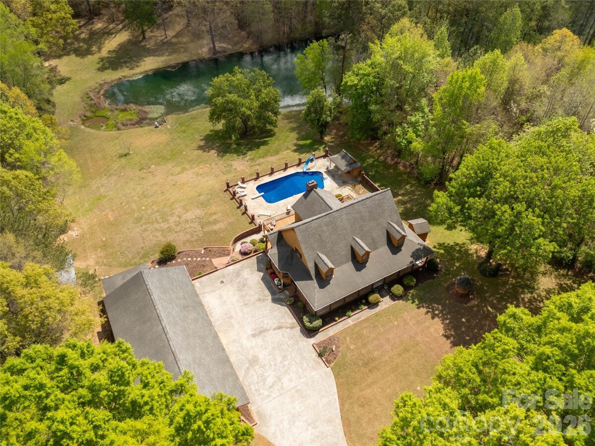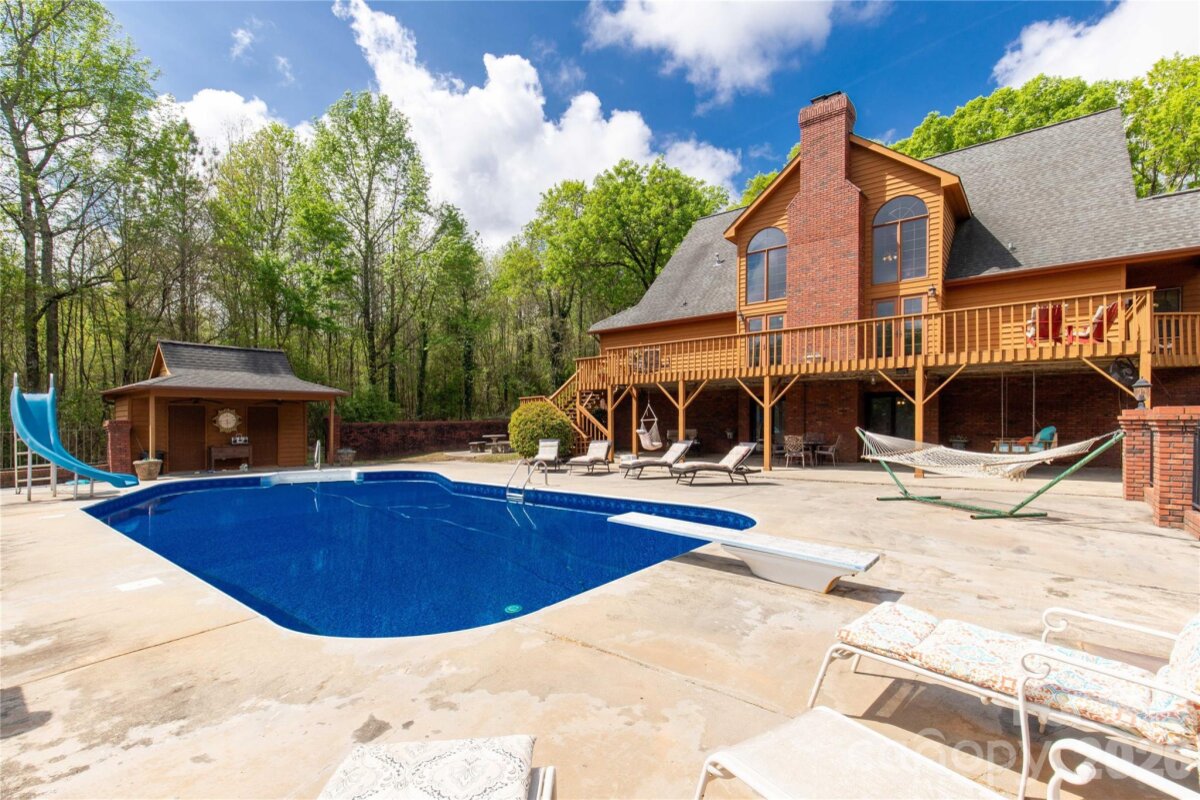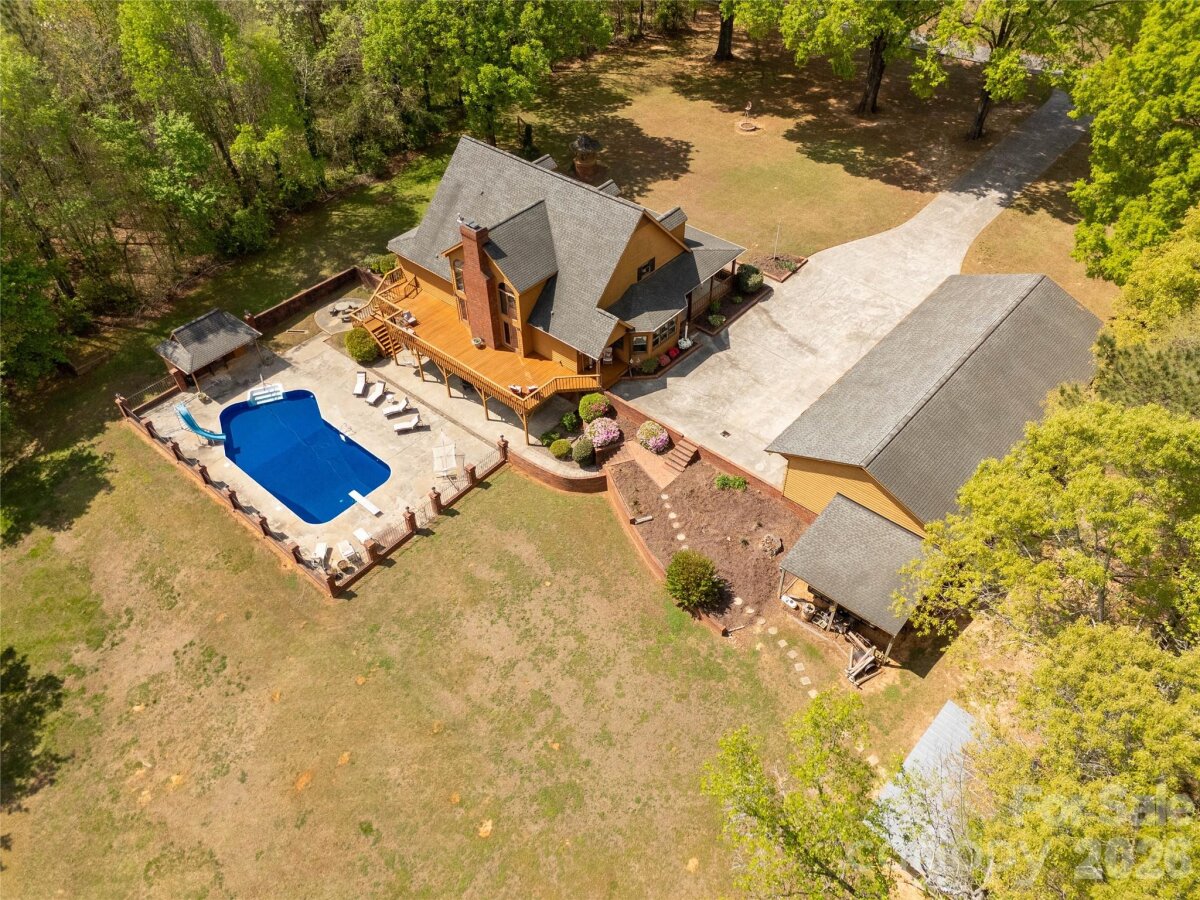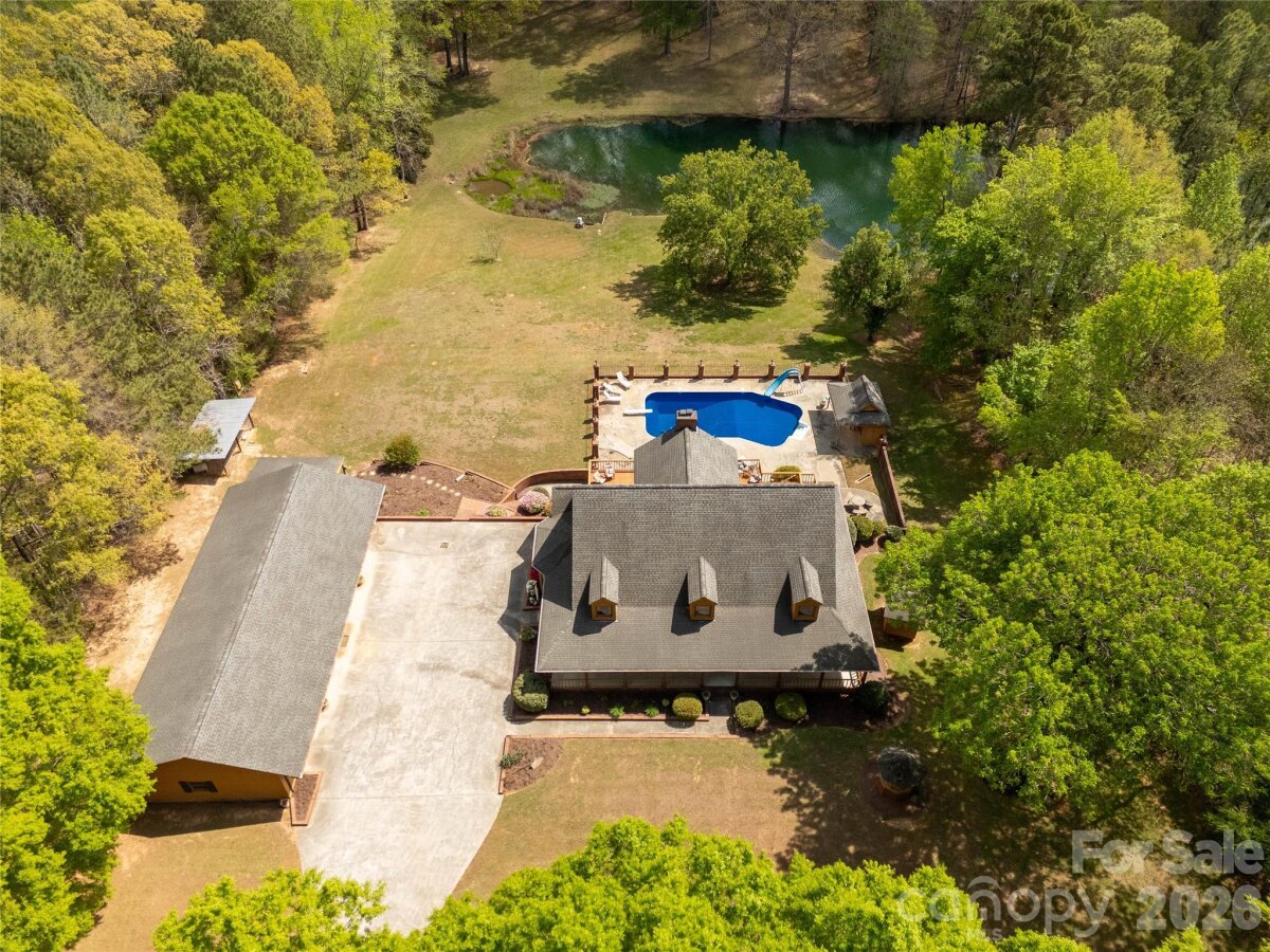 Welcome to a truly rare luxury estate set on over 3 acres, offering more than 5,600 heated square feet designed for those who crave space, privacy, and a resort-style lifestyle. Ideally located just minutes from Charlotte, this exceptional property offers the perfect balance of convenience and seclusion, creating a true private retreat. Tucked into a peaceful setting, this custom wood-sided home makes an unforgettable first impression with its long driveway, manicured grounds, and inviting wraparound front porch—the perfect place to slow down and take in the surroundings, where it’s not uncommon to spot wild turkeys wandering through the backyard. Inside, the home opens to a stunning two-story great room anchored by a statement fireplace and framed by double French doors that lead to an expansive back deck. From here, the view unfolds into a private outdoor oasis featuring a sparkling in-ground pool with a diving board and slide, along with a stocked pond that enhances the serene, getaway-like atmosphere. The main level is thoughtfully designed for both comfort and flexibility, featuring a spacious primary suite that sets a new standard for relaxation with its spa-like bath, complete with a soaking tub, dual granite vanities, built-ins, a large walk-in ceramic shower, and the added luxury of two walk-in closets. The main floor also includes a well-appointed kitchen and a flexible bedroom or office space, making it ideal for remote work or guests. Upstairs, two additional bedrooms, a full bath, and a loft overlook the pool and pond, creating a picturesque setting for a second living area, reading nook, or media space. The walk-out basement is perfectly suited for extended living or entertaining, offering an expansive recreation room with built-in trophy and display cases, a wet bar, billiards area, fireplace, half bath, and a dedicated workout room. With direct access to the pool deck, this level provides excellent potential for multi-generational living, guest quarters, or a private retreat within the home. Outdoors, the property continues to impress with a large back deck, a beautifully maintained fenced yard, and carefully curated landscaping accented by brick columns, hardscaping, and wrought iron details. Additional structures include a pool house, a four-bay detached garage, and dog kennels, providing both functionality and flexibility for a variety of lifestyles. With walk-in attics, custom built-ins throughout, and every detail designed with intention, this home offers the perfect blend of luxury, space, and versatility. For those seeking a private estate with acreage, a pool, a pond, and room to accommodate multi-generational living—all within minutes of Charlotte—this is a rare opportunity to own a property that truly feels like a destination.