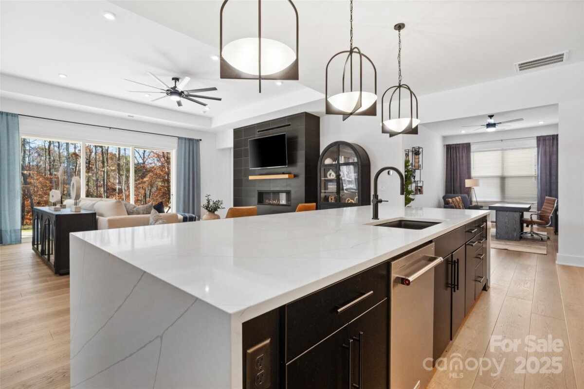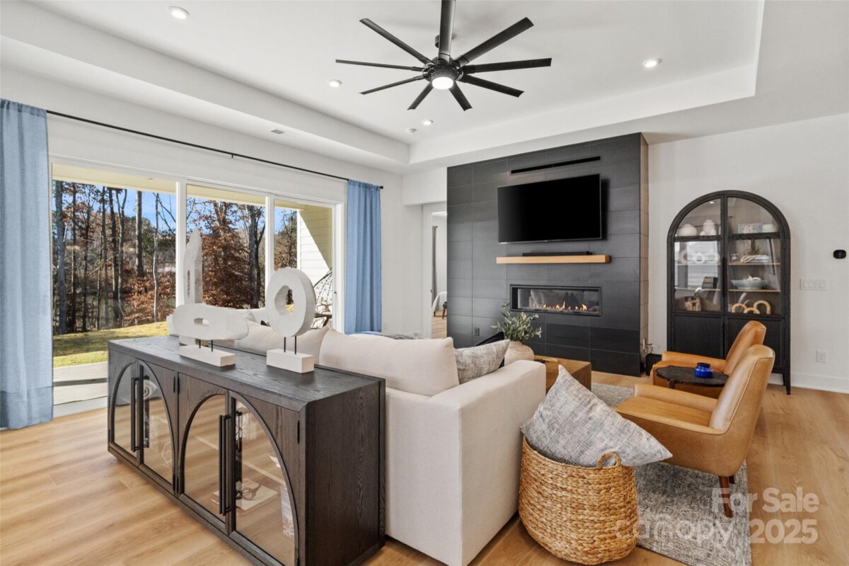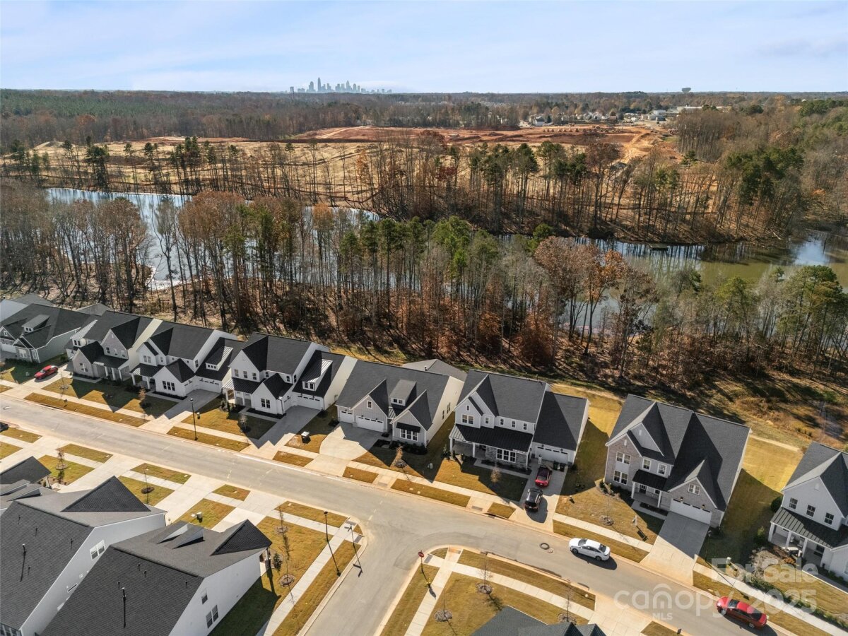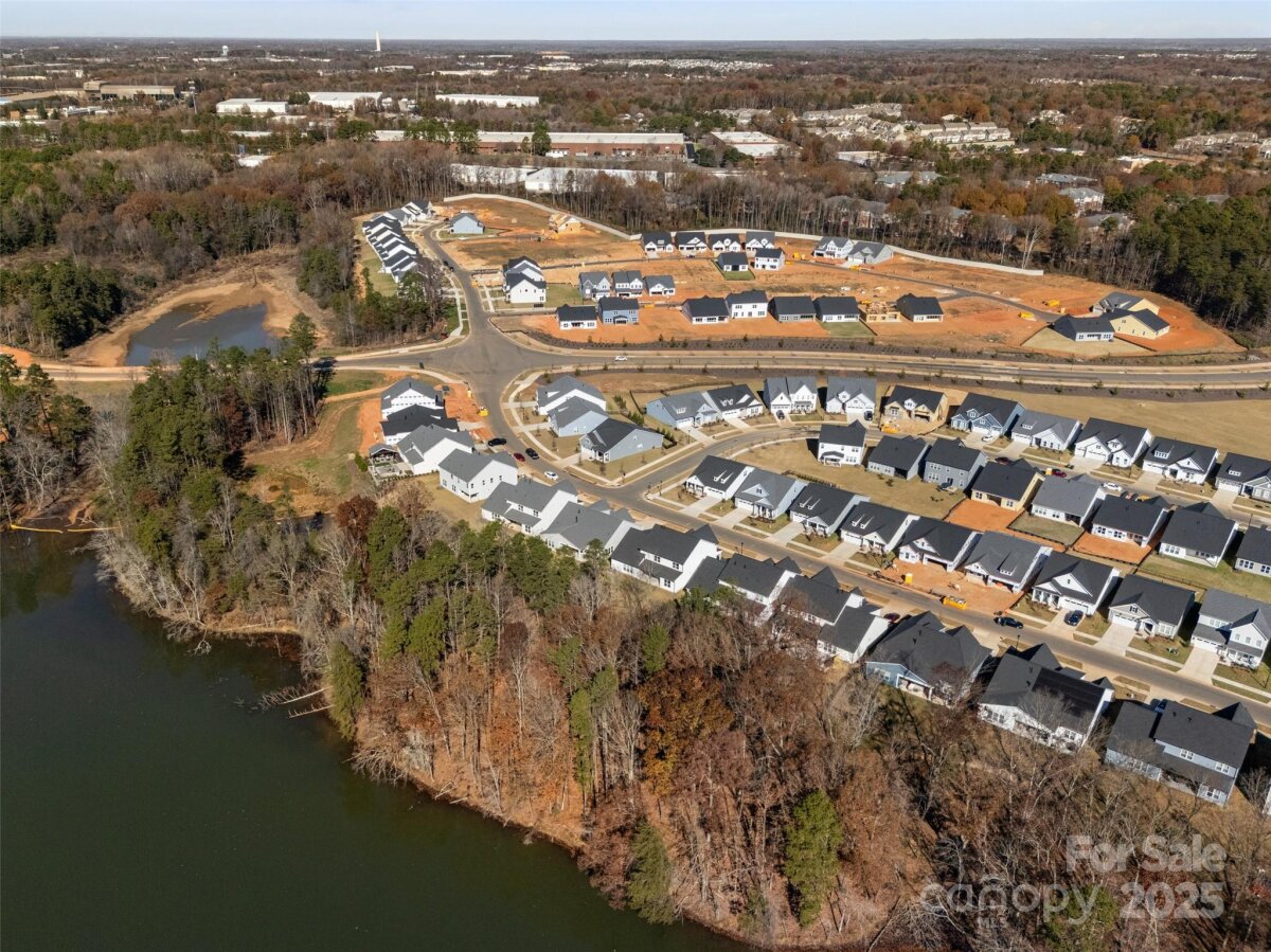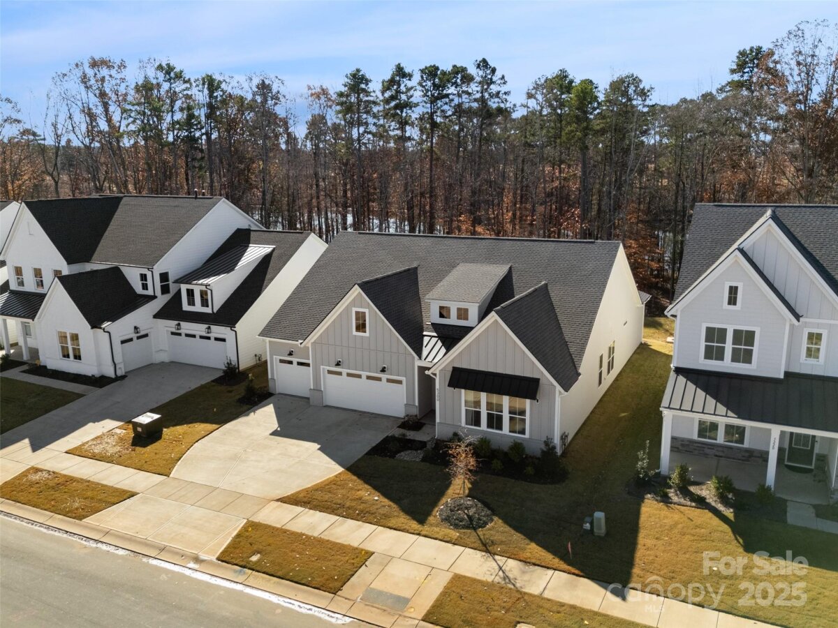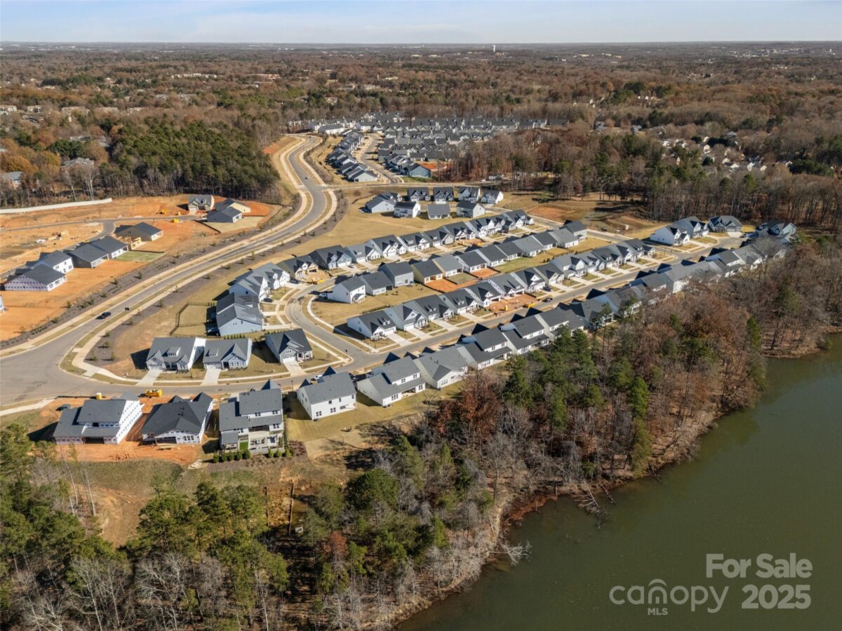 Waterfront 3 bed, 2.5 bath, 2648sf, newly constructed dream home with 3 car garage on an oversized Waterstone Collection lot in Griffith Lakes! Heavily and tastefully optioned “Ronelle plan†2025 build with a light and bright open floorplan centered around a massive chef’s kitchen/living room combo featuring high ceilings, custom lighting, and luxury vinyl throughout. KitchenAid stainless appliances, upgraded pendants above a gigantic 12’ quartz waterfall island overlooking the casual dining and family rooms featuring a coffered ceiling, matte back floor to ceiling tiled linear gas fireplace and multi stacked slider open to the covered patio with spectacular nature and water views. Elongated entryway separates guest bedrooms with connected bath, powder room and office/den.Private rear facing primary suite includes large walk-in closet, double vanity bath, separate water closet, and frameless glass enclosed, zero threshold shower with bench and wave-look origami tile to ceiling. Office, powder room and remaining split plan bedrooms/shared bath separated by elongated entryway. Convenient fully built out interior laundry room features cabinets and sink. HOA covered lawncare. Located a short walk from the soon to be completed Griffith Lakes clubhouse featuring tennis, pickleball, pool, spa, dock/access to lake and miles of hiking trails. Conveniently located across from shopping and within minutes from both Uptown Charlotte and the Lake Norman areas!