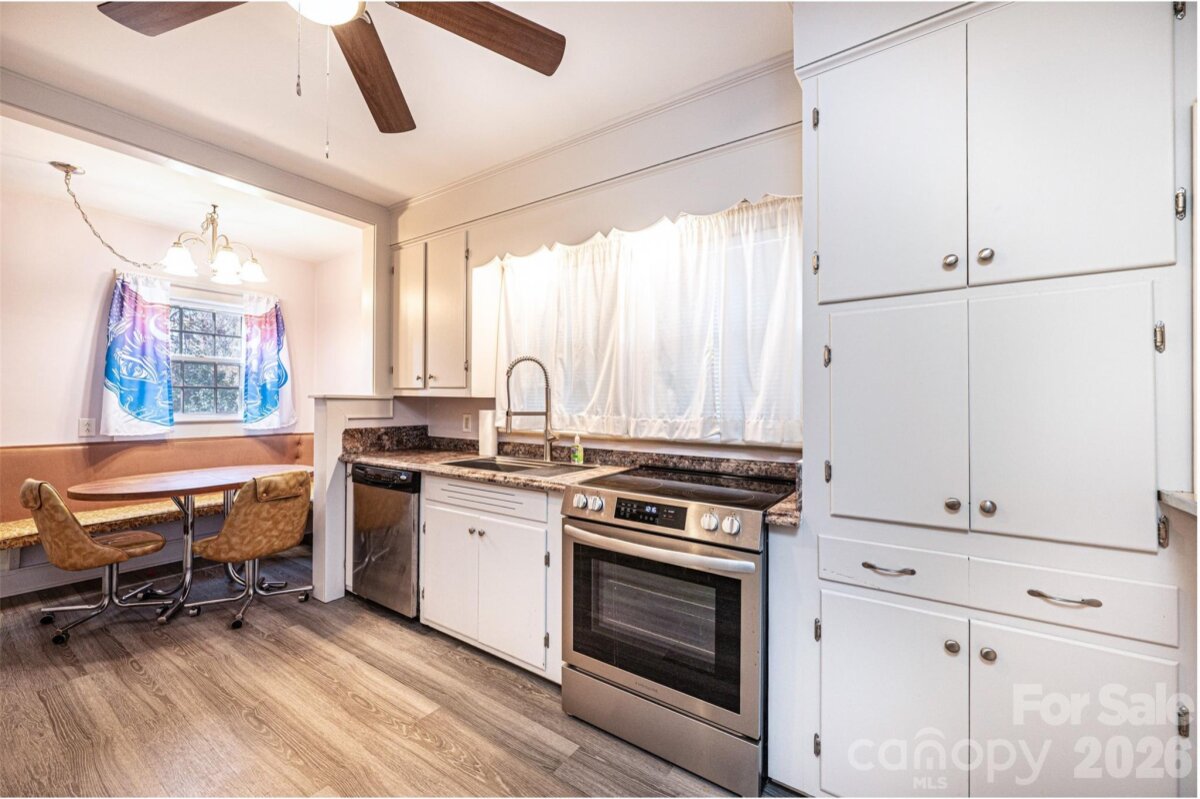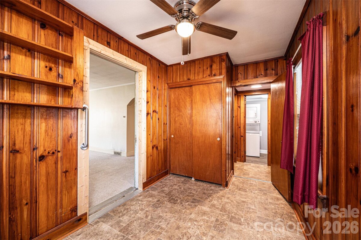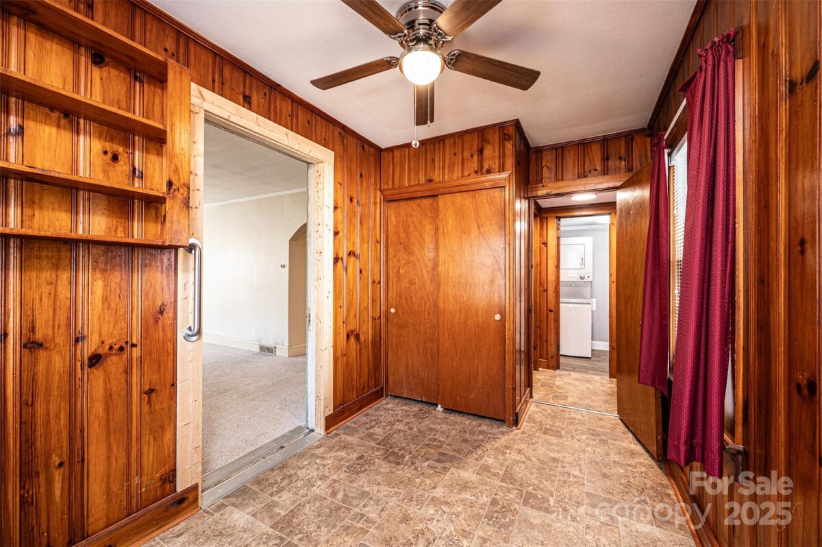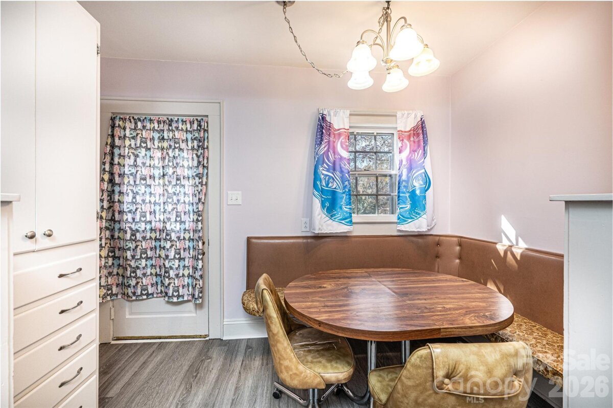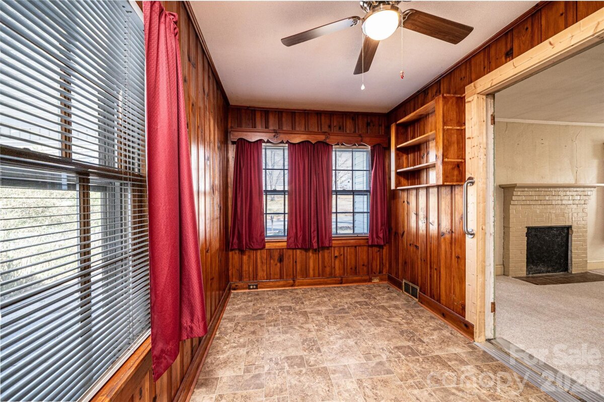 DOLLAR S-T-R-E-T-C-H-E-R! You can't afford NOT to consider this one! Vinyl siding/trim Bungalow PLUS an ADJOINING VACANT LOT! 3BR/1.5BA; huge LR off of foyer has space for everyone; BR1 right off LR has real wood panelling & trim; half BA has stackable washer/dryer (conveys); den/formal DR has pass thru window into kitchen, built-in cabinets/shelves, plus a large closet; kitchen was remodeled in 2024 w/LVP flooring, removed cooktop/wall oven & added laundry hook ups & new elec range, kit also has a DW, ref, & built-in pantry cabinets; breakfast nook in kitchen has cute built-in dining booth & door to side porch; 2 other large BRs plus a full BA & a cedar lined closet round out the main level! Partial unfinished basement has concrete flrs. 200 amp circuit breaker service. 2024 elec water heater. 2016 gas pack/CA. 3-4 years ago power lines were moved underground. Additional lot to the left has a huge concrete pad for future use, as well as a lg concrete bbq pit/brick hearth that would make a great fire pit area! Sold As Is.