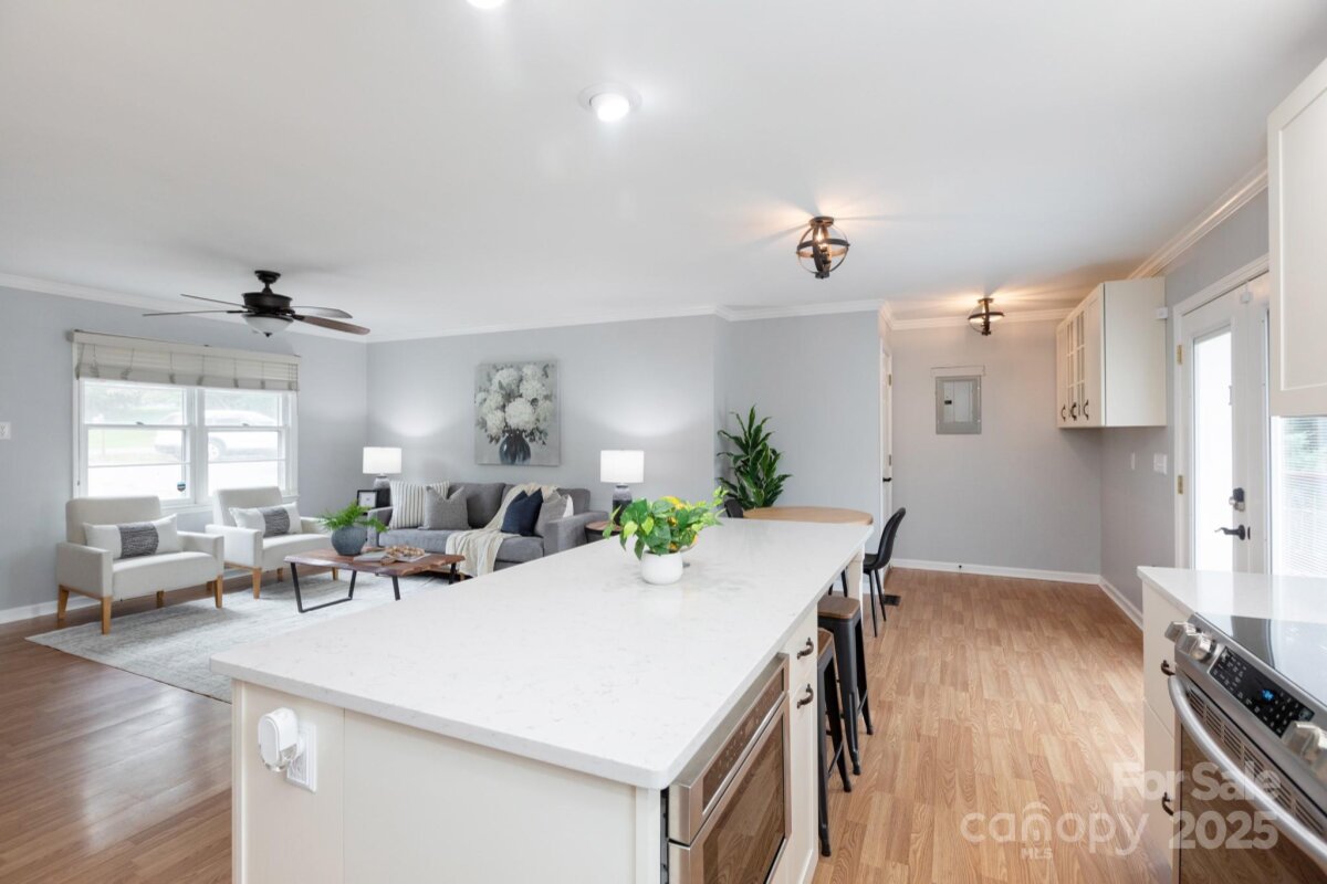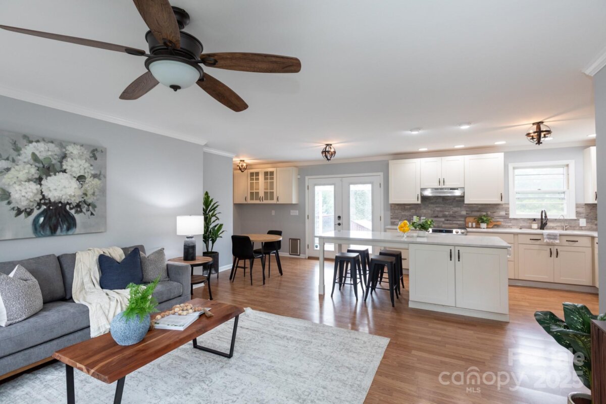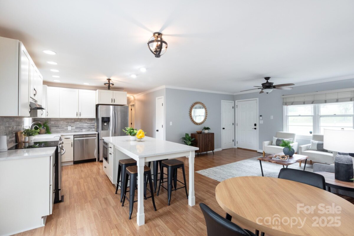 Discover the charm in this updated ranch, set on nearly a half-acre with a spacious fenced-in yard. Inside, the open floor plan creates an easy flow between the kitchen and living room—perfect for both everyday living and entertaining. The kitchen features crisp white cabinetry, sleek countertops, and stainless steel appliances, including a built-in microwave in the island with seating. Soft-close drawers and thoughtful storage add a touch of convenience to the modern design. Just off the kitchen, the living room provides a bright, welcoming space to gather. With 3 bedrooms and 1 full bath, this home offers a comfortable layout with plenty of charm. Step outside to enjoy the deck overlooking the expansive backyard, ideal for relaxing evenings or weekend cookouts. Move-in ready and full of character, this home checks all the boxes for style, space, and outdoor living.