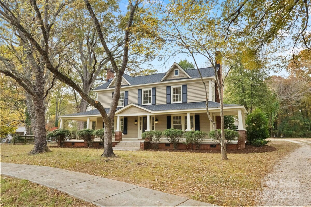 Discover one of Mint Hill’s rare historic treasures, an early farmhouse with deep local roots and thoughtful updates that honor its past while supporting comfortable everyday living. Built in the late 1800s and recognized as one of the oldest remaining homes in Mint Hill, this property offers timeless character, authentic craftsmanship, and a setting that feels both storied and inviting. The home features brand new white oak hardwood floors throughout the main level, fresh interior and exterior paint, and beautifully refreshed landscaping that highlights the charm of the wraparound porch and classic L-shaped design. Many original elements remain, including wood siding walls, period windows and doors, and handmade brick fireplaces that showcase the craftsmanship of the era. The layout includes generous living areas, historic architectural lines, and a spacious detached garage with attic storage. Thoughtful system updates provide peace of mind, including a new roof in 2024, furnace replacement in 2023, and outside condenser unit and ductwork replaced in 2021. The property sits on a large fenced lot with mature trees, offering room to gather, garden, and enjoy outdoor living. Conveniently located on Hwy 51, the home offers quick access to downtown Mint Hill shops and restaurants, and is just minutes from the new Ezell Community Park scheduled to open nearby. This property presents a unique opportunity for those who appreciate historic homes, authentic detail, and a rich sense of place. Experience a landmark piece of Mint Hill history that has been cared for across generations and thoughtfully prepared for its next chapter.