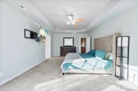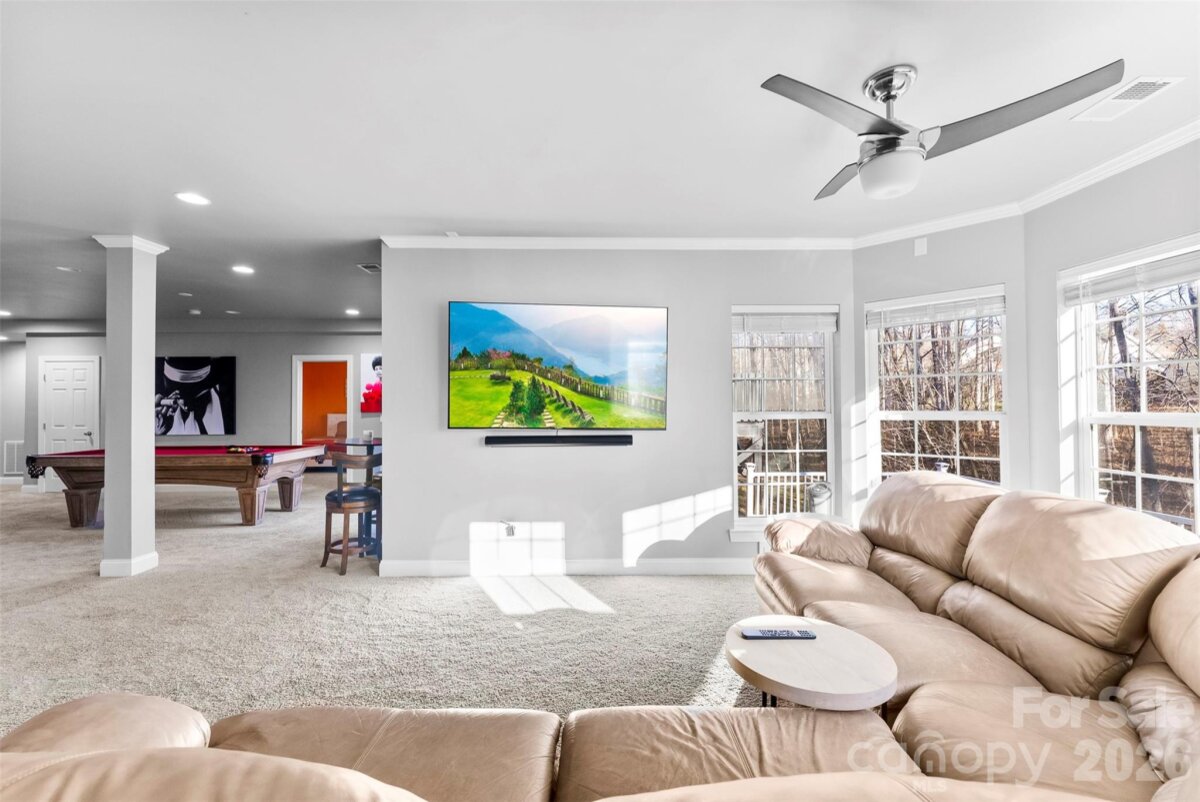 Spacious colonial located in the highly sought after city of Huntersville. This home features nearly 5,000 sq ft with 5 bedrooms, 5 full Baths, and a fully finished basement! Tons of room for all of your needs. Primary suite on main level along with a 2-story great room opened to the kitchen and breakfast area. Attractive dining room and living room/study. 3 additional bedrooms, 2 full baths and a huge flex room on upper level. Basement has kitchen area, bedroom and full bath along with numerous areas/rooms for sitting, eating, games, media and exercise options. Covered rocking chair front porch and spacious tiered decks in rear. Private lot with trees behind. Located in Carrington Ridge with community pool, playground and green spaces. Close to Birkdale Village shopping and dining, Lake Norman schools and an easy drive into Uptown Charlotte. Schedule your showing today!