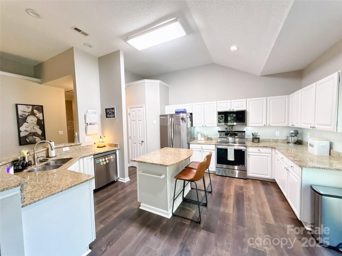Welcome to this beautifully updated 4-bedroom, 2-bath home offering approximately 2,248 sq ft of thoughtfully designed living space on a .258-acre lot. With a brand-new roof, updated HVAC, newer appliances, and luxury vinyl plank flooring throughout, this home is move-in ready with peace of mind for years to come. The inviting floor plan features vaulted ceilings and abundant natural light, creating an open and airy feel. A spacious kitchen with granite countertops, center island, and stainless steel appliances flows seamlessly into the dining area and living room. The living room showcases a stunning fireplace making it the perfect gathering spot. The private owner’s suite offers a spa-like retreat with a dual vanity, soaking tub, and separate glass-enclosed shower. Three additional bedrooms provide flexibility for family, guests, or a home office. Outside, the yard is a true blank canvas—ready for you to design your own outdoor oasis, whether that means a garden, play area, patio, or peaceful retreat. Located in a sought-after golf course community, residents enjoy premium amenities including multiple swimming pools, playgrounds, pickleball courts, a beer garden, and year-round neighborhood events. Conveniently situated for a short commute to Charlotte or Concord and other nearby cities, with shopping, dining, and schools just minutes away. Don’t miss your chance to own this updated, move-in ready home with exceptional amenities and an unbeatable location!