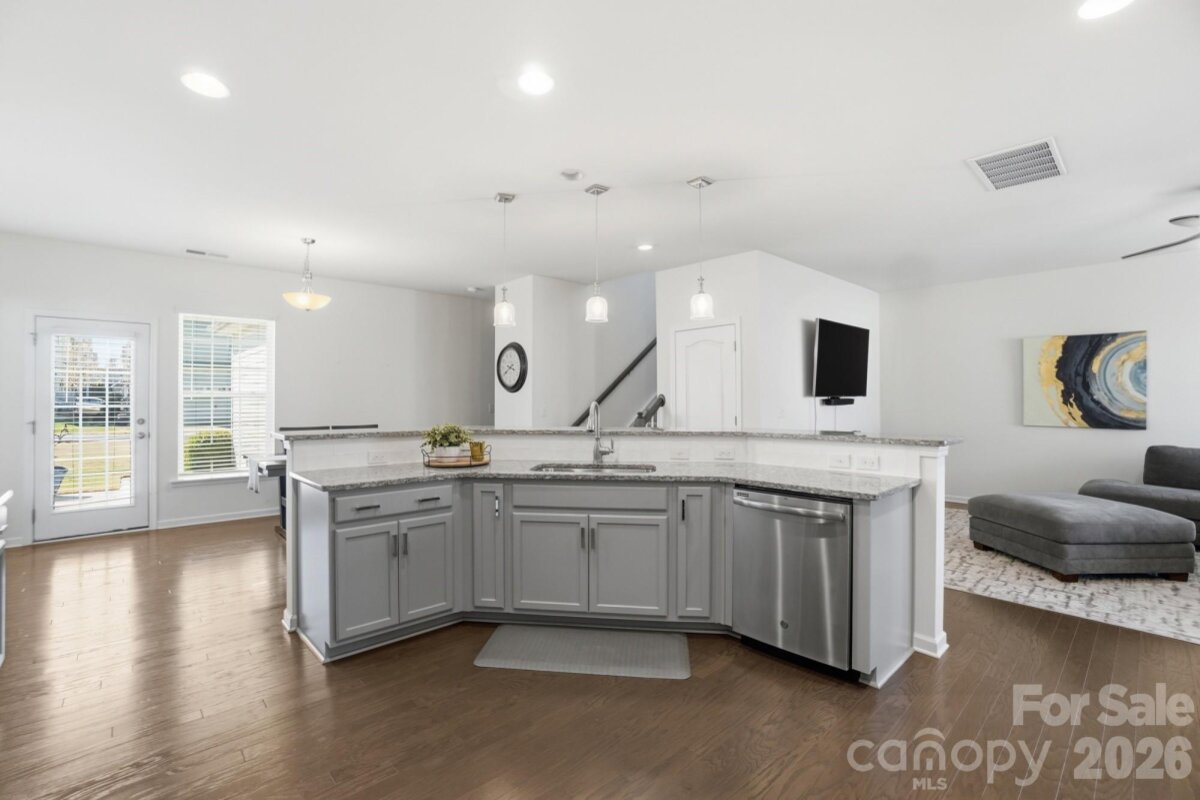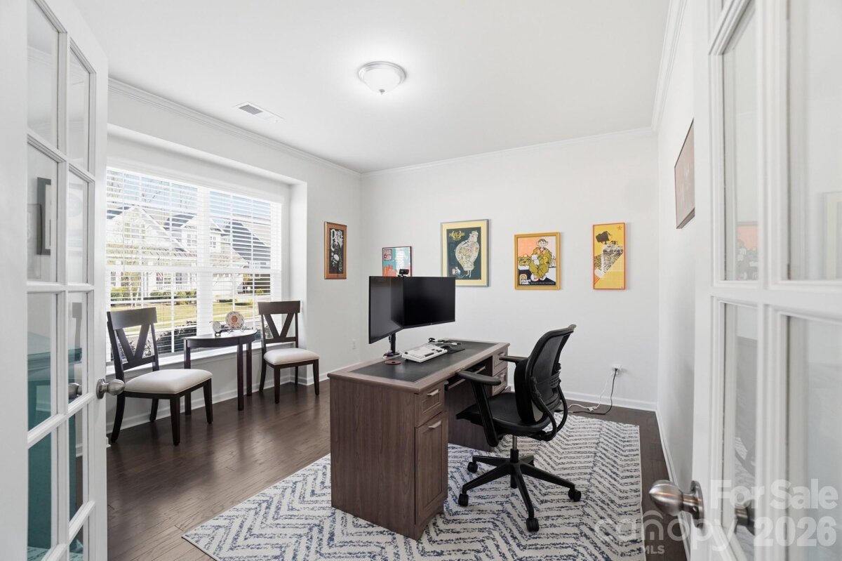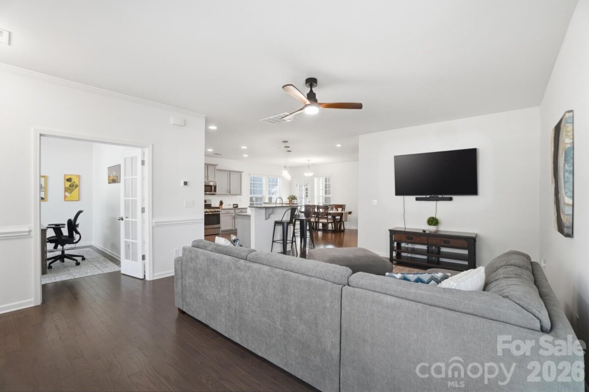 Welcome to Cameron Creek in desirable Tega Cay! Step into this beautifully designed 3-bedroom, 2.5-bath home featuring an open-concept layout that’s perfect for both everyday living and entertaining. A dedicated main-floor office with French doors, elegant moldings, and fresh neutral paint throughout adds both charm and functionality. The gourmet kitchen is a standout, complete with a large island, stainless steel appliances, tile backsplash, walk-in pantry, and e-zone workspace—all seamlessly opening to the living and dining areas. A versatile flex room offers endless possibilities, whether you need a home gym, playroom, or additional office space. Upstairs, spacious bedrooms provide comfort and ample storage, while additional storage areas on both levels make organization effortless. Hardwood flooring runs throughout the main living areas, adding warmth and style. Enjoy the home’s stone-accented exterior and inviting front porch—perfect for relaxing evenings. A rear-load 2-car garage adds convenience, and the community offers fantastic amenities including a pool and playground, all just minutes from shopping and dining.