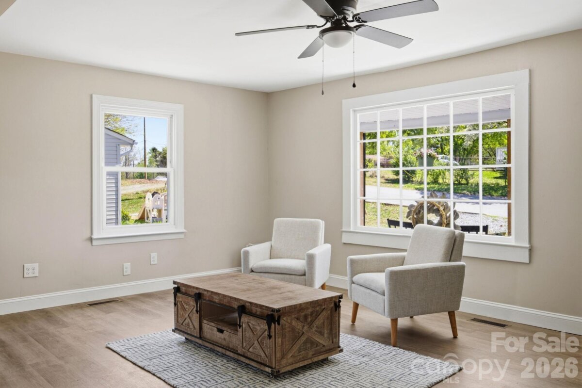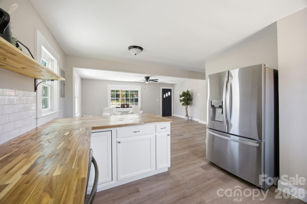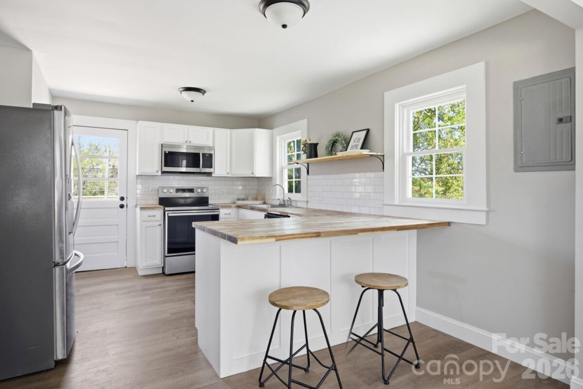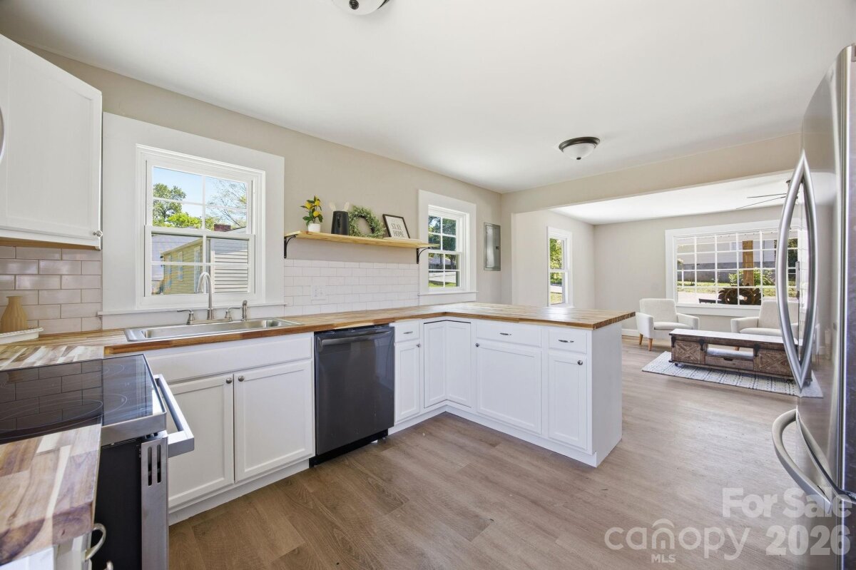 Welcome home to this beautifully updated 3-bedroom, 1-bath gem, perfectly tucked away on a quiet dead-end road! Thoughtfully renovated from top to bottom, this home offers peace of mind with a new HVAC system, new plumbing, updated electrical, new roof, new siding, and a new water heater. Step inside to find stylish LVP flooring throughout, fresh neutral paint, new interior doors, and modern light fixtures that create a bright, inviting atmosphere. The completely updated kitchen features brand-new cabinets, butcher block countertops, and new appliances—perfect for everyday living and entertaining. Enjoy your morning coffee on the charming covered front porch with wood columns, or unwind on the spacious new back deck overlooking the yard. With its convenient location close to shopping, dining, and everyday essentials, this move-in-ready home combines modern updates with comfort and charm—ready for its next owner to enjoy!