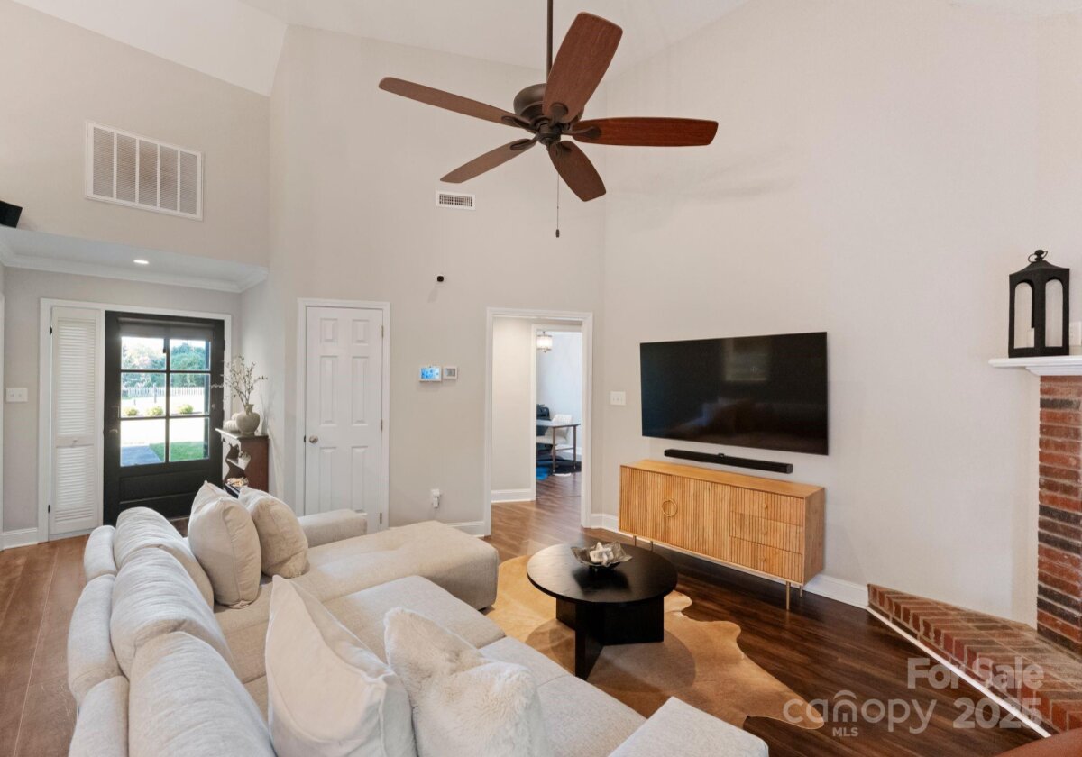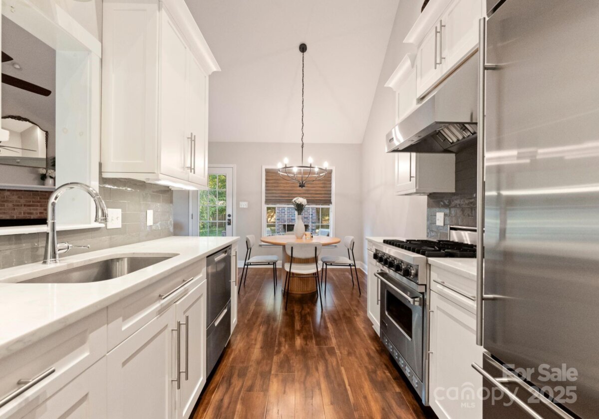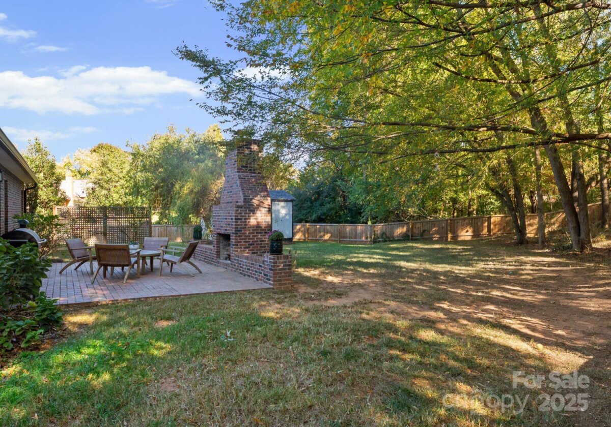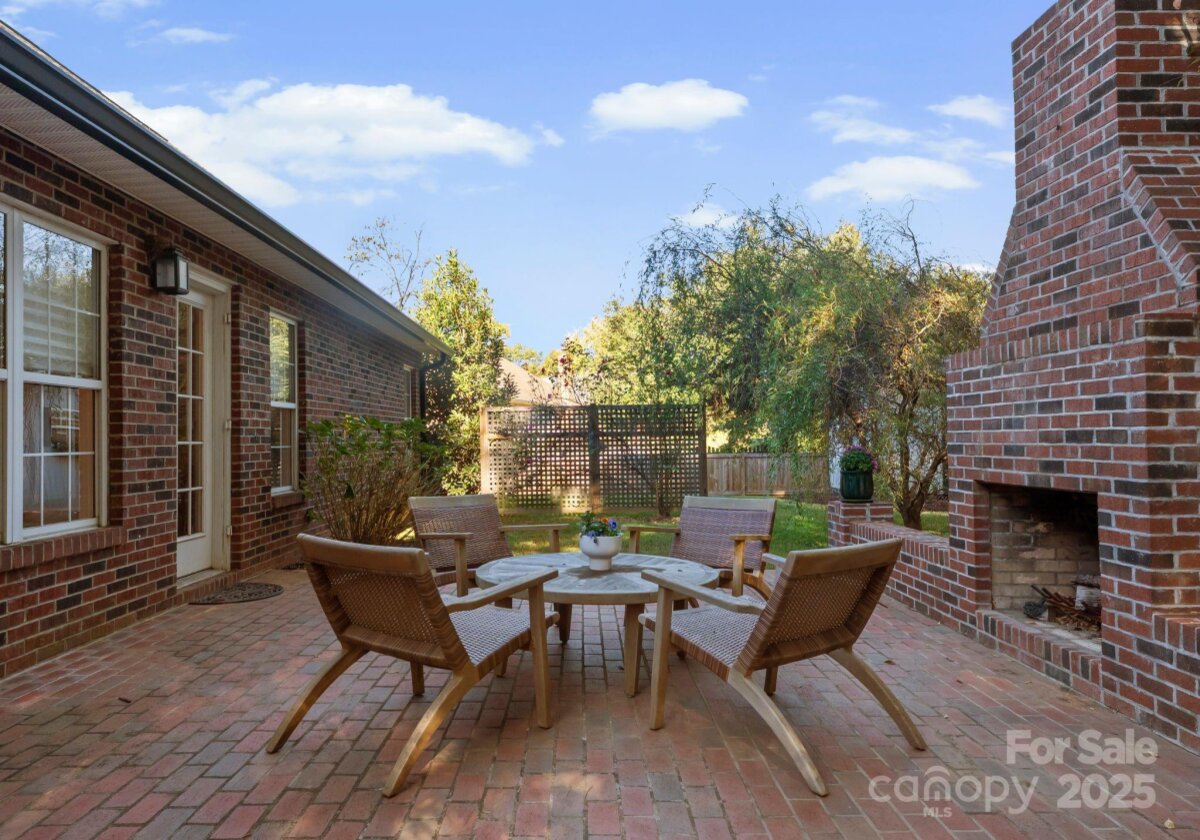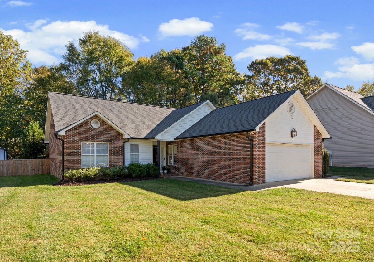 Charming Custom Full-Brick Ranch Just Minutes from Downtown Mooresville! This beautifully updated home offers an inviting blend of craftsmanship and comfort. Step inside to soaring cathedral ceilings and wide-plank rich laminate flooring that flows throughout. The family room features a cozy gas-log brick fireplace, opening to a stunning fully renovated kitchen complete with quartz countertops, tile backsplash, soft-close custom cabinetry, and high-end appliances—including a Viking gas cooktop and electric oven, Viking vented hood, Paykel dishwasher, and GE stainless refrigerator. The spacious primary suite showcases tray ceilings, updated lighting, a luxurious ensuite with a tiled shower, soaking tub, and a walk-in closet outfitted with custom cabinets and drawers. Two additional bedrooms and a beautifully updated full bath complete the interior. Enjoy the outdoors year-round in the large, fenced backyard featuring an expansive brick patio and a wood-burning brick fireplace—perfect for entertaining. A sizable storage shed offers additional convenience. With a prime location close to shops, dining, and downtown Mooresville, this home truly has it all! **Roof is 2016, HVAC 2017, Tankless water heater, 2016 Dual Furnace, fence installed 2023**
