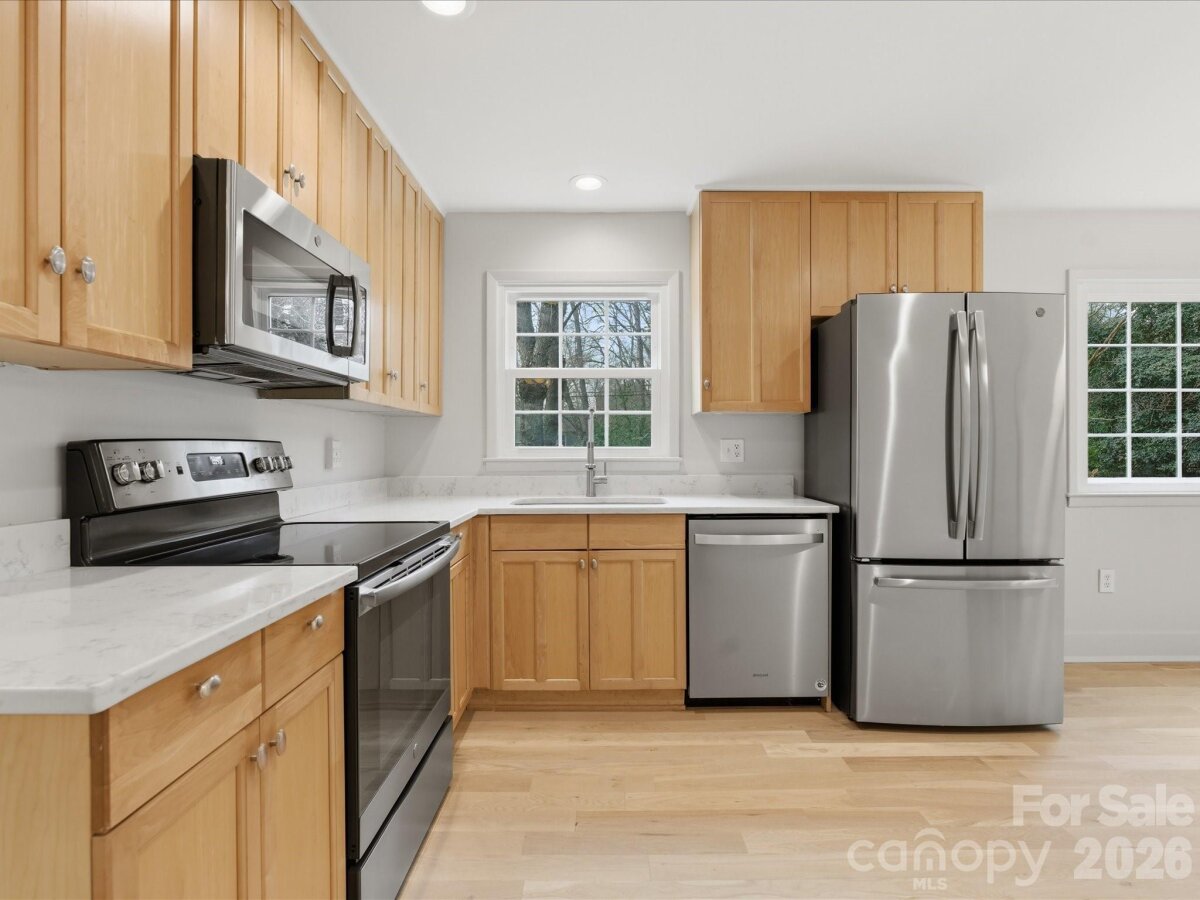 COMING SOON AND WON’T LAST! Welcome to this stunningly remodeled all-brick 3BR/2BA home in the desirable Stonehaven/NoRa area. Craftsman-Nordic fusion. Blends timeless character with modern updates. Checks all the boxes: pristine and fresh, move-in ready, designer finishes, outdoor living including a basketball court, close to amenities, room for entertaining, fenced yard…and located in one of Charlotte’s most trending neighborhoods. Incredible remodel includes: opened up kitchen and breakfast rm ‘25, tile in 17x24 addition, 4-in REAL wood white oak plank flrs up/down ‘25, new full bath down ‘25, quartz kitchen with gorgeous cabinets, encapsulated crawlspace ‘24. Den/office could be 4th BR. Heavy base trim molding added throughout. Utility room with a convenient back entry to driveway parking. Designer colors inside create a bright clean palette throughout. Each bedrm and master retreat is spacious. Major systems have been addressed for true peace of mind: ‘23 HVAC, ‘21 gas wtr htr. Come prepared to fall in love, relax and enjoy carefree living with a party-ready grilling patio and professionally refreshed landscape—perfect for entertaining this summer. Large fenced backyard backs to trees. Across the street from members-only RaMa Swim & Racquet Club and just 1m to McAlpine Greenway, 2m to Cotswold Village shopping and dining, and only 3m Novant Health Presbyterian Medical Center. A rare opportunity to own a like-new home in an established neighborhood rich with charm and convenience.