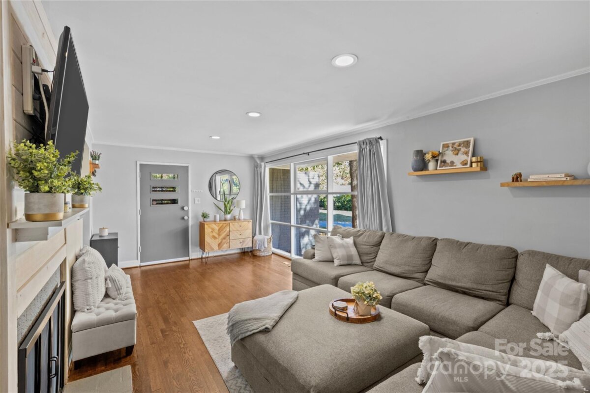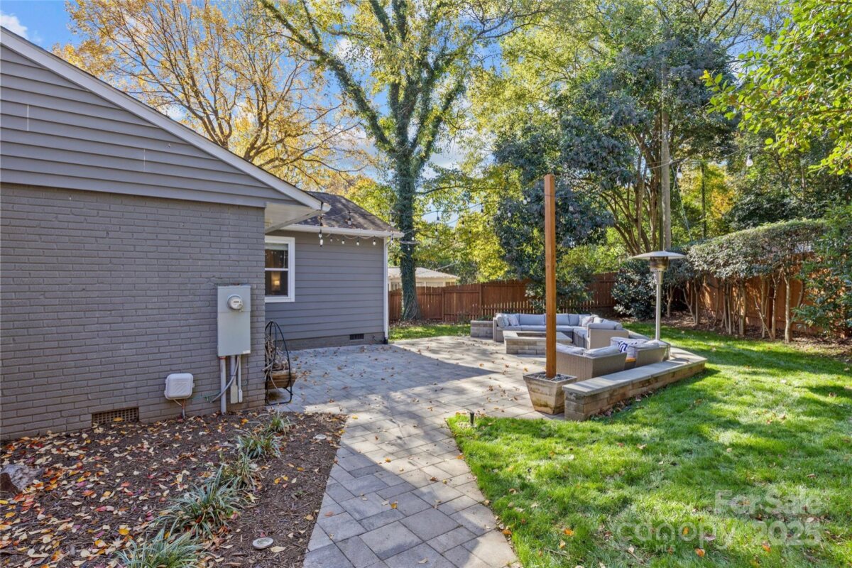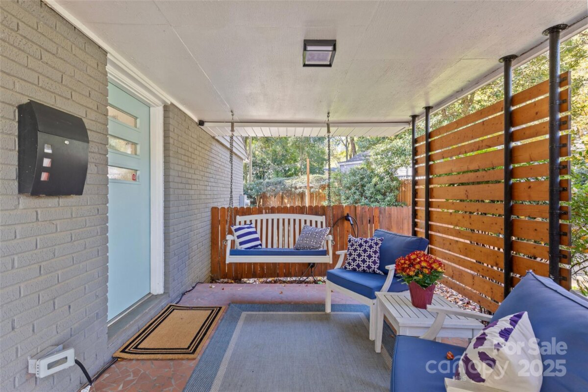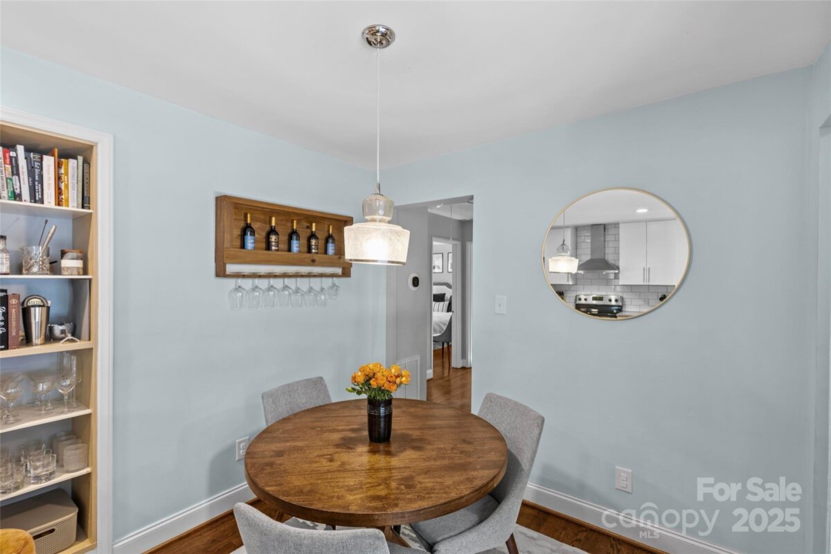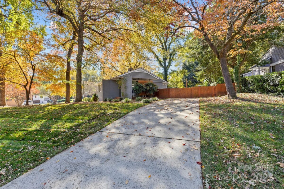 Mid-Century Charmer Meets Modern Living! This beautifully updated contemporary ranch sits proudly on a large corner lot, blending mid-century character with modern updates. Beautiful hardwood flooring flows throughout the open floor plan, highlighted by the dramatic floor-to-ceiling front windows, creating a bright and inviting atmosphere. Fully updated in 2017, the kitchen features sleek quartz countertops, stainless-steel appliances, and a dedicated dining area, perfect for everyday living or entertaining guests. The primary suite impresses with a large walk-in closet and a luxurious en-suite bath featuring double vanities and a subway-tile walk in shower with a glass door. Lastly step outside to a cozy side patio, ideal for morning coffee or quiet evenings, or enjoy the fully fenced backyard with a stunning hardscaped patio—perfect for bonfires, outdoor movie nights, and gatherings under the stars. Roof, HVAC, hot water heater and several windows all from 2017. Located in popular Collingwood you are minutes from Southend, Park Rd shopping center, and walkable to the neighborhood park plus Woodlawn light rail station!