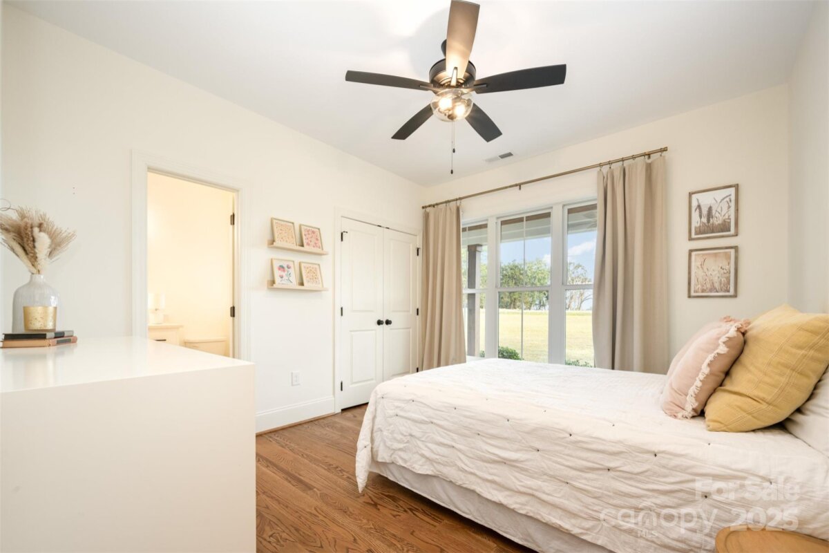 Experience the perfect blend of modern luxury and timeless farmhouse elegance at 6322 Olive Branch Road. Nestled on 8.59 picturesque acres, this stunning two-story home welcomes you with a rocking chair front porch and inviting double-door entry. Inside, warm wood floors flow seamlessly through the open-concept main level, where a formal dining room connects effortlessly to the designer kitchen and spacious living room—ideal for entertaining and everyday living. The gourmet kitchen boasts custom cabinetry, a large island, sleek countertops, and an impressive walk-in pantry with abundant storage. A massive laundry room with built-in cabinets and sink adds both convenience and style. Primary suite serves as a private retreat featuring a spa-like ensuite bath with double vanities, soaking tub, and walk-in shower, along with a custom walk-in closet designed for organization and elegance. Additional bedroom with ensuite and a powder room complete the first floor. Upstairs, the expansive loft offers a versatile second living area, two additional bedrooms and one full bathrooms complete the upper level, providing comfort and privacy for family and guests. Thoughtful details continue throughout, including two walk-in attic spaces for easy storage solutions and an extended back patio complete with an outdoor kitchen and fire place, perfect for outdoor gatherings and evenings under the stars. Enjoy the peaceful beauty of the surrounding landscape, highlighted by a tranquil pond and open acreage offering endless possibilities for recreation or future expansion. With its exceptional craftsmanship, refined finishes, and serene setting, this remarkable property embodies upscale country living at its finest—where every feature has been designed to enhance both comfort and style.
