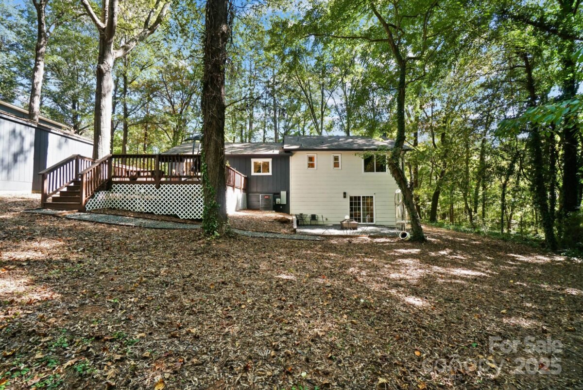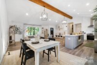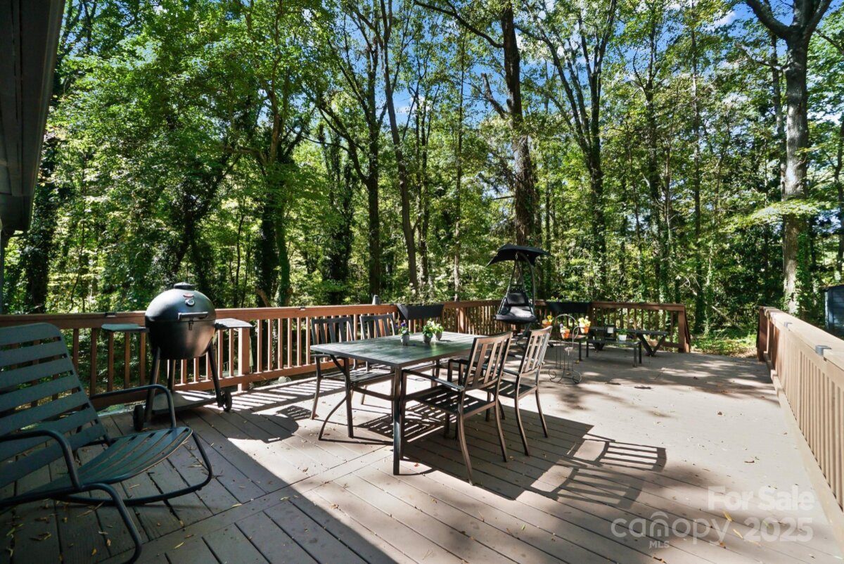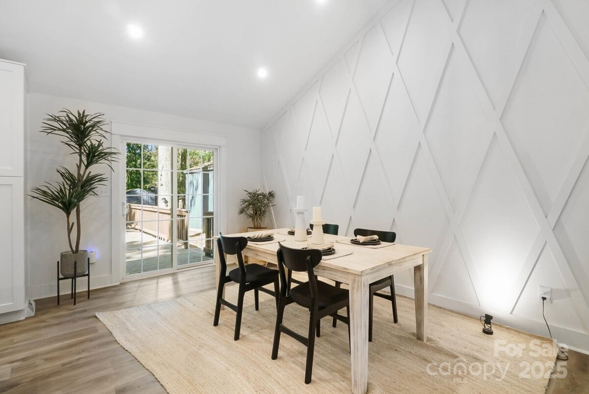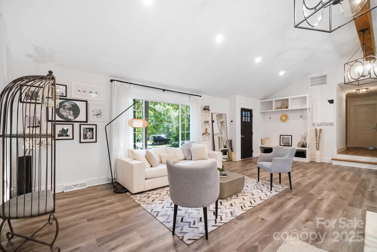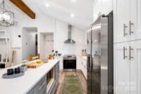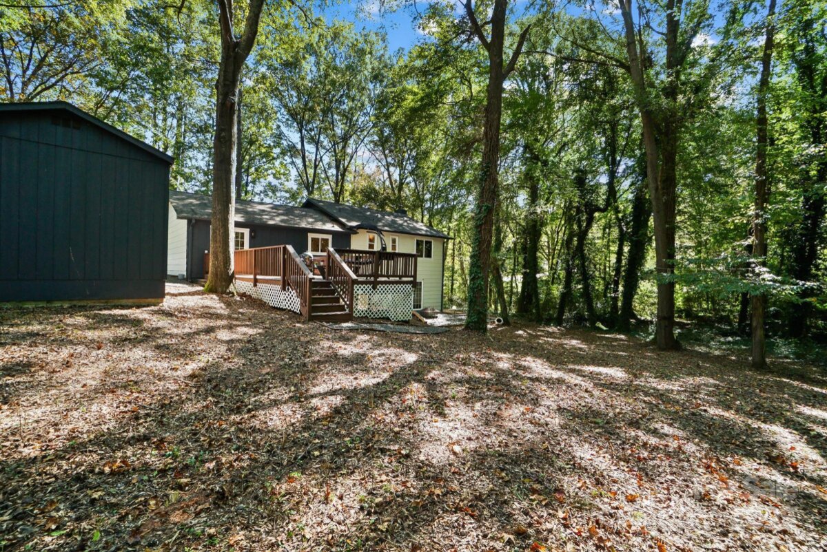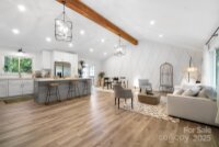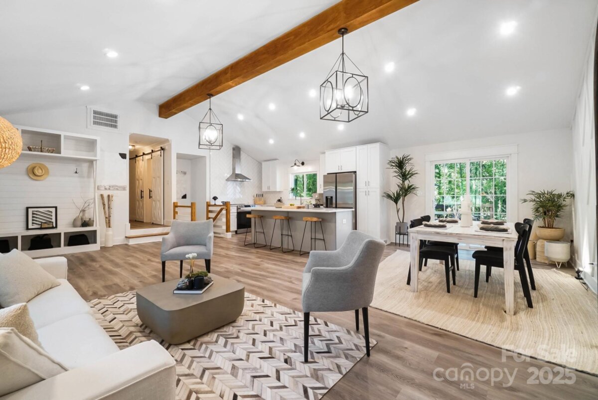 REDUCED $15k! This fully renovated home blends style, comfort, and functionality in every detail. Step inside to an open-concept layout highlighted by vaulted cathedral ceilings, exposed wood beams, designer lighting, and a stunning feature wall that creates architectural interest and warmth. The chef’s kitchen is the centerpiece of the home, showcasing quartz countertops, a large island with built-in microwave, stainless steel Samsung appliances, soft-close cabinetry, and a full herringbone tile backsplash. The dining and living areas flow effortlessly together and are ideal for entertaining or quiet evenings surrounded by natural light. Throughout the home, custom trim, shiplap accents, and sliding barn doors add character, while durable luxury vinyl plank flooring provides beauty and easy maintenance. The primary suite offers a peaceful retreat with a designer barn door, walk-in closet, and spa-inspired bath featuring modern vanity and fixtures, and a beautifully tiled shower surround. Two additional bedrooms or flex spaces complete the thoughtful layout. Additional highlights include a custom mudroom built-in, a spacious den on the lower level with a wood burning fireplace, upgraded lighting and hardware, and fresh paint throughout. Step through the sliding doors onto a spacious deck overlooking a wooded backdrop, perfect for morning coffee or evening gatherings around the fire-pit. You might even spot a few deer. Located close to shops and dining, Reedy Creek Park, UNCC, NODA, Plaza-Midwood and uptown Charlotte. This home offers the perfect blend of convenience, design, and serenity. Every finish has been carefully selected to create a space that feels both fresh and timeless. Welcome home.